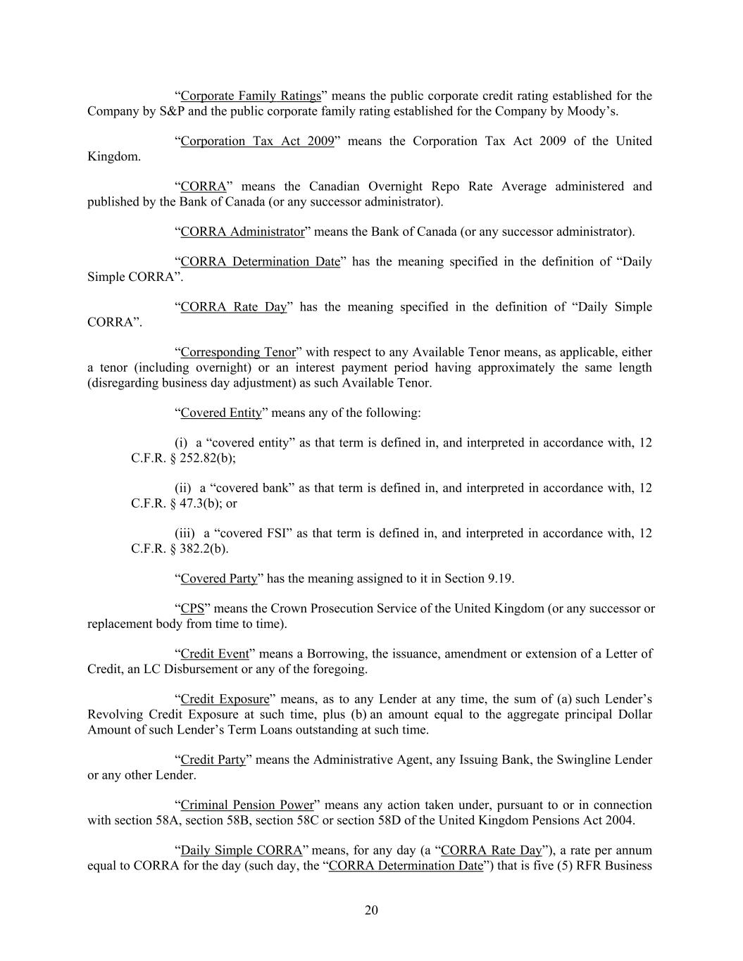 “Corporate Family Ratings” means the public corporate credit rating established for the Company by S&P and the public corporate family rating established for the Company by Moody’s. “Corporation Tax Act 2009” means the Corporation Tax Act 2009 of the United Kingdom. “CORRA” means the Canadian Overnight Repo Rate Average administered and published by the Bank of Canada (or any successor administrator). “CORRA Administrator” means the Bank of Canada (or any successor administrator). “CORRA Determination Date” has the meaning specified in the definition of “Daily Simple CORRA”. “CORRA Rate Day” has the meaning specified in the definition of “Daily Simple CORRA”. “Corresponding Tenor” with respect to any Available Tenor means, as applicable, either a tenor (including overnight) or an interest payment period having approximately the same length (disregarding business day adjustment) as such Available Tenor. “Covered Entity” means any of the following: (i) a “covered entity” as that term is defined in, and interpreted in accordance with, 12 C.F.R. § 252.82(b); (ii) a “covered bank” as that term is defined in, and interpreted in accordance with, 12 C.F.R. § 47.3(b); or (iii) a “covered FSI” as that term is defined in, and interpreted in accordance with, 12 C.F.R. § 382.2(b). “Covered Party” has the meaning assigned to it in Section 9.19. “CPS” means the Crown Prosecution Service of the United Kingdom (or any successor or replacement body from time to time). “Credit Event” means a Borrowing, the issuance, amendment or extension of a Letter of Credit, an LC Disbursement or any of the foregoing. “Credit Exposure” means, as to any Lender at any time, the sum of (a) such Lender’s Revolving Credit Exposure at such time, plus (b) an amount equal to the aggregate principal Dollar Amount of such Lender’s Term Loans outstanding at such time. “Credit Party” means the Administrative Agent, any Issuing Bank, the Swingline Lender or any other Lender. “Criminal Pension Power” means any action taken under, pursuant to or in connection with section 58A, section 58B, section 58C or section 58D of the United Kingdom Pensions Act 2004. “Daily Simple CORRA” means, for any day (a “CORRA Rate Day”), a rate per annum equal to CORRA for the day (such day, the “CORRA Determination Date”) that is five (5) RFR Business 20