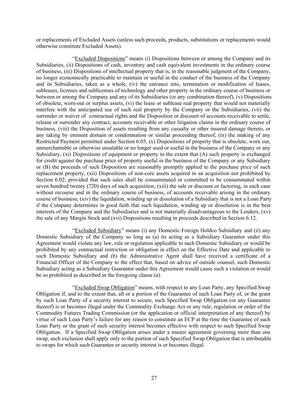 or replacements of Excluded Assets (unless such proceeds, products, substitutions or replacements would otherwise constitute Excluded Assets). “Excluded Dispositions” means (i) Dispositions between or among the Company and its Subsidiaries, (ii) Dispositions of cash, inventory and cash equivalent investments in the ordinary course of business, (iii) Dispositions of intellectual property that is, in the reasonable judgment of the Company, no longer economically practicable to maintain or useful in the conduct of the business of the Company and its Subsidiaries, taken as a whole, (iv) the entrance into, termination or modification of leases, subleases, licenses and sublicenses of technology and other property in the ordinary course of business or between or among the Company and any of its Subsidiaries (or any combination thereof), (v) Dispositions of obsolete, worn-out or surplus assets, (vi) the lease or sublease real property that would not materially interfere with the anticipated use of such real property by the Company or the Subsidiaries, (vii) the surrender or waiver of contractual rights and the Disposition or discount of accounts receivable to settle, release or surrender any contract, accounts receivable or other litigation claims in the ordinary course of business, (viii) the Disposition of assets resulting from any casualty or other insured damage thereto, or any taking by eminent domain or condemnation or similar proceeding thereof, (ix) the making of any Restricted Payment permitted under Section 6.05, (x) Dispositions of property that is obsolete, worn out, unmerchantable or otherwise unsalable or no longer used or useful in the business of the Company or any Subsidiary, (xi) Dispositions of equipment or property to the extent that (A) such property is exchanged for credit against the purchase price of property useful in the business of the Company or any Subsidiary or (B) the proceeds of such Disposition are reasonably promptly applied to the purchase price of such replacement property, (xii) Dispositions of non-core assets acquired in an acquisition not prohibited by Section 6.02; provided that such sales shall be consummated or committed to be consummated within seven hundred twenty (720) days of such acquisition; (xiii) the sale or discount or factoring, in each case without recourse and in the ordinary course of business, of accounts receivable arising in the ordinary course of business; (xiv) the liquidation, winding up or dissolution of a Subsidiary that is not a Loan Party if the Company determines in good faith that such liquidation, winding up or dissolution is in the best interests of the Company and the Subsidiaries and is not materially disadvantageous to the Lenders, (xv) the sale of any Margin Stock and (xvi) Dispositions resulting in proceeds described in Section 6.12. “Excluded Subsidiary” means (i) any Domestic Foreign Holdco Subsidiary and (ii) any Domestic Subsidiary of the Company so long as (a) its acting as a Subsidiary Guarantor under this Agreement would violate any law, rule or regulation applicable to such Domestic Subsidiary or would be prohibited by any contractual restriction or obligation in effect on the Effective Date and applicable to such Domestic Subsidiary and (b) the Administrative Agent shall have received a certificate of a Financial Officer of the Company to the effect that, based on advice of outside counsel, such Domestic Subsidiary acting as a Subsidiary Guarantor under this Agreement would cause such a violation or would be so prohibited as described in the foregoing clause (a). “Excluded Swap Obligation” means, with respect to any Loan Party, any Specified Swap Obligation if, and to the extent that, all or a portion of the Guarantee of such Loan Party of, or the grant by such Loan Party of a security interest to secure, such Specified Swap Obligation (or any Guarantee thereof) is or becomes illegal under the Commodity Exchange Act or any rule, regulation or order of the Commodity Futures Trading Commission (or the application or official interpretation of any thereof) by virtue of such Loan Party’s failure for any reason to constitute an ECP at the time the Guarantee of such Loan Party or the grant of such security interest becomes effective with respect to such Specified Swap Obligation. If a Specified Swap Obligation arises under a master agreement governing more than one swap, such exclusion shall apply only to the portion of such Specified Swap Obligation that is attributable to swaps for which such Guarantee or security interest is or becomes illegal. 27