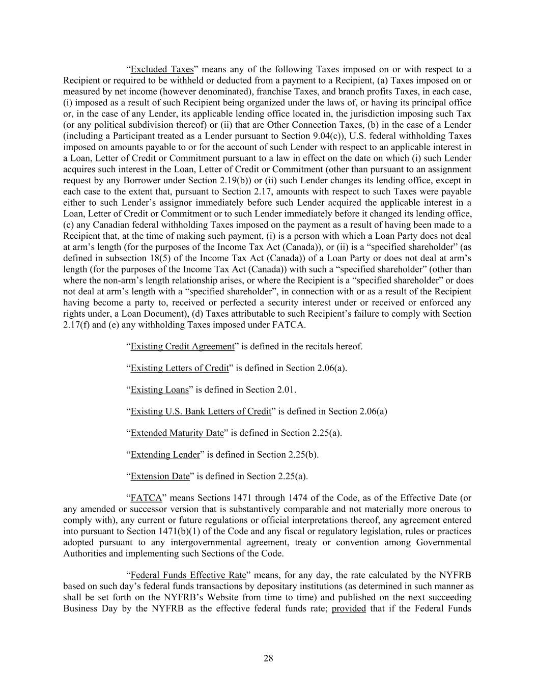 “Excluded Taxes” means any of the following Taxes imposed on or with respect to a Recipient or required to be withheld or deducted from a payment to a Recipient, (a) Taxes imposed on or measured by net income (however denominated), franchise Taxes, and branch profits Taxes, in each case, (i) imposed as a result of such Recipient being organized under the laws of, or having its principal office or, in the case of any Lender, its applicable lending office located in, the jurisdiction imposing such Tax (or any political subdivision thereof) or (ii) that are Other Connection Taxes, (b) in the case of a Lender (including a Participant treated as a Lender pursuant to Section 9.04(c)), U.S. federal withholding Taxes imposed on amounts payable to or for the account of such Lender with respect to an applicable interest in a Loan, Letter of Credit or Commitment pursuant to a law in effect on the date on which (i) such Lender acquires such interest in the Loan, Letter of Credit or Commitment (other than pursuant to an assignment request by any Borrower under Section 2.19(b)) or (ii) such Lender changes its lending office, except in each case to the extent that, pursuant to Section 2.17, amounts with respect to such Taxes were payable either to such Lender’s assignor immediately before such Lender acquired the applicable interest in a Loan, Letter of Credit or Commitment or to such Lender immediately before it changed its lending office, (c) any Canadian federal withholding Taxes imposed on the payment as a result of having been made to a Recipient that, at the time of making such payment, (i) is a person with which a Loan Party does not deal at arm’s length (for the purposes of the Income Tax Act (Canada)), or (ii) is a “specified shareholder” (as defined in subsection 18(5) of the Income Tax Act (Canada)) of a Loan Party or does not deal at arm’s length (for the purposes of the Income Tax Act (Canada)) with such a “specified shareholder” (other than where the non-arm’s length relationship arises, or where the Recipient is a “specified shareholder” or does not deal at arm’s length with a “specified shareholder”, in connection with or as a result of the Recipient having become a party to, received or perfected a security interest under or received or enforced any rights under, a Loan Document), (d) Taxes attributable to such Recipient’s failure to comply with Section 2.17(f) and (e) any withholding Taxes imposed under FATCA. “Existing Credit Agreement” is defined in the recitals hereof. “Existing Letters of Credit” is defined in Section 2.06(a). “Existing Loans” is defined in Section 2.01. “Existing U.S. Bank Letters of Credit” is defined in Section 2.06(a) “Extended Maturity Date” is defined in Section 2.25(a). “Extending Lender” is defined in Section 2.25(b). “Extension Date” is defined in Section 2.25(a). “FATCA” means Sections 1471 through 1474 of the Code, as of the Effective Date (or any amended or successor version that is substantively comparable and not materially more onerous to comply with), any current or future regulations or official interpretations thereof, any agreement entered into pursuant to Section 1471(b)(1) of the Code and any fiscal or regulatory legislation, rules or practices adopted pursuant to any intergovernmental agreement, treaty or convention among Governmental Authorities and implementing such Sections of the Code. “Federal Funds Effective Rate” means, for any day, the rate calculated by the NYFRB based on such day’s federal funds transactions by depositary institutions (as determined in such manner as shall be set forth on the NYFRB’s Website from time to time) and published on the next succeeding Business Day by the NYFRB as the effective federal funds rate; provided that if the Federal Funds 28