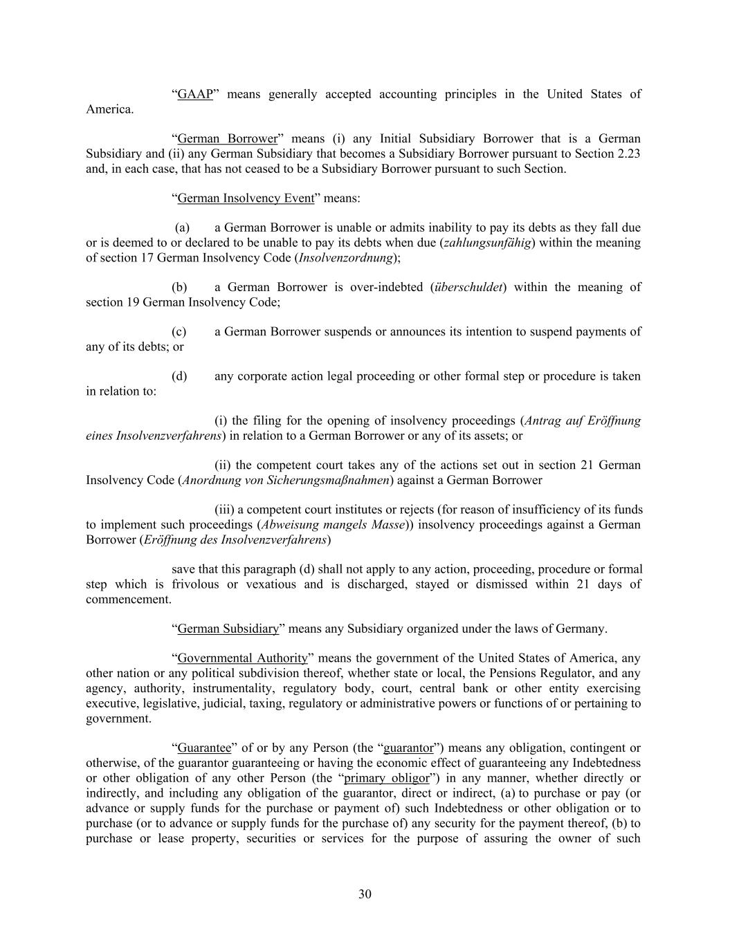 “GAAP” means generally accepted accounting principles in the United States of America. “German Borrower” means (i) any Initial Subsidiary Borrower that is a German Subsidiary and (ii) any German Subsidiary that becomes a Subsidiary Borrower pursuant to Section 2.23 and, in each case, that has not ceased to be a Subsidiary Borrower pursuant to such Section. “German Insolvency Event” means: (a) a German Borrower is unable or admits inability to pay its debts as they fall due or is deemed to or declared to be unable to pay its debts when due (zahlungsunfähig) within the meaning of section 17 German Insolvency Code (Insolvenzordnung); (b) a German Borrower is over-indebted (überschuldet) within the meaning of section 19 German Insolvency Code; (c) a German Borrower suspends or announces its intention to suspend payments of any of its debts; or (d) any corporate action legal proceeding or other formal step or procedure is taken in relation to: (i) the filing for the opening of insolvency proceedings (Antrag auf Eröffnung eines Insolvenzverfahrens) in relation to a German Borrower or any of its assets; or (ii) the competent court takes any of the actions set out in section 21 German Insolvency Code (Anordnung von Sicherungsmaßnahmen) against a German Borrower (iii) a competent court institutes or rejects (for reason of insufficiency of its funds to implement such proceedings (Abweisung mangels Masse)) insolvency proceedings against a German Borrower (Eröffnung des Insolvenzverfahrens) save that this paragraph (d) shall not apply to any action, proceeding, procedure or formal step which is frivolous or vexatious and is discharged, stayed or dismissed within 21 days of commencement. “German Subsidiary” means any Subsidiary organized under the laws of Germany. “Governmental Authority” means the government of the United States of America, any other nation or any political subdivision thereof, whether state or local, the Pensions Regulator, and any agency, authority, instrumentality, regulatory body, court, central bank or other entity exercising executive, legislative, judicial, taxing, regulatory or administrative powers or functions of or pertaining to government. “Guarantee” of or by any Person (the “guarantor”) means any obligation, contingent or otherwise, of the guarantor guaranteeing or having the economic effect of guaranteeing any Indebtedness or other obligation of any other Person (the “primary obligor”) in any manner, whether directly or indirectly, and including any obligation of the guarantor, direct or indirect, (a) to purchase or pay (or advance or supply funds for the purchase or payment of) such Indebtedness or other obligation or to purchase (or to advance or supply funds for the purchase of) any security for the payment thereof, (b) to purchase or lease property, securities or services for the purpose of assuring the owner of such 30