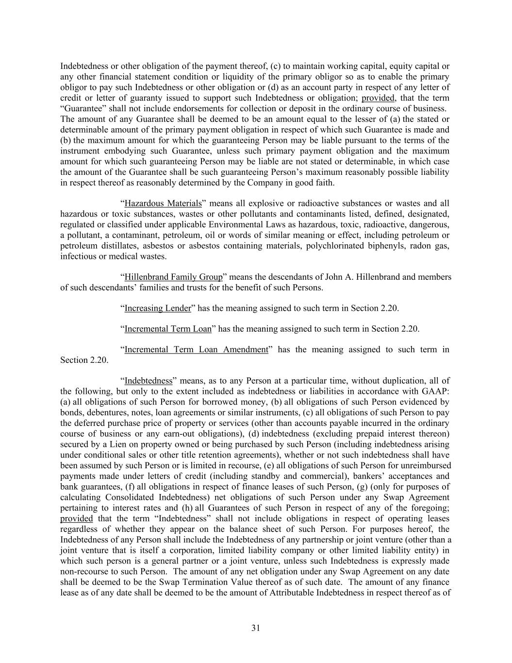 Indebtedness or other obligation of the payment thereof, (c) to maintain working capital, equity capital or any other financial statement condition or liquidity of the primary obligor so as to enable the primary obligor to pay such Indebtedness or other obligation or (d) as an account party in respect of any letter of credit or letter of guaranty issued to support such Indebtedness or obligation; provided, that the term “Guarantee” shall not include endorsements for collection or deposit in the ordinary course of business. The amount of any Guarantee shall be deemed to be an amount equal to the lesser of (a) the stated or determinable amount of the primary payment obligation in respect of which such Guarantee is made and (b) the maximum amount for which the guaranteeing Person may be liable pursuant to the terms of the instrument embodying such Guarantee, unless such primary payment obligation and the maximum amount for which such guaranteeing Person may be liable are not stated or determinable, in which case the amount of the Guarantee shall be such guaranteeing Person’s maximum reasonably possible liability in respect thereof as reasonably determined by the Company in good faith. “Hazardous Materials” means all explosive or radioactive substances or wastes and all hazardous or toxic substances, wastes or other pollutants and contaminants listed, defined, designated, regulated or classified under applicable Environmental Laws as hazardous, toxic, radioactive, dangerous, a pollutant, a contaminant, petroleum, oil or words of similar meaning or effect, including petroleum or petroleum distillates, asbestos or asbestos containing materials, polychlorinated biphenyls, radon gas, infectious or medical wastes. “Hillenbrand Family Group” means the descendants of John A. Hillenbrand and members of such descendants’ families and trusts for the benefit of such Persons. “Increasing Lender” has the meaning assigned to such term in Section 2.20. “Incremental Term Loan” has the meaning assigned to such term in Section 2.20. “Incremental Term Loan Amendment” has the meaning assigned to such term in Section 2.20. “Indebtedness” means, as to any Person at a particular time, without duplication, all of the following, but only to the extent included as indebtedness or liabilities in accordance with GAAP: (a) all obligations of such Person for borrowed money, (b) all obligations of such Person evidenced by bonds, debentures, notes, loan agreements or similar instruments, (c) all obligations of such Person to pay the deferred purchase price of property or services (other than accounts payable incurred in the ordinary course of business or any earn-out obligations), (d) indebtedness (excluding prepaid interest thereon) secured by a Lien on property owned or being purchased by such Person (including indebtedness arising under conditional sales or other title retention agreements), whether or not such indebtedness shall have been assumed by such Person or is limited in recourse, (e) all obligations of such Person for unreimbursed payments made under letters of credit (including standby and commercial), bankers’ acceptances and bank guarantees, (f) all obligations in respect of finance leases of such Person, (g) (only for purposes of calculating Consolidated Indebtedness) net obligations of such Person under any Swap Agreement pertaining to interest rates and (h) all Guarantees of such Person in respect of any of the foregoing; provided that the term “Indebtedness” shall not include obligations in respect of operating leases regardless of whether they appear on the balance sheet of such Person. For purposes hereof, the Indebtedness of any Person shall include the Indebtedness of any partnership or joint venture (other than a joint venture that is itself a corporation, limited liability company or other limited liability entity) in which such person is a general partner or a joint venture, unless such Indebtedness is expressly made non-recourse to such Person. The amount of any net obligation under any Swap Agreement on any date shall be deemed to be the Swap Termination Value thereof as of such date. The amount of any finance lease as of any date shall be deemed to be the amount of Attributable Indebtedness in respect thereof as of 31
