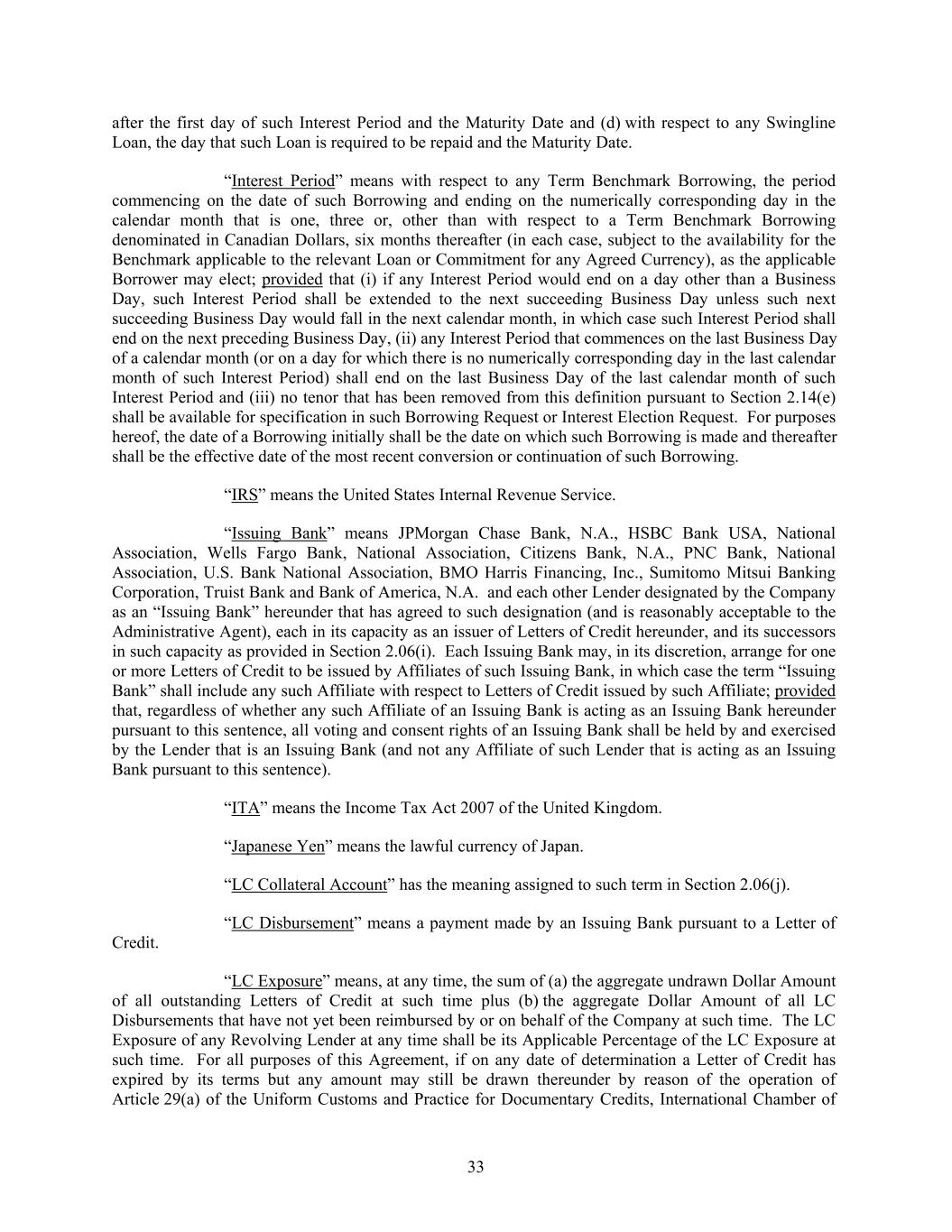 after the first day of such Interest Period and the Maturity Date and (d) with respect to any Swingline Loan, the day that such Loan is required to be repaid and the Maturity Date. “Interest Period” means with respect to any Term Benchmark Borrowing, the period commencing on the date of such Borrowing and ending on the numerically corresponding day in the calendar month that is one, three or, other than with respect to a Term Benchmark Borrowing denominated in Canadian Dollars, six months thereafter (in each case, subject to the availability for the Benchmark applicable to the relevant Loan or Commitment for any Agreed Currency), as the applicable Borrower may elect; provided that (i) if any Interest Period would end on a day other than a Business Day, such Interest Period shall be extended to the next succeeding Business Day unless such next succeeding Business Day would fall in the next calendar month, in which case such Interest Period shall end on the next preceding Business Day, (ii) any Interest Period that commences on the last Business Day of a calendar month (or on a day for which there is no numerically corresponding day in the last calendar month of such Interest Period) shall end on the last Business Day of the last calendar month of such Interest Period and (iii) no tenor that has been removed from this definition pursuant to Section 2.14(e) shall be available for specification in such Borrowing Request or Interest Election Request. For purposes hereof, the date of a Borrowing initially shall be the date on which such Borrowing is made and thereafter shall be the effective date of the most recent conversion or continuation of such Borrowing. “IRS” means the United States Internal Revenue Service. “Issuing Bank” means JPMorgan Chase Bank, N.A., HSBC Bank USA, National Association, Wells Fargo Bank, National Association, Citizens Bank, N.A., PNC Bank, National Association, U.S. Bank National Association, BMO Harris Financing, Inc., Sumitomo Mitsui Banking Corporation, Truist Bank and Bank of America, N.A. and each other Lender designated by the Company as an “Issuing Bank” hereunder that has agreed to such designation (and is reasonably acceptable to the Administrative Agent), each in its capacity as an issuer of Letters of Credit hereunder, and its successors in such capacity as provided in Section 2.06(i). Each Issuing Bank may, in its discretion, arrange for one or more Letters of Credit to be issued by Affiliates of such Issuing Bank, in which case the term “Issuing Bank” shall include any such Affiliate with respect to Letters of Credit issued by such Affiliate; provided that, regardless of whether any such Affiliate of an Issuing Bank is acting as an Issuing Bank hereunder pursuant to this sentence, all voting and consent rights of an Issuing Bank shall be held by and exercised by the Lender that is an Issuing Bank (and not any Affiliate of such Lender that is acting as an Issuing Bank pursuant to this sentence). “ITA” means the Income Tax Act 2007 of the United Kingdom. “Japanese Yen” means the lawful currency of Japan. “LC Collateral Account” has the meaning assigned to such term in Section 2.06(j). “LC Disbursement” means a payment made by an Issuing Bank pursuant to a Letter of Credit. “LC Exposure” means, at any time, the sum of (a) the aggregate undrawn Dollar Amount of all outstanding Letters of Credit at such time plus (b) the aggregate Dollar Amount of all LC Disbursements that have not yet been reimbursed by or on behalf of the Company at such time. The LC Exposure of any Revolving Lender at any time shall be its Applicable Percentage of the LC Exposure at such time. For all purposes of this Agreement, if on any date of determination a Letter of Credit has expired by its terms but any amount may still be drawn thereunder by reason of the operation of Article 29(a) of the Uniform Customs and Practice for Documentary Credits, International Chamber of 33