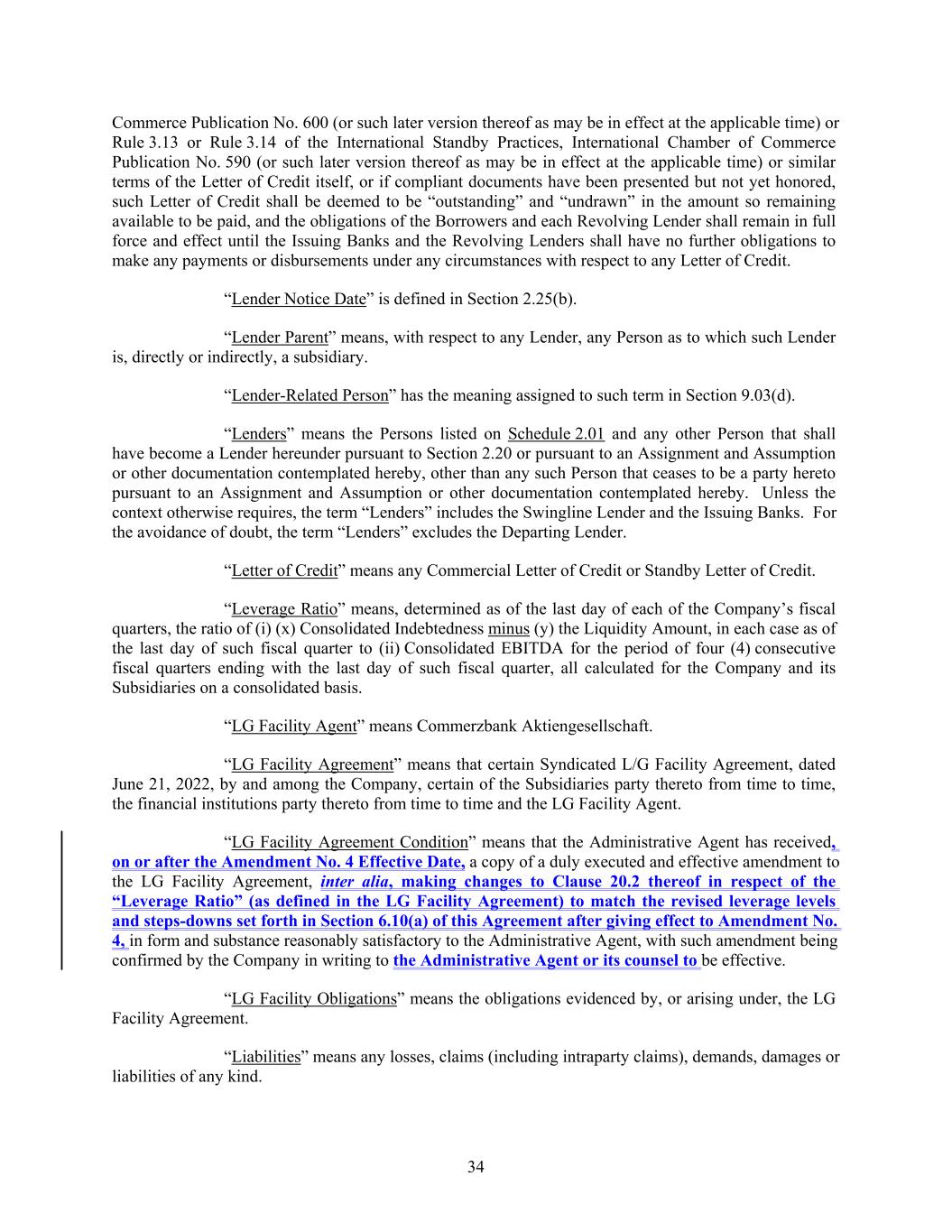 Commerce Publication No. 600 (or such later version thereof as may be in effect at the applicable time) or Rule 3.13 or Rule 3.14 of the International Standby Practices, International Chamber of Commerce Publication No. 590 (or such later version thereof as may be in effect at the applicable time) or similar terms of the Letter of Credit itself, or if compliant documents have been presented but not yet honored, such Letter of Credit shall be deemed to be “outstanding” and “undrawn” in the amount so remaining available to be paid, and the obligations of the Borrowers and each Revolving Lender shall remain in full force and effect until the Issuing Banks and the Revolving Lenders shall have no further obligations to make any payments or disbursements under any circumstances with respect to any Letter of Credit. “Lender Notice Date” is defined in Section 2.25(b). “Lender Parent” means, with respect to any Lender, any Person as to which such Lender is, directly or indirectly, a subsidiary. “Lender-Related Person” has the meaning assigned to such term in Section 9.03(d). “Lenders” means the Persons listed on Schedule 2.01 and any other Person that shall have become a Lender hereunder pursuant to Section 2.20 or pursuant to an Assignment and Assumption or other documentation contemplated hereby, other than any such Person that ceases to be a party hereto pursuant to an Assignment and Assumption or other documentation contemplated hereby. Unless the context otherwise requires, the term “Lenders” includes the Swingline Lender and the Issuing Banks. For the avoidance of doubt, the term “Lenders” excludes the Departing Lender. “Letter of Credit” means any Commercial Letter of Credit or Standby Letter of Credit. “Leverage Ratio” means, determined as of the last day of each of the Company’s fiscal quarters, the ratio of (i) (x) Consolidated Indebtedness minus (y) the Liquidity Amount, in each case as of the last day of such fiscal quarter to (ii) Consolidated EBITDA for the period of four (4) consecutive fiscal quarters ending with the last day of such fiscal quarter, all calculated for the Company and its Subsidiaries on a consolidated basis. “LG Facility Agent” means Commerzbank Aktiengesellschaft. “LG Facility Agreement” means that certain Syndicated L/G Facility Agreement, dated June 21, 2022, by and among the Company, certain of the Subsidiaries party thereto from time to time, the financial institutions party thereto from time to time and the LG Facility Agent. “LG Facility Agreement Condition” means that the Administrative Agent has received, on or after the Amendment No. 4 Effective Date, a copy of a duly executed and effective amendment to the LG Facility Agreement, inter alia, making changes to Clause 20.2 thereof in respect of the “Leverage Ratio” (as defined in the LG Facility Agreement) to match the revised leverage levels and steps-downs set forth in Section 6.10(a) of this Agreement after giving effect to Amendment No. 4, in form and substance reasonably satisfactory to the Administrative Agent, with such amendment being confirmed by the Company in writing to the Administrative Agent or its counsel to be effective. “LG Facility Obligations” means the obligations evidenced by, or arising under, the LG Facility Agreement. “Liabilities” means any losses, claims (including intraparty claims), demands, damages or liabilities of any kind. 34