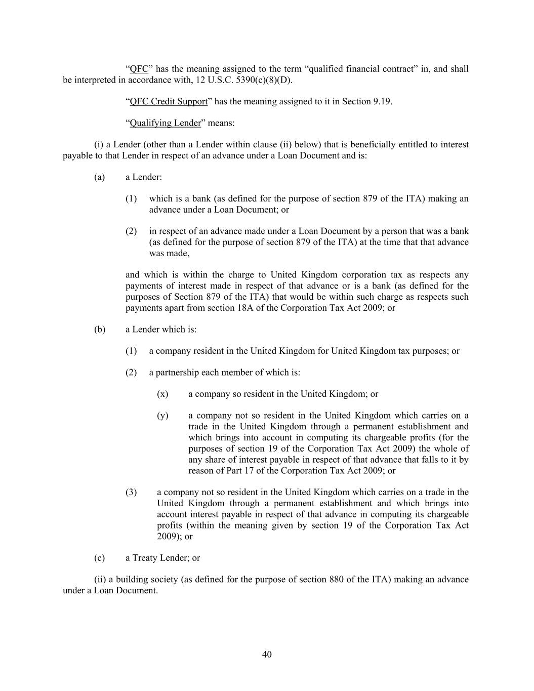 “QFC” has the meaning assigned to the term “qualified financial contract” in, and shall be interpreted in accordance with, 12 U.S.C. 5390(c)(8)(D). “QFC Credit Support” has the meaning assigned to it in Section 9.19. “Qualifying Lender” means: (i) a Lender (other than a Lender within clause (ii) below) that is beneficially entitled to interest payable to that Lender in respect of an advance under a Loan Document and is: (a) a Lender: (1) which is a bank (as defined for the purpose of section 879 of the ITA) making an advance under a Loan Document; or (2) in respect of an advance made under a Loan Document by a person that was a bank (as defined for the purpose of section 879 of the ITA) at the time that that advance was made, and which is within the charge to United Kingdom corporation tax as respects any payments of interest made in respect of that advance or is a bank (as defined for the purposes of Section 879 of the ITA) that would be within such charge as respects such payments apart from section 18A of the Corporation Tax Act 2009; or (b) a Lender which is: (1) a company resident in the United Kingdom for United Kingdom tax purposes; or (2) a partnership each member of which is: (x) a company so resident in the United Kingdom; or (y) a company not so resident in the United Kingdom which carries on a trade in the United Kingdom through a permanent establishment and which brings into account in computing its chargeable profits (for the purposes of section 19 of the Corporation Tax Act 2009) the whole of any share of interest payable in respect of that advance that falls to it by reason of Part 17 of the Corporation Tax Act 2009; or (3) a company not so resident in the United Kingdom which carries on a trade in the United Kingdom through a permanent establishment and which brings into account interest payable in respect of that advance in computing its chargeable profits (within the meaning given by section 19 of the Corporation Tax Act 2009); or (c) a Treaty Lender; or (ii) a building society (as defined for the purpose of section 880 of the ITA) making an advance under a Loan Document. 40