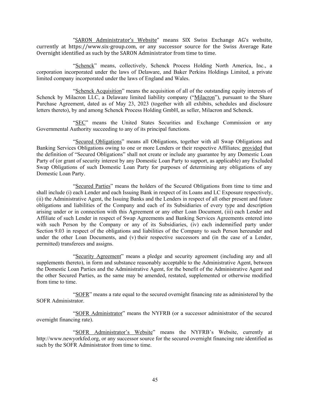 “SARON Administrator’s Website” means SIX Swiss Exchange AG’s website,currently at https://www.six-group.com, or any successor source for the Swiss Average RateOvernight identified as such by the SARON Administrator from time to time. “Schenck” means, collectively, Schenck Process Holding North America, Inc., a corporation incorporated under the laws of Delaware, and Baker Perkins Holdings Limited, a private limited company incorporated under the laws of England and Wales. “Schenck Acquisition” means the acquisition of all of the outstanding equity interests of Schenck by Milacron LLC, a Delaware limited liability company (“Milacron”), pursuant to the Share Purchase Agreement, dated as of May 23, 2023 (together with all exhibits, schedules and disclosure letters thereto), by and among Schenck Process Holding GmbH, as seller, Milacron and Schenck. “SEC” means the United States Securities and Exchange Commission or any Governmental Authority succeeding to any of its principal functions. “Secured Obligations” means all Obligations, together with all Swap Obligations and Banking Services Obligations owing to one or more Lenders or their respective Affiliates; provided that the definition of “Secured Obligations” shall not create or include any guarantee by any Domestic Loan Party of (or grant of security interest by any Domestic Loan Party to support, as applicable) any Excluded Swap Obligations of such Domestic Loan Party for purposes of determining any obligations of any Domestic Loan Party. “Secured Parties” means the holders of the Secured Obligations from time to time and shall include (i) each Lender and each Issuing Bank in respect of its Loans and LC Exposure respectively, (ii) the Administrative Agent, the Issuing Banks and the Lenders in respect of all other present and future obligations and liabilities of the Company and each of its Subsidiaries of every type and description arising under or in connection with this Agreement or any other Loan Document, (iii) each Lender and Affiliate of such Lender in respect of Swap Agreements and Banking Services Agreements entered into with such Person by the Company or any of its Subsidiaries, (iv) each indemnified party under Section 9.03 in respect of the obligations and liabilities of the Company to such Person hereunder and under the other Loan Documents, and (v) their respective successors and (in the case of a Lender, permitted) transferees and assigns. “Security Agreement” means a pledge and security agreement (including any and all supplements thereto), in form and substance reasonably acceptable to the Administrative Agent, between the Domestic Loan Parties and the Administrative Agent, for the benefit of the Administrative Agent and the other Secured Parties, as the same may be amended, restated, supplemented or otherwise modified from time to time. “SOFR” means a rate equal to the secured overnight financing rate as administered by the SOFR Administrator. “SOFR Administrator” means the NYFRB (or a successor administrator of the secured overnight financing rate). “SOFR Administrator’s Website” means the NYFRB’s Website, currently at http://www.newyorkfed.org, or any successor source for the secured overnight financing rate identified as such by the SOFR Administrator from time to time. 45