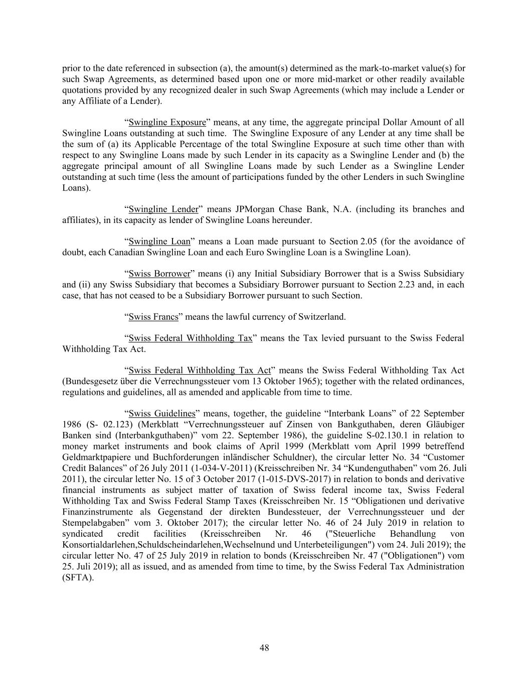 prior to the date referenced in subsection (a), the amount(s) determined as the mark-to-market value(s) for such Swap Agreements, as determined based upon one or more mid-market or other readily available quotations provided by any recognized dealer in such Swap Agreements (which may include a Lender or any Affiliate of a Lender). “Swingline Exposure” means, at any time, the aggregate principal Dollar Amount of all Swingline Loans outstanding at such time. The Swingline Exposure of any Lender at any time shall be the sum of (a) its Applicable Percentage of the total Swingline Exposure at such time other than with respect to any Swingline Loans made by such Lender in its capacity as a Swingline Lender and (b) the aggregate principal amount of all Swingline Loans made by such Lender as a Swingline Lender outstanding at such time (less the amount of participations funded by the other Lenders in such Swingline Loans). “Swingline Lender” means JPMorgan Chase Bank, N.A. (including its branches and affiliates), in its capacity as lender of Swingline Loans hereunder. “Swingline Loan” means a Loan made pursuant to Section 2.05 (for the avoidance of doubt, each Canadian Swingline Loan and each Euro Swingline Loan is a Swingline Loan). “Swiss Borrower” means (i) any Initial Subsidiary Borrower that is a Swiss Subsidiary and (ii) any Swiss Subsidiary that becomes a Subsidiary Borrower pursuant to Section 2.23 and, in each case, that has not ceased to be a Subsidiary Borrower pursuant to such Section. “Swiss Francs” means the lawful currency of Switzerland. “Swiss Federal Withholding Tax” means the Tax levied pursuant to the Swiss Federal Withholding Tax Act. “Swiss Federal Withholding Tax Act” means the Swiss Federal Withholding Tax Act (Bundesgesetz über die Verrechnungssteuer vom 13 Oktober 1965); together with the related ordinances, regulations and guidelines, all as amended and applicable from time to time. “Swiss Guidelines” means, together, the guideline “Interbank Loans” of 22 September 1986 (S- 02.123) (Merkblatt “Verrechnungssteuer auf Zinsen von Bankguthaben, deren Gläubiger Banken sind (Interbankguthaben)” vom 22. September 1986), the guideline S-02.130.1 in relation to money market instruments and book claims of April 1999 (Merkblatt vom April 1999 betreffend Geldmarktpapiere und Buchforderungen inländischer Schuldner), the circular letter No. 34 “Customer Credit Balances” of 26 July 2011 (1-034-V-2011) (Kreisschreiben Nr. 34 “Kundenguthaben” vom 26. Juli 2011), the circular letter No. 15 of 3 October 2017 (1-015-DVS-2017) in relation to bonds and derivative financial instruments as subject matter of taxation of Swiss federal income tax, Swiss Federal Withholding Tax and Swiss Federal Stamp Taxes (Kreisschreiben Nr. 15 “Obligationen und derivative Finanzinstrumente als Gegenstand der direkten Bundessteuer, der Verrechnungssteuer und der Stempelabgaben” vom 3. Oktober 2017); the circular letter No. 46 of 24 July 2019 in relation to syndicated credit facilities (Kreisschreiben Nr. 46 ("Steuerliche Behandlung von Konsortialdarlehen,Schuldscheindarlehen,Wechselnund und Unterbeteiligungen") vom 24. Juli 2019); the circular letter No. 47 of 25 July 2019 in relation to bonds (Kreisschreiben Nr. 47 ("Obligationen") vom 25. Juli 2019); all as issued, and as amended from time to time, by the Swiss Federal Tax Administration (SFTA). 48