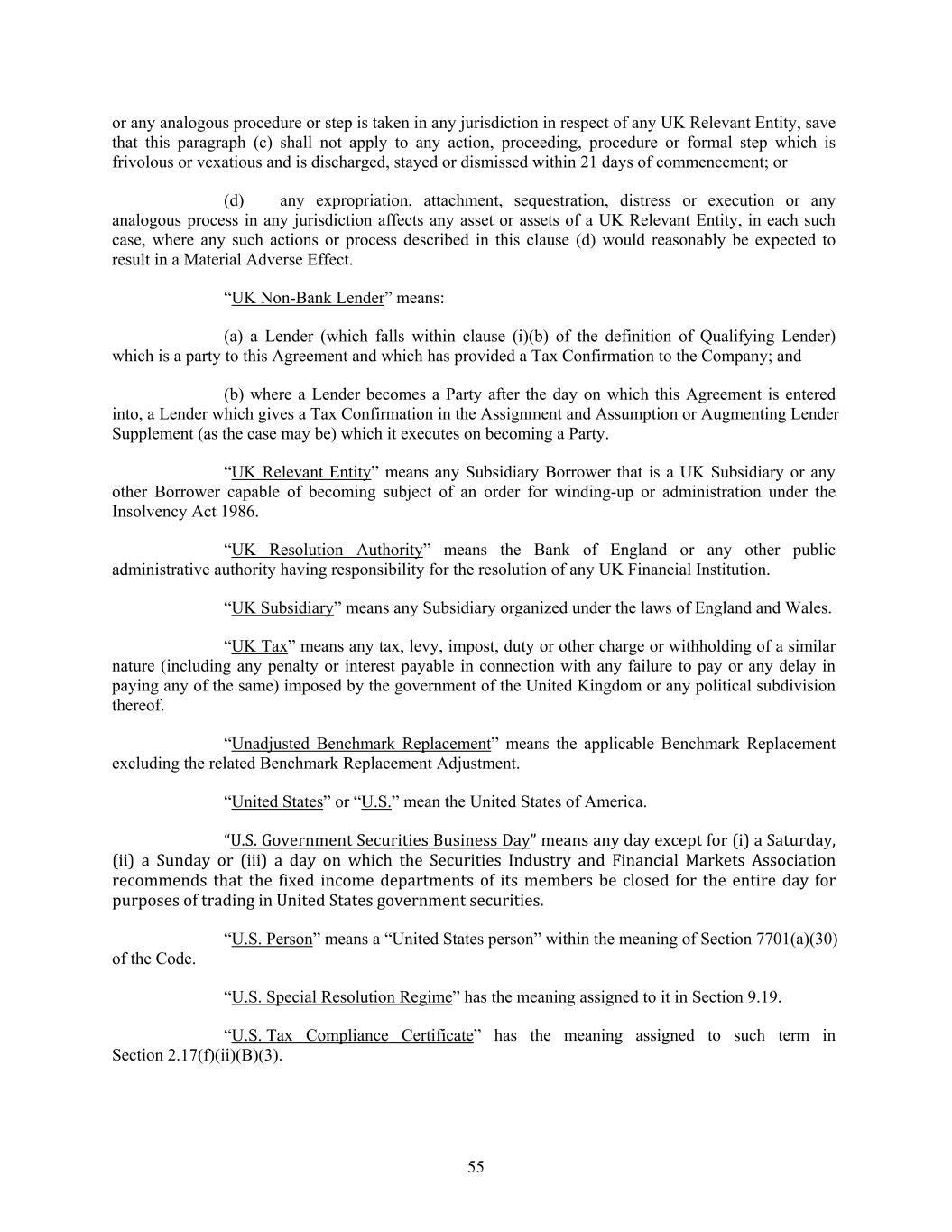 or any analogous procedure or step is taken in any jurisdiction in respect of any UK Relevant Entity, save that this paragraph (c) shall not apply to any action, proceeding, procedure or formal step which is frivolous or vexatious and is discharged, stayed or dismissed within 21 days of commencement; or (d) any expropriation, attachment, sequestration, distress or execution or any analogous process in any jurisdiction affects any asset or assets of a UK Relevant Entity, in each such case, where any such actions or process described in this clause (d) would reasonably be expected to result in a Material Adverse Effect. “UK Non-Bank Lender” means: (a) a Lender (which falls within clause (i)(b) of the definition of Qualifying Lender) which is a party to this Agreement and which has provided a Tax Confirmation to the Company; and (b) where a Lender becomes a Party after the day on which this Agreement is entered into, a Lender which gives a Tax Confirmation in the Assignment and Assumption or Augmenting Lender Supplement (as the case may be) which it executes on becoming a Party. “UK Relevant Entity” means any Subsidiary Borrower that is a UK Subsidiary or any other Borrower capable of becoming subject of an order for winding-up or administration under the Insolvency Act 1986. “UK Resolution Authority” means the Bank of England or any other public administrative authority having responsibility for the resolution of any UK Financial Institution. “UK Subsidiary” means any Subsidiary organized under the laws of England and Wales. “UK Tax” means any tax, levy, impost, duty or other charge or withholding of a similar nature (including any penalty or interest payable in connection with any failure to pay or any delay in paying any of the same) imposed by the government of the United Kingdom or any political subdivision thereof. “Unadjusted Benchmark Replacement” means the applicable Benchmark Replacement excluding the related Benchmark Replacement Adjustment. “United States” or “U.S.” mean the United States of America.“U.S. Government Securities Business Day” means any day except for (i) a Saturday,(ii) a Sunday or (iii) a day on which the Securities Industry and Financial Markets Associationrecommends that the fixed income departments of its members be closed for the entire day forpurposes of trading in United States government securities. “U.S. Person” means a “United States person” within the meaning of Section 7701(a)(30) of the Code. “U.S. Special Resolution Regime” has the meaning assigned to it in Section 9.19. “U.S. Tax Compliance Certificate” has the meaning assigned to such term in Section 2.17(f)(ii)(B)(3). 55