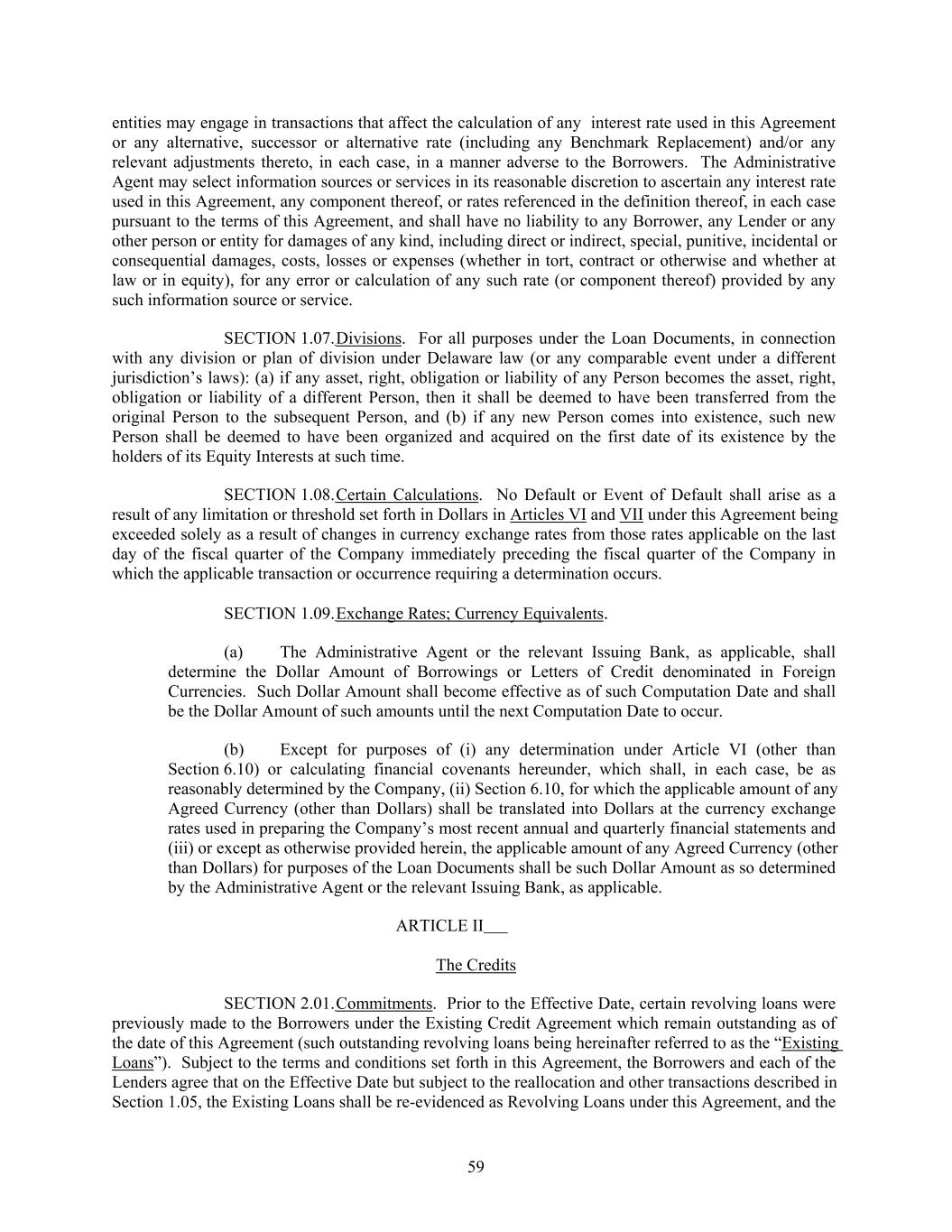 entities may engage in transactions that affect the calculation of any interest rate used in this Agreement or any alternative, successor or alternative rate (including any Benchmark Replacement) and/or any relevant adjustments thereto, in each case, in a manner adverse to the Borrowers. The Administrative Agent may select information sources or services in its reasonable discretion to ascertain any interest rate used in this Agreement, any component thereof, or rates referenced in the definition thereof, in each case pursuant to the terms of this Agreement, and shall have no liability to any Borrower, any Lender or any other person or entity for damages of any kind, including direct or indirect, special, punitive, incidental or consequential damages, costs, losses or expenses (whether in tort, contract or otherwise and whether at law or in equity), for any error or calculation of any such rate (or component thereof) provided by any such information source or service. SECTION 1.07.Divisions. For all purposes under the Loan Documents, in connection with any division or plan of division under Delaware law (or any comparable event under a different jurisdiction’s laws): (a) if any asset, right, obligation or liability of any Person becomes the asset, right, obligation or liability of a different Person, then it shall be deemed to have been transferred from the original Person to the subsequent Person, and (b) if any new Person comes into existence, such new Person shall be deemed to have been organized and acquired on the first date of its existence by the holders of its Equity Interests at such time. SECTION 1.08.Certain Calculations. No Default or Event of Default shall arise as a result of any limitation or threshold set forth in Dollars in Articles VI and VII under this Agreement being exceeded solely as a result of changes in currency exchange rates from those rates applicable on the last day of the fiscal quarter of the Company immediately preceding the fiscal quarter of the Company in which the applicable transaction or occurrence requiring a determination occurs. SECTION 1.09.Exchange Rates; Currency Equivalents. (a) The Administrative Agent or the relevant Issuing Bank, as applicable, shall determine the Dollar Amount of Borrowings or Letters of Credit denominated in Foreign Currencies. Such Dollar Amount shall become effective as of such Computation Date and shall be the Dollar Amount of such amounts until the next Computation Date to occur. (b) Except for purposes of (i) any determination under Article VI (other than Section 6.10) or calculating financial covenants hereunder, which shall, in each case, be as reasonably determined by the Company, (ii) Section 6.10, for which the applicable amount of any Agreed Currency (other than Dollars) shall be translated into Dollars at the currency exchange rates used in preparing the Company’s most recent annual and quarterly financial statements and (iii) or except as otherwise provided herein, the applicable amount of any Agreed Currency (other than Dollars) for purposes of the Loan Documents shall be such Dollar Amount as so determined by the Administrative Agent or the relevant Issuing Bank, as applicable. ARTICLE II The Credits SECTION 2.01.Commitments. Prior to the Effective Date, certain revolving loans were previously made to the Borrowers under the Existing Credit Agreement which remain outstanding as of the date of this Agreement (such outstanding revolving loans being hereinafter referred to as the “Existing Loans”). Subject to the terms and conditions set forth in this Agreement, the Borrowers and each of the Lenders agree that on the Effective Date but subject to the reallocation and other transactions described in Section 1.05, the Existing Loans shall be re-evidenced as Revolving Loans under this Agreement, and the 59