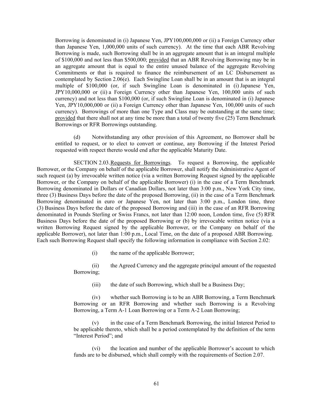 Borrowing is denominated in (i) Japanese Yen, JPY100,000,000 or (ii) a Foreign Currency other than Japanese Yen, 1,000,000 units of such currency). At the time that each ABR Revolving Borrowing is made, such Borrowing shall be in an aggregate amount that is an integral multiple of $100,000 and not less than $500,000; provided that an ABR Revolving Borrowing may be in an aggregate amount that is equal to the entire unused balance of the aggregate Revolving Commitments or that is required to finance the reimbursement of an LC Disbursement as contemplated by Section 2.06(e). Each Swingline Loan shall be in an amount that is an integral multiple of $100,000 (or, if such Swingline Loan is denominated in (i) Japanese Yen, JPY10,000,000 or (ii) a Foreign Currency other than Japanese Yen, 100,000 units of such currency) and not less than $100,000 (or, if such Swingline Loan is denominated in (i) Japanese Yen, JPY10,000,000 or (ii) a Foreign Currency other than Japanese Yen, 100,000 units of such currency). Borrowings of more than one Type and Class may be outstanding at the same time; provided that there shall not at any time be more than a total of twenty five (25) Term Benchmark Borrowings or RFR Borrowings outstanding. (d) Notwithstanding any other provision of this Agreement, no Borrower shall be entitled to request, or to elect to convert or continue, any Borrowing if the Interest Period requested with respect thereto would end after the applicable Maturity Date. SECTION 2.03.Requests for Borrowings. To request a Borrowing, the applicable Borrower, or the Company on behalf of the applicable Borrower, shall notify the Administrative Agent of such request (a) by irrevocable written notice (via a written Borrowing Request signed by the applicable Borrower, or the Company on behalf of the applicable Borrower) (i) in the case of a Term Benchmark Borrowing denominated in Dollars or Canadian Dollars, not later than 3:00 p.m., New York City time, three (3) Business Days before the date of the proposed Borrowing, (ii) in the case of a Term Benchmark Borrowing denominated in euro or Japanese Yen, not later than 3:00 p.m., London time, three (3) Business Days before the date of the proposed Borrowing and (iii) in the case of an RFR Borrowing denominated in Pounds Sterling or Swiss Francs, not later than 12:00 noon, London time, five (5) RFR Business Days before the date of the proposed Borrowing or (b) by irrevocable written notice (via a written Borrowing Request signed by the applicable Borrower, or the Company on behalf of the applicable Borrower), not later than 1:00 p.m., Local Time, on the date of a proposed ABR Borrowing. Each such Borrowing Request shall specify the following information in compliance with Section 2.02: (i) the name of the applicable Borrower; (ii) the Agreed Currency and the aggregate principal amount of the requested Borrowing; (iii) the date of such Borrowing, which shall be a Business Day; (iv) whether such Borrowing is to be an ABR Borrowing, a Term Benchmark Borrowing or an RFR Borrowing and whether such Borrowing is a Revolving Borrowing, a Term A-1 Loan Borrowing or a Term A-2 Loan Borrowing; (v) in the case of a Term Benchmark Borrowing, the initial Interest Period to be applicable thereto, which shall be a period contemplated by the definition of the term “Interest Period”; and (vi) the location and number of the applicable Borrower’s account to which funds are to be disbursed, which shall comply with the requirements of Section 2.07. 61