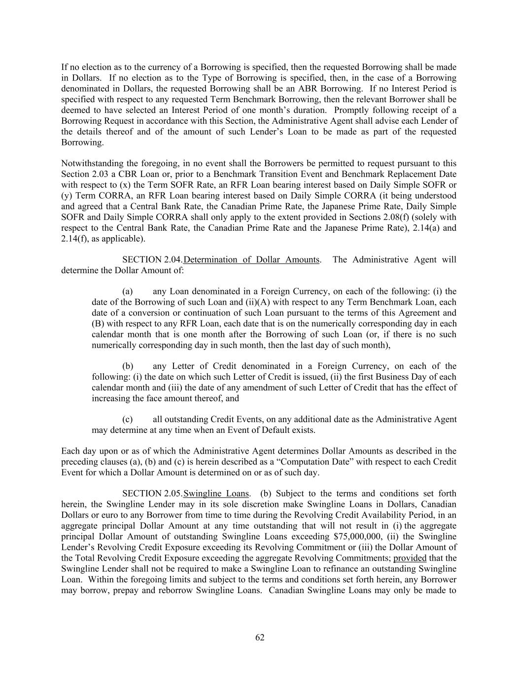 If no election as to the currency of a Borrowing is specified, then the requested Borrowing shall be made in Dollars. If no election as to the Type of Borrowing is specified, then, in the case of a Borrowing denominated in Dollars, the requested Borrowing shall be an ABR Borrowing. If no Interest Period is specified with respect to any requested Term Benchmark Borrowing, then the relevant Borrower shall be deemed to have selected an Interest Period of one month’s duration. Promptly following receipt of a Borrowing Request in accordance with this Section, the Administrative Agent shall advise each Lender of the details thereof and of the amount of such Lender’s Loan to be made as part of the requested Borrowing. Notwithstanding the foregoing, in no event shall the Borrowers be permitted to request pursuant to this Section 2.03 a CBR Loan or, prior to a Benchmark Transition Event and Benchmark Replacement Date with respect to (x) the Term SOFR Rate, an RFR Loan bearing interest based on Daily Simple SOFR or (y) Term CORRA, an RFR Loan bearing interest based on Daily Simple CORRA (it being understood and agreed that a Central Bank Rate, the Canadian Prime Rate, the Japanese Prime Rate, Daily Simple SOFR and Daily Simple CORRA shall only apply to the extent provided in Sections 2.08(f) (solely with respect to the Central Bank Rate, the Canadian Prime Rate and the Japanese Prime Rate), 2.14(a) and 2.14(f), as applicable). SECTION 2.04.Determination of Dollar Amounts. The Administrative Agent will determine the Dollar Amount of: (a) any Loan denominated in a Foreign Currency, on each of the following: (i) the date of the Borrowing of such Loan and (ii)(A) with respect to any Term Benchmark Loan, each date of a conversion or continuation of such Loan pursuant to the terms of this Agreement and (B) with respect to any RFR Loan, each date that is on the numerically corresponding day in each calendar month that is one month after the Borrowing of such Loan (or, if there is no such numerically corresponding day in such month, then the last day of such month), (b) any Letter of Credit denominated in a Foreign Currency, on each of the following: (i) the date on which such Letter of Credit is issued, (ii) the first Business Day of each calendar month and (iii) the date of any amendment of such Letter of Credit that has the effect of increasing the face amount thereof, and (c) all outstanding Credit Events, on any additional date as the Administrative Agent may determine at any time when an Event of Default exists. Each day upon or as of which the Administrative Agent determines Dollar Amounts as described in the preceding clauses (a), (b) and (c) is herein described as a “Computation Date” with respect to each Credit Event for which a Dollar Amount is determined on or as of such day. SECTION 2.05.Swingline Loans. (b) Subject to the terms and conditions set forth herein, the Swingline Lender may in its sole discretion make Swingline Loans in Dollars, Canadian Dollars or euro to any Borrower from time to time during the Revolving Credit Availability Period, in an aggregate principal Dollar Amount at any time outstanding that will not result in (i) the aggregate principal Dollar Amount of outstanding Swingline Loans exceeding $75,000,000, (ii) the Swingline Lender’s Revolving Credit Exposure exceeding its Revolving Commitment or (iii) the Dollar Amount of the Total Revolving Credit Exposure exceeding the aggregate Revolving Commitments; provided that the Swingline Lender shall not be required to make a Swingline Loan to refinance an outstanding Swingline Loan. Within the foregoing limits and subject to the terms and conditions set forth herein, any Borrower may borrow, prepay and reborrow Swingline Loans. Canadian Swingline Loans may only be made to 62