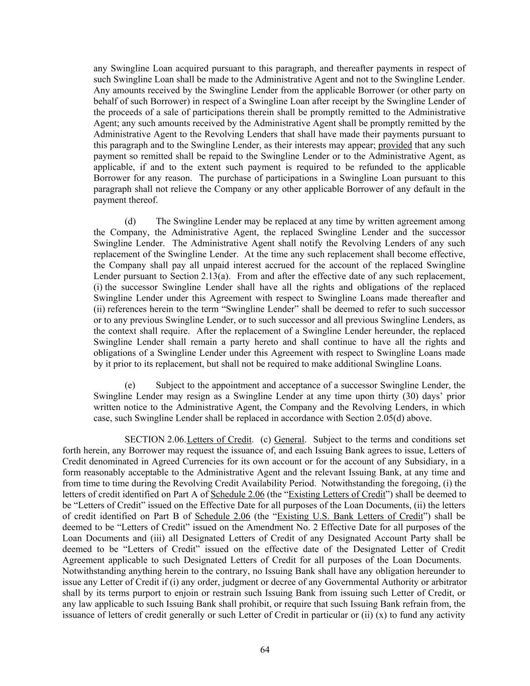 any Swingline Loan acquired pursuant to this paragraph, and thereafter payments in respect of such Swingline Loan shall be made to the Administrative Agent and not to the Swingline Lender. Any amounts received by the Swingline Lender from the applicable Borrower (or other party on behalf of such Borrower) in respect of a Swingline Loan after receipt by the Swingline Lender of the proceeds of a sale of participations therein shall be promptly remitted to the Administrative Agent; any such amounts received by the Administrative Agent shall be promptly remitted by the Administrative Agent to the Revolving Lenders that shall have made their payments pursuant to this paragraph and to the Swingline Lender, as their interests may appear; provided that any such payment so remitted shall be repaid to the Swingline Lender or to the Administrative Agent, as applicable, if and to the extent such payment is required to be refunded to the applicable Borrower for any reason. The purchase of participations in a Swingline Loan pursuant to this paragraph shall not relieve the Company or any other applicable Borrower of any default in the payment thereof. (d) The Swingline Lender may be replaced at any time by written agreement among the Company, the Administrative Agent, the replaced Swingline Lender and the successor Swingline Lender. The Administrative Agent shall notify the Revolving Lenders of any such replacement of the Swingline Lender. At the time any such replacement shall become effective, the Company shall pay all unpaid interest accrued for the account of the replaced Swingline Lender pursuant to Section 2.13(a). From and after the effective date of any such replacement, (i) the successor Swingline Lender shall have all the rights and obligations of the replaced Swingline Lender under this Agreement with respect to Swingline Loans made thereafter and (ii) references herein to the term “Swingline Lender” shall be deemed to refer to such successor or to any previous Swingline Lender, or to such successor and all previous Swingline Lenders, as the context shall require. After the replacement of a Swingline Lender hereunder, the replaced Swingline Lender shall remain a party hereto and shall continue to have all the rights and obligations of a Swingline Lender under this Agreement with respect to Swingline Loans made by it prior to its replacement, but shall not be required to make additional Swingline Loans. (e) Subject to the appointment and acceptance of a successor Swingline Lender, the Swingline Lender may resign as a Swingline Lender at any time upon thirty (30) days’ prior written notice to the Administrative Agent, the Company and the Revolving Lenders, in which case, such Swingline Lender shall be replaced in accordance with Section 2.05(d) above. SECTION 2.06.Letters of Credit. (c) General. Subject to the terms and conditions set forth herein, any Borrower may request the issuance of, and each Issuing Bank agrees to issue, Letters of Credit denominated in Agreed Currencies for its own account or for the account of any Subsidiary, in a form reasonably acceptable to the Administrative Agent and the relevant Issuing Bank, at any time and from time to time during the Revolving Credit Availability Period. Notwithstanding the foregoing, (i) the letters of credit identified on Part A of Schedule 2.06 (the “Existing Letters of Credit”) shall be deemed to be “Letters of Credit” issued on the Effective Date for all purposes of the Loan Documents, (ii) the letters of credit identified on Part B of Schedule 2.06 (the “Existing U.S. Bank Letters of Credit”) shall be deemed to be “Letters of Credit” issued on the Amendment No. 2 Effective Date for all purposes of the Loan Documents and (iii) all Designated Letters of Credit of any Designated Account Party shall be deemed to be “Letters of Credit” issued on the effective date of the Designated Letter of Credit Agreement applicable to such Designated Letters of Credit for all purposes of the Loan Documents. Notwithstanding anything herein to the contrary, no Issuing Bank shall have any obligation hereunder to issue any Letter of Credit if (i) any order, judgment or decree of any Governmental Authority or arbitrator shall by its terms purport to enjoin or restrain such Issuing Bank from issuing such Letter of Credit, or any law applicable to such Issuing Bank shall prohibit, or require that such Issuing Bank refrain from, the issuance of letters of credit generally or such Letter of Credit in particular or (ii) (x) to fund any activity 64