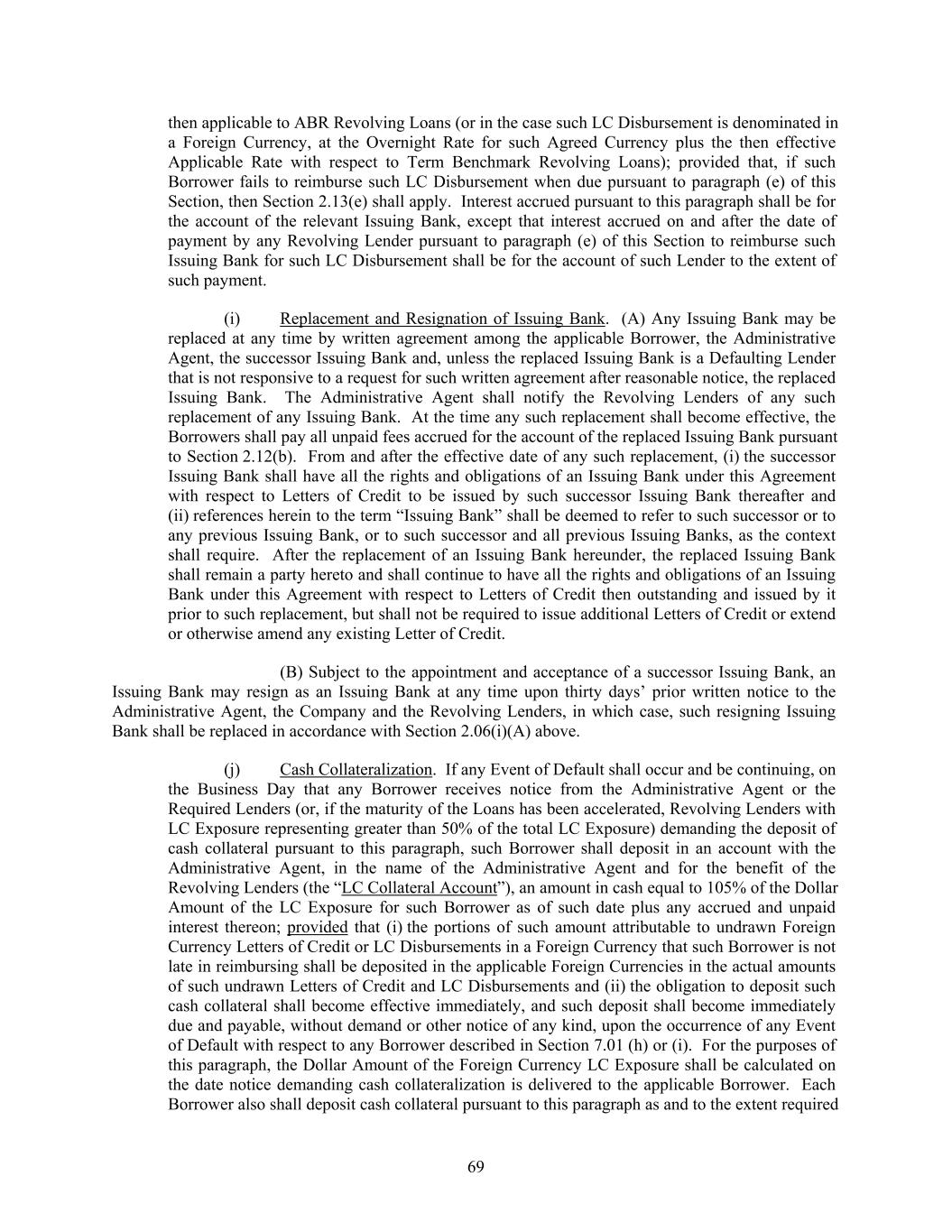 then applicable to ABR Revolving Loans (or in the case such LC Disbursement is denominated in a Foreign Currency, at the Overnight Rate for such Agreed Currency plus the then effective Applicable Rate with respect to Term Benchmark Revolving Loans); provided that, if such Borrower fails to reimburse such LC Disbursement when due pursuant to paragraph (e) of this Section, then Section 2.13(e) shall apply. Interest accrued pursuant to this paragraph shall be for the account of the relevant Issuing Bank, except that interest accrued on and after the date of payment by any Revolving Lender pursuant to paragraph (e) of this Section to reimburse such Issuing Bank for such LC Disbursement shall be for the account of such Lender to the extent of such payment. (i) Replacement and Resignation of Issuing Bank. (A) Any Issuing Bank may be replaced at any time by written agreement among the applicable Borrower, the Administrative Agent, the successor Issuing Bank and, unless the replaced Issuing Bank is a Defaulting Lender that is not responsive to a request for such written agreement after reasonable notice, the replaced Issuing Bank. The Administrative Agent shall notify the Revolving Lenders of any such replacement of any Issuing Bank. At the time any such replacement shall become effective, the Borrowers shall pay all unpaid fees accrued for the account of the replaced Issuing Bank pursuant to Section 2.12(b). From and after the effective date of any such replacement, (i) the successor Issuing Bank shall have all the rights and obligations of an Issuing Bank under this Agreement with respect to Letters of Credit to be issued by such successor Issuing Bank thereafter and (ii) references herein to the term “Issuing Bank” shall be deemed to refer to such successor or to any previous Issuing Bank, or to such successor and all previous Issuing Banks, as the context shall require. After the replacement of an Issuing Bank hereunder, the replaced Issuing Bank shall remain a party hereto and shall continue to have all the rights and obligations of an Issuing Bank under this Agreement with respect to Letters of Credit then outstanding and issued by it prior to such replacement, but shall not be required to issue additional Letters of Credit or extend or otherwise amend any existing Letter of Credit. (B) Subject to the appointment and acceptance of a successor Issuing Bank, an Issuing Bank may resign as an Issuing Bank at any time upon thirty days’ prior written notice to the Administrative Agent, the Company and the Revolving Lenders, in which case, such resigning Issuing Bank shall be replaced in accordance with Section 2.06(i)(A) above. (j) Cash Collateralization. If any Event of Default shall occur and be continuing, on the Business Day that any Borrower receives notice from the Administrative Agent or the Required Lenders (or, if the maturity of the Loans has been accelerated, Revolving Lenders with LC Exposure representing greater than 50% of the total LC Exposure) demanding the deposit of cash collateral pursuant to this paragraph, such Borrower shall deposit in an account with the Administrative Agent, in the name of the Administrative Agent and for the benefit of the Revolving Lenders (the “LC Collateral Account”), an amount in cash equal to 105% of the Dollar Amount of the LC Exposure for such Borrower as of such date plus any accrued and unpaid interest thereon; provided that (i) the portions of such amount attributable to undrawn Foreign Currency Letters of Credit or LC Disbursements in a Foreign Currency that such Borrower is not late in reimbursing shall be deposited in the applicable Foreign Currencies in the actual amounts of such undrawn Letters of Credit and LC Disbursements and (ii) the obligation to deposit such cash collateral shall become effective immediately, and such deposit shall become immediately due and payable, without demand or other notice of any kind, upon the occurrence of any Event of Default with respect to any Borrower described in Section 7.01 (h) or (i). For the purposes of this paragraph, the Dollar Amount of the Foreign Currency LC Exposure shall be calculated on the date notice demanding cash collateralization is delivered to the applicable Borrower. Each Borrower also shall deposit cash collateral pursuant to this paragraph as and to the extent required 69