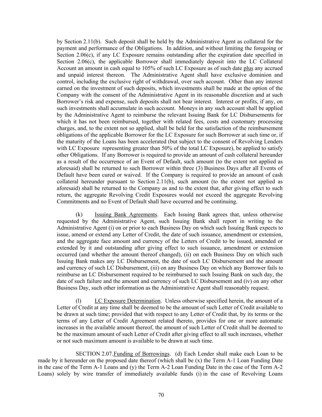 by Section 2.11(b). Such deposit shall be held by the Administrative Agent as collateral for the payment and performance of the Obligations. In addition, and without limiting the foregoing or Section 2.06(c), if any LC Exposure remains outstanding after the expiration date specified in Section 2.06(c), the applicable Borrower shall immediately deposit into the LC Collateral Account an amount in cash equal to 105% of such LC Exposure as of such date plus any accrued and unpaid interest thereon. The Administrative Agent shall have exclusive dominion and control, including the exclusive right of withdrawal, over such account. Other than any interest earned on the investment of such deposits, which investments shall be made at the option of the Company with the consent of the Administrative Agent in its reasonable discretion and at such Borrower’s risk and expense, such deposits shall not bear interest. Interest or profits, if any, on such investments shall accumulate in such account. Moneys in any such account shall be applied by the Administrative Agent to reimburse the relevant Issuing Bank for LC Disbursements for which it has not been reimbursed, together with related fees, costs and customary processing charges, and, to the extent not so applied, shall be held for the satisfaction of the reimbursement obligations of the applicable Borrower for the LC Exposure for such Borrower at such time or, if the maturity of the Loans has been accelerated (but subject to the consent of Revolving Lenders with LC Exposure representing greater than 50% of the total LC Exposure), be applied to satisfy other Obligations. If any Borrower is required to provide an amount of cash collateral hereunder as a result of the occurrence of an Event of Default, such amount (to the extent not applied as aforesaid) shall be returned to such Borrower within three (3) Business Days after all Events of Default have been cured or waived. If the Company is required to provide an amount of cash collateral hereunder pursuant to Section 2.11(b), such amount (to the extent not applied as aforesaid) shall be returned to the Company as and to the extent that, after giving effect to such return, the aggregate Revolving Credit Exposures would not exceed the aggregate Revolving Commitments and no Event of Default shall have occurred and be continuing. (k) Issuing Bank Agreements. Each Issuing Bank agrees that, unless otherwise requested by the Administrative Agent, such Issuing Bank shall report in writing to the Administrative Agent (i) on or prior to each Business Day on which such Issuing Bank expects to issue, amend or extend any Letter of Credit, the date of such issuance, amendment or extension, and the aggregate face amount and currency of the Letters of Credit to be issued, amended or extended by it and outstanding after giving effect to such issuance, amendment or extension occurred (and whether the amount thereof changed), (ii) on each Business Day on which such Issuing Bank makes any LC Disbursement, the date of such LC Disbursement and the amount and currency of such LC Disbursement, (iii) on any Business Day on which any Borrower fails to reimburse an LC Disbursement required to be reimbursed to such Issuing Bank on such day, the date of such failure and the amount and currency of such LC Disbursement and (iv) on any other Business Day, such other information as the Administrative Agent shall reasonably request. (l) LC Exposure Determination. Unless otherwise specified herein, the amount of a Letter of Credit at any time shall be deemed to be the amount of such Letter of Credit available to be drawn at such time; provided that with respect to any Letter of Credit that, by its terms or the terms of any Letter of Credit Agreement related thereto, provides for one or more automatic increases in the available amount thereof, the amount of such Letter of Credit shall be deemed to be the maximum amount of such Letter of Credit after giving effect to all such increases, whether or not such maximum amount is available to be drawn at such time. SECTION 2.07.Funding of Borrowings. (d) Each Lender shall make each Loan to be made by it hereunder on the proposed date thereof (which shall be (x) the Term A-1 Loan Funding Date in the case of the Term A-1 Loans and (y) the Term A-2 Loan Funding Date in the case of the Term A-2 Loans) solely by wire transfer of immediately available funds (i) in the case of Revolving Loans 70