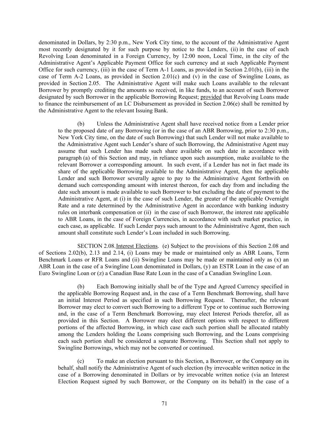 denominated in Dollars, by 2:30 p.m., New York City time, to the account of the Administrative Agent most recently designated by it for such purpose by notice to the Lenders, (ii) in the case of each Revolving Loan denominated in a Foreign Currency, by 12:00 noon, Local Time, in the city of the Administrative Agent’s Applicable Payment Office for such currency and at such Applicable Payment Office for such currency, (iii) in the case of Term A-1 Loans, as provided in Section 2.01(b), (iii) in the case of Term A-2 Loans, as provided in Section 2.01(c) and (v) in the case of Swingline Loans, as provided in Section 2.05. The Administrative Agent will make such Loans available to the relevant Borrower by promptly crediting the amounts so received, in like funds, to an account of such Borrower designated by such Borrower in the applicable Borrowing Request; provided that Revolving Loans made to finance the reimbursement of an LC Disbursement as provided in Section 2.06(e) shall be remitted by the Administrative Agent to the relevant Issuing Bank. (b) Unless the Administrative Agent shall have received notice from a Lender prior to the proposed date of any Borrowing (or in the case of an ABR Borrowing, prior to 2:30 p.m., New York City time, on the date of such Borrowing) that such Lender will not make available to the Administrative Agent such Lender’s share of such Borrowing, the Administrative Agent may assume that such Lender has made such share available on such date in accordance with paragraph (a) of this Section and may, in reliance upon such assumption, make available to the relevant Borrower a corresponding amount. In such event, if a Lender has not in fact made its share of the applicable Borrowing available to the Administrative Agent, then the applicable Lender and such Borrower severally agree to pay to the Administrative Agent forthwith on demand such corresponding amount with interest thereon, for each day from and including the date such amount is made available to such Borrower to but excluding the date of payment to the Administrative Agent, at (i) in the case of such Lender, the greater of the applicable Overnight Rate and a rate determined by the Administrative Agent in accordance with banking industry rules on interbank compensation or (ii) in the case of such Borrower, the interest rate applicable to ABR Loans, in the case of Foreign Currencies, in accordance with such market practice, in each case, as applicable. If such Lender pays such amount to the Administrative Agent, then such amount shall constitute such Lender’s Loan included in such Borrowing. SECTION 2.08.Interest Elections. (e) Subject to the provisions of this Section 2.08 and of Sections 2.02(b), 2.13 and 2.14, (i) Loans may be made or maintained only as ABR Loans, Term Benchmark Loans or RFR Loans and (ii) Swingline Loans may be made or maintained only as (x) an ABR Loan in the case of a Swingline Loan denominated in Dollars, (y) an ESTR Loan in the case of an Euro Swingline Loan or (z) a Canadian Base Rate Loan in the case of a Canadian Swingline Loan. (b) Each Borrowing initially shall be of the Type and Agreed Currency specified in the applicable Borrowing Request and, in the case of a Term Benchmark Borrowing, shall have an initial Interest Period as specified in such Borrowing Request. Thereafter, the relevant Borrower may elect to convert such Borrowing to a different Type or to continue such Borrowing and, in the case of a Term Benchmark Borrowing, may elect Interest Periods therefor, all as provided in this Section. A Borrower may elect different options with respect to different portions of the affected Borrowing, in which case each such portion shall be allocated ratably among the Lenders holding the Loans comprising such Borrowing, and the Loans comprising each such portion shall be considered a separate Borrowing. This Section shall not apply to Swingline Borrowings, which may not be converted or continued. (c) To make an election pursuant to this Section, a Borrower, or the Company on its behalf, shall notify the Administrative Agent of such election (by irrevocable written notice in the case of a Borrowing denominated in Dollars or by irrevocable written notice (via an Interest Election Request signed by such Borrower, or the Company on its behalf) in the case of a 71