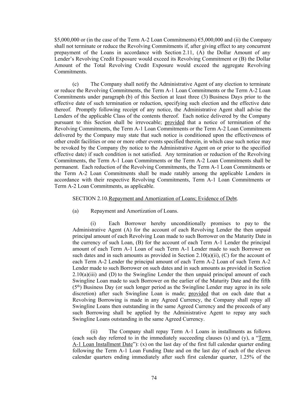 $5,000,000 or (in the case of the Term A-2 Loan Commitments) €5,000,000 and (ii) the Company shall not terminate or reduce the Revolving Commitments if, after giving effect to any concurrent prepayment of the Loans in accordance with Section 2.11, (A) the Dollar Amount of any Lender’s Revolving Credit Exposure would exceed its Revolving Commitment or (B) the Dollar Amount of the Total Revolving Credit Exposure would exceed the aggregate Revolving Commitments. (c) The Company shall notify the Administrative Agent of any election to terminate or reduce the Revolving Commitments, the Term A-1 Loan Commitments or the Term A-2 Loan Commitments under paragraph (b) of this Section at least three (3) Business Days prior to the effective date of such termination or reduction, specifying such election and the effective date thereof. Promptly following receipt of any notice, the Administrative Agent shall advise the Lenders of the applicable Class of the contents thereof. Each notice delivered by the Company pursuant to this Section shall be irrevocable; provided that a notice of termination of the Revolving Commitments, the Term A-1 Loan Commitments or the Term A-2 Loan Commitments delivered by the Company may state that such notice is conditioned upon the effectiveness of other credit facilities or one or more other events specified therein, in which case such notice may be revoked by the Company (by notice to the Administrative Agent on or prior to the specified effective date) if such condition is not satisfied. Any termination or reduction of the Revolving Commitments, the Term A-1 Loan Commitments or the Term A-2 Loan Commitments shall be permanent. Each reduction of the Revolving Commitments, the Term A-1 Loan Commitments or the Term A-2 Loan Commitments shall be made ratably among the applicable Lenders in accordance with their respective Revolving Commitments, Term A-1 Loan Commitments or Term A-2 Loan Commitments, as applicable. SECTION 2.10.Repayment and Amortization of Loans; Evidence of Debt. (a) Repayment and Amortization of Loans. (i) Each Borrower hereby unconditionally promises to pay to the Administrative Agent (A) for the account of each Revolving Lender the then unpaid principal amount of each Revolving Loan made to such Borrower on the Maturity Date in the currency of such Loan, (B) for the account of each Term A-1 Lender the principal amount of each Term A-1 Loan of such Term A-1 Lender made to such Borrower on such dates and in such amounts as provided in Section 2.10(a)(ii), (C) for the account of each Term A-2 Lender the principal amount of each Term A-2 Loan of such Term A-2 Lender made to such Borrower on such dates and in such amounts as provided in Section 2.10(a)(iii) and (D) to the Swingline Lender the then unpaid principal amount of each Swingline Loan made to such Borrower on the earlier of the Maturity Date and the fifth (5th) Business Day (or such longer period as the Swingline Lender may agree in its sole discretion) after such Swingline Loan is made; provided that on each date that a Revolving Borrowing is made in any Agreed Currency, the Company shall repay all Swingline Loans then outstanding in the same Agreed Currency and the proceeds of any such Borrowing shall be applied by the Administrative Agent to repay any such Swingline Loans outstanding in the same Agreed Currency. (ii) The Company shall repay Term A-1 Loans in installments as follows (each such day referred to in the immediately succeeding clauses (x) and (y), a “Term A-1 Loan Installment Date”): (x) on the last day of the first full calendar quarter ending following the Term A-1 Loan Funding Date and on the last day of each of the eleven calendar quarters ending immediately after such first calendar quarter, 1.25% of the 74