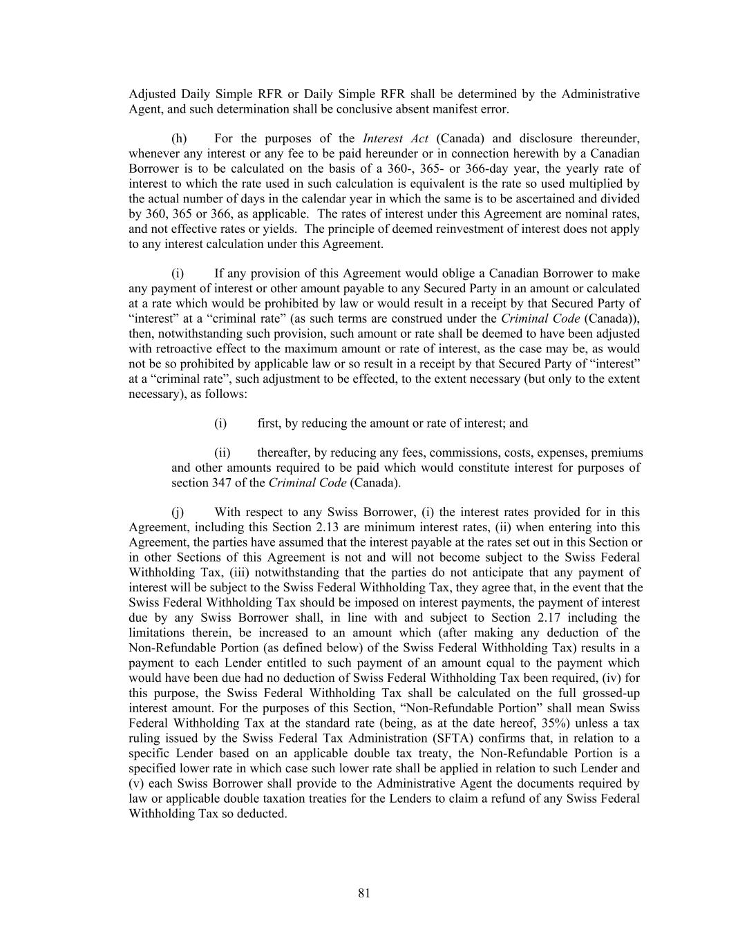 Adjusted Daily Simple RFR or Daily Simple RFR shall be determined by the Administrative Agent, and such determination shall be conclusive absent manifest error. (h) For the purposes of the Interest Act (Canada) and disclosure thereunder, whenever any interest or any fee to be paid hereunder or in connection herewith by a Canadian Borrower is to be calculated on the basis of a 360-, 365- or 366-day year, the yearly rate of interest to which the rate used in such calculation is equivalent is the rate so used multiplied by the actual number of days in the calendar year in which the same is to be ascertained and divided by 360, 365 or 366, as applicable. The rates of interest under this Agreement are nominal rates, and not effective rates or yields. The principle of deemed reinvestment of interest does not apply to any interest calculation under this Agreement. (i) If any provision of this Agreement would oblige a Canadian Borrower to make any payment of interest or other amount payable to any Secured Party in an amount or calculated at a rate which would be prohibited by law or would result in a receipt by that Secured Party of “interest” at a “criminal rate” (as such terms are construed under the Criminal Code (Canada)), then, notwithstanding such provision, such amount or rate shall be deemed to have been adjusted with retroactive effect to the maximum amount or rate of interest, as the case may be, as would not be so prohibited by applicable law or so result in a receipt by that Secured Party of “interest” at a “criminal rate”, such adjustment to be effected, to the extent necessary (but only to the extent necessary), as follows: (i) first, by reducing the amount or rate of interest; and (ii) thereafter, by reducing any fees, commissions, costs, expenses, premiums and other amounts required to be paid which would constitute interest for purposes of section 347 of the Criminal Code (Canada). (j) With respect to any Swiss Borrower, (i) the interest rates provided for in this Agreement, including this Section 2.13 are minimum interest rates, (ii) when entering into this Agreement, the parties have assumed that the interest payable at the rates set out in this Section or in other Sections of this Agreement is not and will not become subject to the Swiss Federal Withholding Tax, (iii) notwithstanding that the parties do not anticipate that any payment of interest will be subject to the Swiss Federal Withholding Tax, they agree that, in the event that the Swiss Federal Withholding Tax should be imposed on interest payments, the payment of interest due by any Swiss Borrower shall, in line with and subject to Section 2.17 including the limitations therein, be increased to an amount which (after making any deduction of the Non-Refundable Portion (as defined below) of the Swiss Federal Withholding Tax) results in a payment to each Lender entitled to such payment of an amount equal to the payment which would have been due had no deduction of Swiss Federal Withholding Tax been required, (iv) for this purpose, the Swiss Federal Withholding Tax shall be calculated on the full grossed-up interest amount. For the purposes of this Section, “Non-Refundable Portion” shall mean Swiss Federal Withholding Tax at the standard rate (being, as at the date hereof, 35%) unless a tax ruling issued by the Swiss Federal Tax Administration (SFTA) confirms that, in relation to a specific Lender based on an applicable double tax treaty, the Non-Refundable Portion is a specified lower rate in which case such lower rate shall be applied in relation to such Lender and (v) each Swiss Borrower shall provide to the Administrative Agent the documents required by law or applicable double taxation treaties for the Lenders to claim a refund of any Swiss Federal Withholding Tax so deducted. 81
