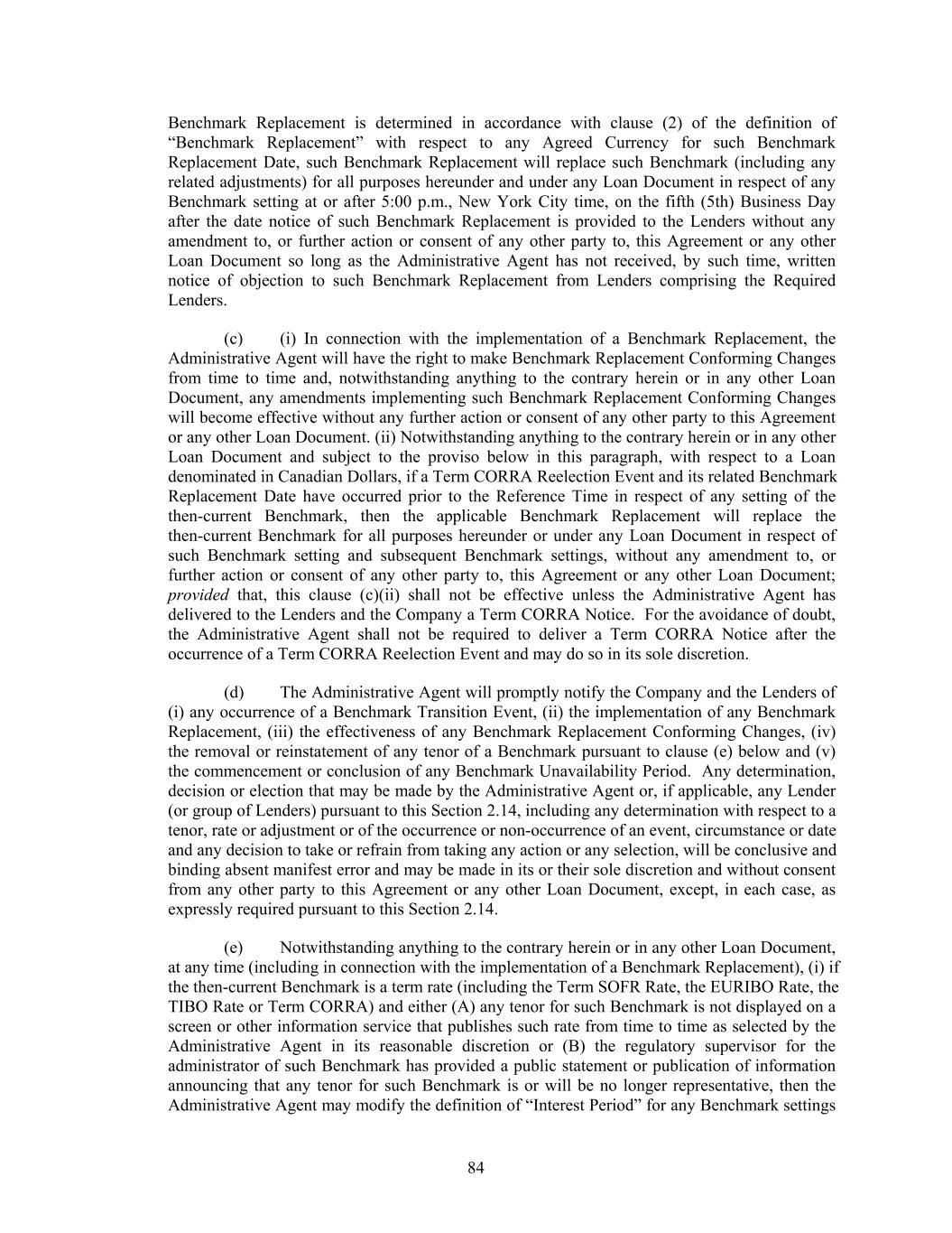 Benchmark Replacement is determined in accordance with clause (2) of the definition of “Benchmark Replacement” with respect to any Agreed Currency for such Benchmark Replacement Date, such Benchmark Replacement will replace such Benchmark (including any related adjustments) for all purposes hereunder and under any Loan Document in respect of any Benchmark setting at or after 5:00 p.m., New York City time, on the fifth (5th) Business Day after the date notice of such Benchmark Replacement is provided to the Lenders without any amendment to, or further action or consent of any other party to, this Agreement or any other Loan Document so long as the Administrative Agent has not received, by such time, written notice of objection to such Benchmark Replacement from Lenders comprising the Required Lenders. (c) (i) In connection with the implementation of a Benchmark Replacement, the Administrative Agent will have the right to make Benchmark Replacement Conforming Changes from time to time and, notwithstanding anything to the contrary herein or in any other Loan Document, any amendments implementing such Benchmark Replacement Conforming Changes will become effective without any further action or consent of any other party to this Agreement or any other Loan Document. (ii) Notwithstanding anything to the contrary herein or in any other Loan Document and subject to the proviso below in this paragraph, with respect to a Loan denominated in Canadian Dollars, if a Term CORRA Reelection Event and its related Benchmark Replacement Date have occurred prior to the Reference Time in respect of any setting of the then-current Benchmark, then the applicable Benchmark Replacement will replace the then-current Benchmark for all purposes hereunder or under any Loan Document in respect of such Benchmark setting and subsequent Benchmark settings, without any amendment to, or further action or consent of any other party to, this Agreement or any other Loan Document; provided that, this clause (c)(ii) shall not be effective unless the Administrative Agent has delivered to the Lenders and the Company a Term CORRA Notice. For the avoidance of doubt, the Administrative Agent shall not be required to deliver a Term CORRA Notice after the occurrence of a Term CORRA Reelection Event and may do so in its sole discretion. (d) The Administrative Agent will promptly notify the Company and the Lenders of (i) any occurrence of a Benchmark Transition Event, (ii) the implementation of any Benchmark Replacement, (iii) the effectiveness of any Benchmark Replacement Conforming Changes, (iv) the removal or reinstatement of any tenor of a Benchmark pursuant to clause (e) below and (v) the commencement or conclusion of any Benchmark Unavailability Period. Any determination, decision or election that may be made by the Administrative Agent or, if applicable, any Lender (or group of Lenders) pursuant to this Section 2.14, including any determination with respect to a tenor, rate or adjustment or of the occurrence or non-occurrence of an event, circumstance or date and any decision to take or refrain from taking any action or any selection, will be conclusive and binding absent manifest error and may be made in its or their sole discretion and without consent from any other party to this Agreement or any other Loan Document, except, in each case, as expressly required pursuant to this Section 2.14. (e) Notwithstanding anything to the contrary herein or in any other Loan Document, at any time (including in connection with the implementation of a Benchmark Replacement), (i) if the then-current Benchmark is a term rate (including the Term SOFR Rate, the EURIBO Rate, the TIBO Rate or Term CORRA) and either (A) any tenor for such Benchmark is not displayed on a screen or other information service that publishes such rate from time to time as selected by the Administrative Agent in its reasonable discretion or (B) the regulatory supervisor for the administrator of such Benchmark has provided a public statement or publication of information announcing that any tenor for such Benchmark is or will be no longer representative, then the Administrative Agent may modify the definition of “Interest Period” for any Benchmark settings 84