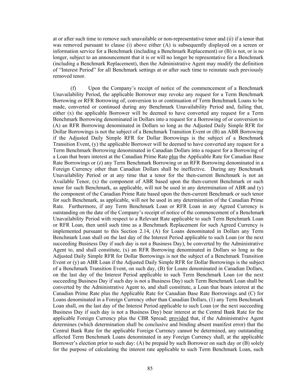 at or after such time to remove such unavailable or non-representative tenor and (ii) if a tenor that was removed pursuant to clause (i) above either (A) is subsequently displayed on a screen or information service for a Benchmark (including a Benchmark Replacement) or (B) is not, or is no longer, subject to an announcement that it is or will no longer be representative for a Benchmark (including a Benchmark Replacement), then the Administrative Agent may modify the definition of “Interest Period” for all Benchmark settings at or after such time to reinstate such previously removed tenor. (f) Upon the Company’s receipt of notice of the commencement of a Benchmark Unavailability Period, the applicable Borrower may revoke any request for a Term Benchmark Borrowing or RFR Borrowing of, conversion to or continuation of Term Benchmark Loans to be made, converted or continued during any Benchmark Unavailability Period and, failing that, either (x) the applicable Borrower will be deemed to have converted any request for a Term Benchmark Borrowing denominated in Dollars into a request for a Borrowing of or conversion to (A) an RFR Borrowing denominated in Dollars so long as the Adjusted Daily Simple RFR for Dollar Borrowings is not the subject of a Benchmark Transition Event or (B) an ABR Borrowing if the Adjusted Daily Simple RFR for Dollar Borrowings is the subject of a Benchmark Transition Event, (y) the applicable Borrower will be deemed to have converted any request for a Term Benchmark Borrowing denominated in Canadian Dollars into a request for a Borrowing of a Loan that bears interest at the Canadian Prime Rate plus the Applicable Rate for Canadian Base Rate Borrowings or (z) any Term Benchmark Borrowing or an RFR Borrowing denominated in a Foreign Currency other than Canadian Dollars shall be ineffective. During any Benchmark Unavailability Period or at any time that a tenor for the then-current Benchmark is not an Available Tenor, (x) the component of ABR based upon the then-current Benchmark or such tenor for such Benchmark, as applicable, will not be used in any determination of ABR and (y) the component of the Canadian Prime Rate based upon the then-current Benchmark or such tenor for such Benchmark, as applicable, will not be used in any determination of the Canadian Prime Rate. Furthermore, if any Term Benchmark Loan or RFR Loan in any Agreed Currency is outstanding on the date of the Company’s receipt of notice of the commencement of a Benchmark Unavailability Period with respect to a Relevant Rate applicable to such Term Benchmark Loan or RFR Loan, then until such time as a Benchmark Replacement for such Agreed Currency is implemented pursuant to this Section 2.14, (A) for Loans denominated in Dollars any Term Benchmark Loan shall on the last day of the Interest Period applicable to such Loan (or the next succeeding Business Day if such day is not a Business Day), be converted by the Administrative Agent to, and shall constitute, (x) an RFR Borrowing denominated in Dollars so long as the Adjusted Daily Simple RFR for Dollar Borrowings is not the subject of a Benchmark Transition Event or (y) an ABR Loan if the Adjusted Daily Simple RFR for Dollar Borrowings is the subject of a Benchmark Transition Event, on such day, (B) for Loans denominated in Canadian Dollars, on the last day of the Interest Period applicable to such Term Benchmark Loan (or the next succeeding Business Day if such day is not a Business Day) such Term Benchmark Loan shall be converted by the Administrative Agent to, and shall constitute, a Loan that bears interest at the Canadian Prime Rate plus the Applicable Rate for Canadian Base Rate Borrowings and (C) for Loans denominated in a Foreign Currency other than Canadian Dollars, (1) any Term Benchmark Loan shall, on the last day of the Interest Period applicable to such Loan (or the next succeeding Business Day if such day is not a Business Day) bear interest at the Central Bank Rate for the applicable Foreign Currency plus the CBR Spread; provided that, if the Administrative Agent determines (which determination shall be conclusive and binding absent manifest error) that the Central Bank Rate for the applicable Foreign Currency cannot be determined, any outstanding affected Term Benchmark Loans denominated in any Foreign Currency shall, at the applicable Borrower’s election prior to such day: (A) be prepaid by such Borrower on such day or (B) solely for the purpose of calculating the interest rate applicable to such Term Benchmark Loan, such 85