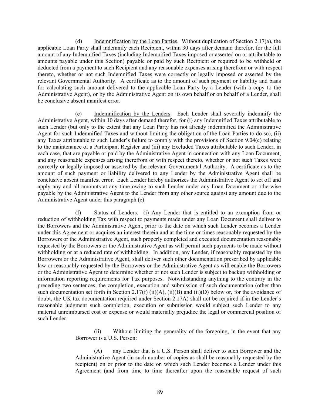 (d) Indemnification by the Loan Parties. Without duplication of Section 2.17(a), the applicable Loan Party shall indemnify each Recipient, within 30 days after demand therefor, for the full amount of any Indemnified Taxes (including Indemnified Taxes imposed or asserted on or attributable to amounts payable under this Section) payable or paid by such Recipient or required to be withheld or deducted from a payment to such Recipient and any reasonable expenses arising therefrom or with respect thereto, whether or not such Indemnified Taxes were correctly or legally imposed or asserted by the relevant Governmental Authority. A certificate as to the amount of such payment or liability and basis for calculating such amount delivered to the applicable Loan Party by a Lender (with a copy to the Administrative Agent), or by the Administrative Agent on its own behalf or on behalf of a Lender, shall be conclusive absent manifest error. (e) Indemnification by the Lenders. Each Lender shall severally indemnify the Administrative Agent, within 10 days after demand therefor, for (i) any Indemnified Taxes attributable to such Lender (but only to the extent that any Loan Party has not already indemnified the Administrative Agent for such Indemnified Taxes and without limiting the obligation of the Loan Parties to do so), (ii) any Taxes attributable to such Lender’s failure to comply with the provisions of Section 9.04(c) relating to the maintenance of a Participant Register and (iii) any Excluded Taxes attributable to such Lender, in each case, that are payable or paid by the Administrative Agent in connection with any Loan Document, and any reasonable expenses arising therefrom or with respect thereto, whether or not such Taxes were correctly or legally imposed or asserted by the relevant Governmental Authority. A certificate as to the amount of such payment or liability delivered to any Lender by the Administrative Agent shall be conclusive absent manifest error. Each Lender hereby authorizes the Administrative Agent to set off and apply any and all amounts at any time owing to such Lender under any Loan Document or otherwise payable by the Administrative Agent to the Lender from any other source against any amount due to the Administrative Agent under this paragraph (e). (f) Status of Lenders. (i) Any Lender that is entitled to an exemption from or reduction of withholding Tax with respect to payments made under any Loan Document shall deliver to the Borrowers and the Administrative Agent, prior to the date on which such Lender becomes a Lender under this Agreement or acquires an interest therein and at the time or times reasonably requested by the Borrowers or the Administrative Agent, such properly completed and executed documentation reasonably requested by the Borrowers or the Administrative Agent as will permit such payments to be made without withholding or at a reduced rate of withholding. In addition, any Lender, if reasonably requested by the Borrowers or the Administrative Agent, shall deliver such other documentation prescribed by applicable law or reasonably requested by the Borrowers or the Administrative Agent as will enable the Borrowers or the Administrative Agent to determine whether or not such Lender is subject to backup withholding or information reporting requirements for Tax purposes. Notwithstanding anything to the contrary in the preceding two sentences, the completion, execution and submission of such documentation (other than such documentation set forth in Section 2.17(f) (ii)(A), (ii)(B) and (ii)(D) below or, for the avoidance of doubt, the UK tax documentation required under Section 2.17A) shall not be required if in the Lender’s reasonable judgment such completion, execution or submission would subject such Lender to any material unreimbursed cost or expense or would materially prejudice the legal or commercial position of such Lender. (ii) Without limiting the generality of the foregoing, in the event that any Borrower is a U.S. Person: (A) any Lender that is a U.S. Person shall deliver to such Borrower and the Administrative Agent (in such number of copies as shall be reasonably requested by the recipient) on or prior to the date on which such Lender becomes a Lender under this Agreement (and from time to time thereafter upon the reasonable request of such 89
