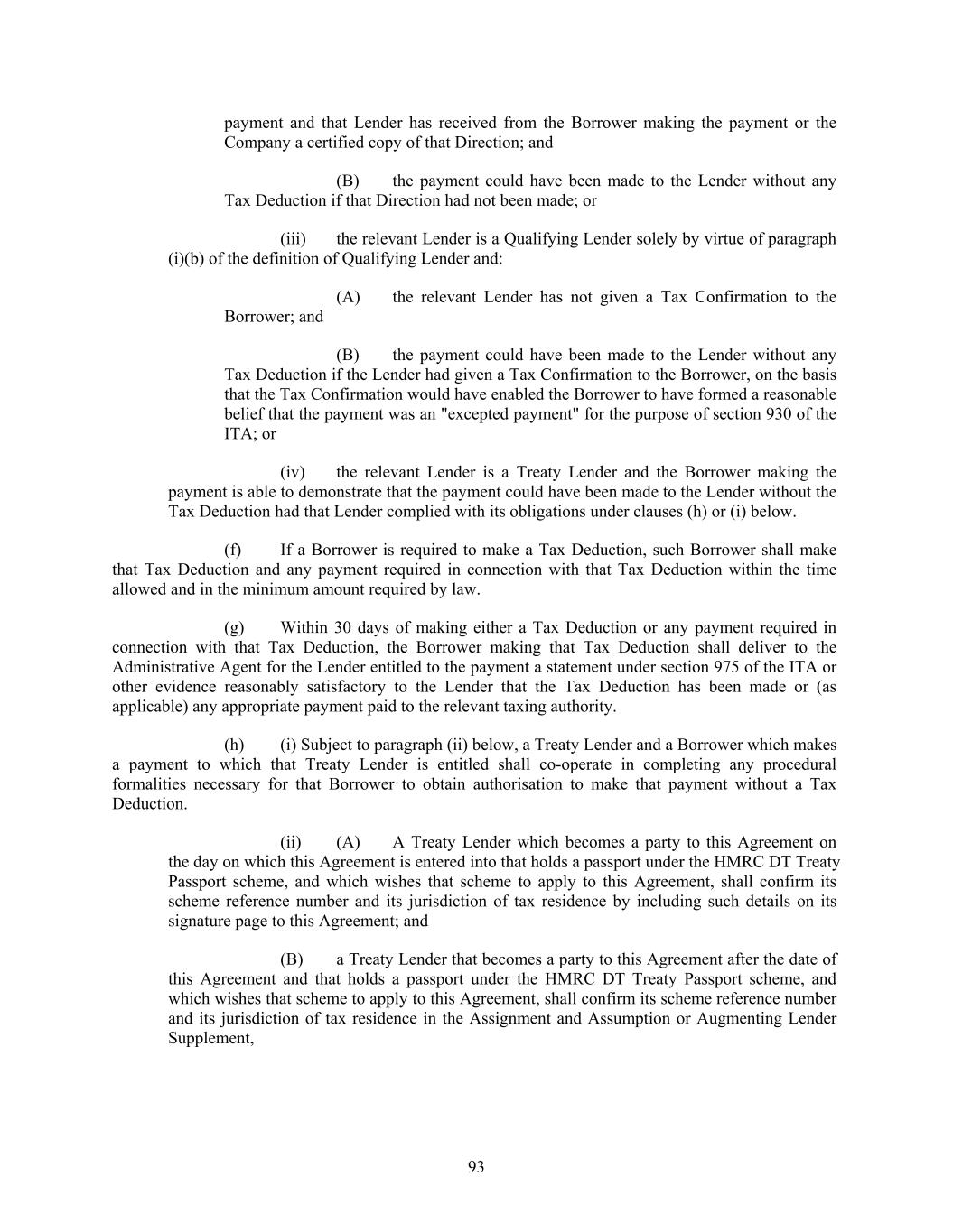 payment and that Lender has received from the Borrower making the payment or the Company a certified copy of that Direction; and (B) the payment could have been made to the Lender without any Tax Deduction if that Direction had not been made; or (iii) the relevant Lender is a Qualifying Lender solely by virtue of paragraph (i)(b) of the definition of Qualifying Lender and: (A) the relevant Lender has not given a Tax Confirmation to the Borrower; and (B) the payment could have been made to the Lender without any Tax Deduction if the Lender had given a Tax Confirmation to the Borrower, on the basis that the Tax Confirmation would have enabled the Borrower to have formed a reasonable belief that the payment was an "excepted payment" for the purpose of section 930 of the ITA; or (iv) the relevant Lender is a Treaty Lender and the Borrower making the payment is able to demonstrate that the payment could have been made to the Lender without the Tax Deduction had that Lender complied with its obligations under clauses (h) or (i) below. (f) If a Borrower is required to make a Tax Deduction, such Borrower shall make that Tax Deduction and any payment required in connection with that Tax Deduction within the time allowed and in the minimum amount required by law. (g) Within 30 days of making either a Tax Deduction or any payment required in connection with that Tax Deduction, the Borrower making that Tax Deduction shall deliver to the Administrative Agent for the Lender entitled to the payment a statement under section 975 of the ITA or other evidence reasonably satisfactory to the Lender that the Tax Deduction has been made or (as applicable) any appropriate payment paid to the relevant taxing authority. (h) (i) Subject to paragraph (ii) below, a Treaty Lender and a Borrower which makes a payment to which that Treaty Lender is entitled shall co-operate in completing any procedural formalities necessary for that Borrower to obtain authorisation to make that payment without a Tax Deduction. (ii) (A) A Treaty Lender which becomes a party to this Agreement on the day on which this Agreement is entered into that holds a passport under the HMRC DT Treaty Passport scheme, and which wishes that scheme to apply to this Agreement, shall confirm its scheme reference number and its jurisdiction of tax residence by including such details on its signature page to this Agreement; and (B) a Treaty Lender that becomes a party to this Agreement after the date of this Agreement and that holds a passport under the HMRC DT Treaty Passport scheme, and which wishes that scheme to apply to this Agreement, shall confirm its scheme reference number and its jurisdiction of tax residence in the Assignment and Assumption or Augmenting Lender Supplement, 93