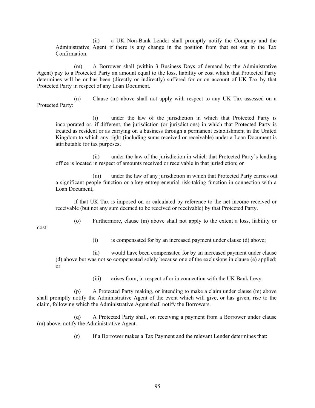 (ii) a UK Non-Bank Lender shall promptly notify the Company and the Administrative Agent if there is any change in the position from that set out in the Tax Confirmation. (m) A Borrower shall (within 3 Business Days of demand by the Administrative Agent) pay to a Protected Party an amount equal to the loss, liability or cost which that Protected Party determines will be or has been (directly or indirectly) suffered for or on account of UK Tax by that Protected Party in respect of any Loan Document. (n) Clause (m) above shall not apply with respect to any UK Tax assessed on a Protected Party: (i) under the law of the jurisdiction in which that Protected Party is incorporated or, if different, the jurisdiction (or jurisdictions) in which that Protected Party is treated as resident or as carrying on a business through a permanent establishment in the United Kingdom to which any right (including sums received or receivable) under a Loan Document is attributable for tax purposes; (ii) under the law of the jurisdiction in which that Protected Party’s lending office is located in respect of amounts received or receivable in that jurisdiction; or (iii) under the law of any jurisdiction in which that Protected Party carries out a significant people function or a key entrepreneurial risk-taking function in connection with a Loan Document, if that UK Tax is imposed on or calculated by reference to the net income received or receivable (but not any sum deemed to be received or receivable) by that Protected Party. (o) Furthermore, clause (m) above shall not apply to the extent a loss, liability or cost: (i) is compensated for by an increased payment under clause (d) above; (ii) would have been compensated for by an increased payment under clause (d) above but was not so compensated solely because one of the exclusions in clause (e) applied; or (iii) arises from, in respect of or in connection with the UK Bank Levy. (p) A Protected Party making, or intending to make a claim under clause (m) above shall promptly notify the Administrative Agent of the event which will give, or has given, rise to the claim, following which the Administrative Agent shall notify the Borrowers. (q) A Protected Party shall, on receiving a payment from a Borrower under clause (m) above, notify the Administrative Agent. (r) If a Borrower makes a Tax Payment and the relevant Lender determines that: 95