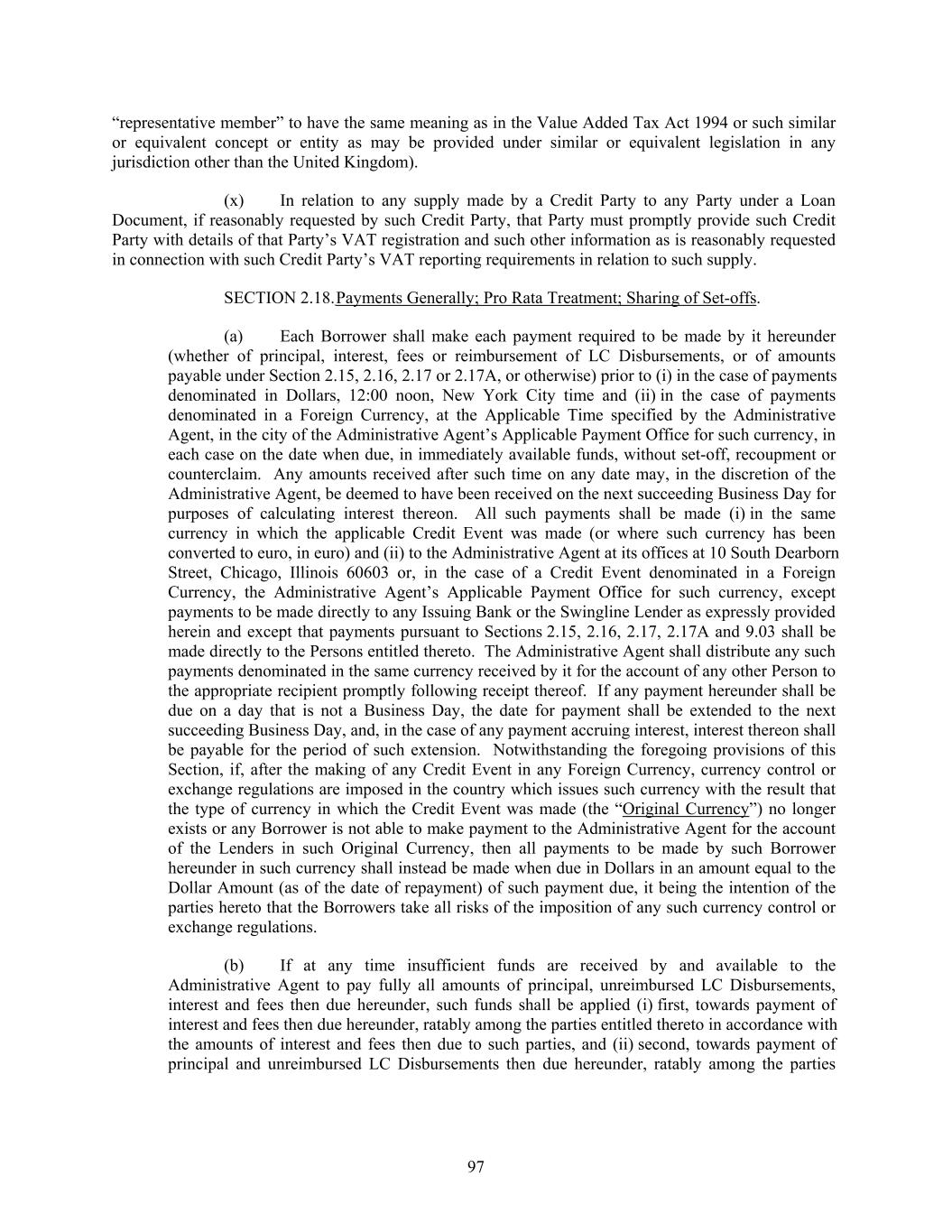 “representative member” to have the same meaning as in the Value Added Tax Act 1994 or such similar or equivalent concept or entity as may be provided under similar or equivalent legislation in any jurisdiction other than the United Kingdom). (x) In relation to any supply made by a Credit Party to any Party under a Loan Document, if reasonably requested by such Credit Party, that Party must promptly provide such Credit Party with details of that Party’s VAT registration and such other information as is reasonably requested in connection with such Credit Party’s VAT reporting requirements in relation to such supply. SECTION 2.18.Payments Generally; Pro Rata Treatment; Sharing of Set-offs. (a) Each Borrower shall make each payment required to be made by it hereunder (whether of principal, interest, fees or reimbursement of LC Disbursements, or of amounts payable under Section 2.15, 2.16, 2.17 or 2.17A, or otherwise) prior to (i) in the case of payments denominated in Dollars, 12:00 noon, New York City time and (ii) in the case of payments denominated in a Foreign Currency, at the Applicable Time specified by the Administrative Agent, in the city of the Administrative Agent’s Applicable Payment Office for such currency, in each case on the date when due, in immediately available funds, without set-off, recoupment or counterclaim. Any amounts received after such time on any date may, in the discretion of the Administrative Agent, be deemed to have been received on the next succeeding Business Day for purposes of calculating interest thereon. All such payments shall be made (i) in the same currency in which the applicable Credit Event was made (or where such currency has been converted to euro, in euro) and (ii) to the Administrative Agent at its offices at 10 South Dearborn Street, Chicago, Illinois 60603 or, in the case of a Credit Event denominated in a Foreign Currency, the Administrative Agent’s Applicable Payment Office for such currency, except payments to be made directly to any Issuing Bank or the Swingline Lender as expressly provided herein and except that payments pursuant to Sections 2.15, 2.16, 2.17, 2.17A and 9.03 shall be made directly to the Persons entitled thereto. The Administrative Agent shall distribute any such payments denominated in the same currency received by it for the account of any other Person to the appropriate recipient promptly following receipt thereof. If any payment hereunder shall be due on a day that is not a Business Day, the date for payment shall be extended to the next succeeding Business Day, and, in the case of any payment accruing interest, interest thereon shall be payable for the period of such extension. Notwithstanding the foregoing provisions of this Section, if, after the making of any Credit Event in any Foreign Currency, currency control or exchange regulations are imposed in the country which issues such currency with the result that the type of currency in which the Credit Event was made (the “Original Currency”) no longer exists or any Borrower is not able to make payment to the Administrative Agent for the account of the Lenders in such Original Currency, then all payments to be made by such Borrower hereunder in such currency shall instead be made when due in Dollars in an amount equal to the Dollar Amount (as of the date of repayment) of such payment due, it being the intention of the parties hereto that the Borrowers take all risks of the imposition of any such currency control or exchange regulations. (b) If at any time insufficient funds are received by and available to the Administrative Agent to pay fully all amounts of principal, unreimbursed LC Disbursements, interest and fees then due hereunder, such funds shall be applied (i) first, towards payment of interest and fees then due hereunder, ratably among the parties entitled thereto in accordance with the amounts of interest and fees then due to such parties, and (ii) second, towards payment of principal and unreimbursed LC Disbursements then due hereunder, ratably among the parties 97