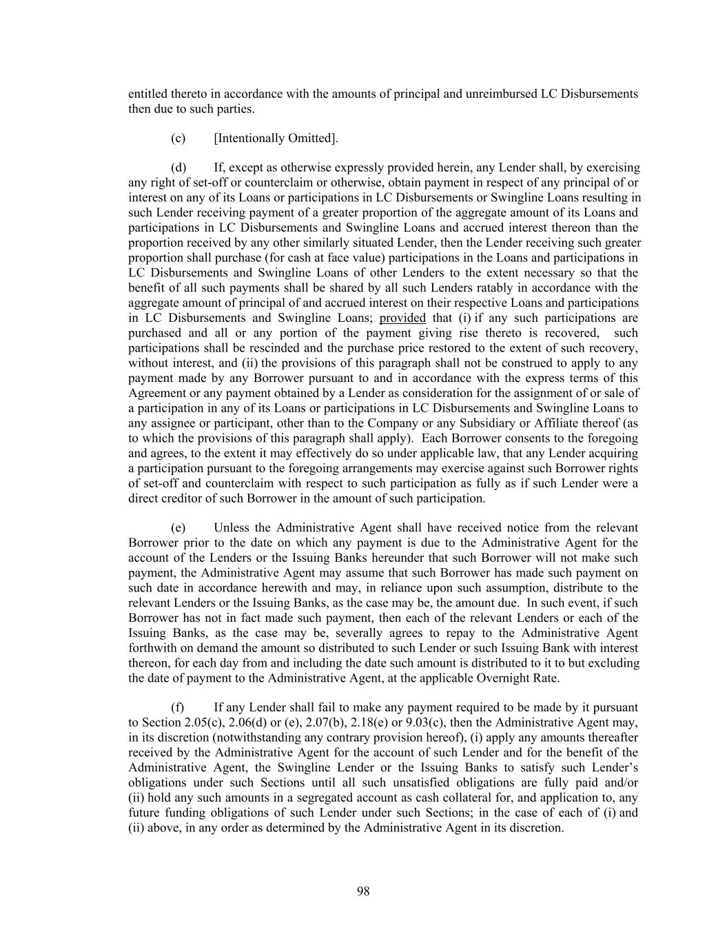entitled thereto in accordance with the amounts of principal and unreimbursed LC Disbursements then due to such parties. (c) [Intentionally Omitted]. (d) If, except as otherwise expressly provided herein, any Lender shall, by exercising any right of set-off or counterclaim or otherwise, obtain payment in respect of any principal of or interest on any of its Loans or participations in LC Disbursements or Swingline Loans resulting in such Lender receiving payment of a greater proportion of the aggregate amount of its Loans and participations in LC Disbursements and Swingline Loans and accrued interest thereon than the proportion received by any other similarly situated Lender, then the Lender receiving such greater proportion shall purchase (for cash at face value) participations in the Loans and participations in LC Disbursements and Swingline Loans of other Lenders to the extent necessary so that the benefit of all such payments shall be shared by all such Lenders ratably in accordance with the aggregate amount of principal of and accrued interest on their respective Loans and participations in LC Disbursements and Swingline Loans; provided that (i) if any such participations are purchased and all or any portion of the payment giving rise thereto is recovered, such participations shall be rescinded and the purchase price restored to the extent of such recovery, without interest, and (ii) the provisions of this paragraph shall not be construed to apply to any payment made by any Borrower pursuant to and in accordance with the express terms of this Agreement or any payment obtained by a Lender as consideration for the assignment of or sale of a participation in any of its Loans or participations in LC Disbursements and Swingline Loans to any assignee or participant, other than to the Company or any Subsidiary or Affiliate thereof (as to which the provisions of this paragraph shall apply). Each Borrower consents to the foregoing and agrees, to the extent it may effectively do so under applicable law, that any Lender acquiring a participation pursuant to the foregoing arrangements may exercise against such Borrower rights of set-off and counterclaim with respect to such participation as fully as if such Lender were a direct creditor of such Borrower in the amount of such participation. (e) Unless the Administrative Agent shall have received notice from the relevant Borrower prior to the date on which any payment is due to the Administrative Agent for the account of the Lenders or the Issuing Banks hereunder that such Borrower will not make such payment, the Administrative Agent may assume that such Borrower has made such payment on such date in accordance herewith and may, in reliance upon such assumption, distribute to the relevant Lenders or the Issuing Banks, as the case may be, the amount due. In such event, if such Borrower has not in fact made such payment, then each of the relevant Lenders or each of the Issuing Banks, as the case may be, severally agrees to repay to the Administrative Agent forthwith on demand the amount so distributed to such Lender or such Issuing Bank with interest thereon, for each day from and including the date such amount is distributed to it to but excluding the date of payment to the Administrative Agent, at the applicable Overnight Rate. (f) If any Lender shall fail to make any payment required to be made by it pursuant to Section 2.05(c), 2.06(d) or (e), 2.07(b), 2.18(e) or 9.03(c), then the Administrative Agent may, in its discretion (notwithstanding any contrary provision hereof), (i) apply any amounts thereafter received by the Administrative Agent for the account of such Lender and for the benefit of the Administrative Agent, the Swingline Lender or the Issuing Banks to satisfy such Lender’s obligations under such Sections until all such unsatisfied obligations are fully paid and/or (ii) hold any such amounts in a segregated account as cash collateral for, and application to, any future funding obligations of such Lender under such Sections; in the case of each of (i) and (ii) above, in any order as determined by the Administrative Agent in its discretion. 98