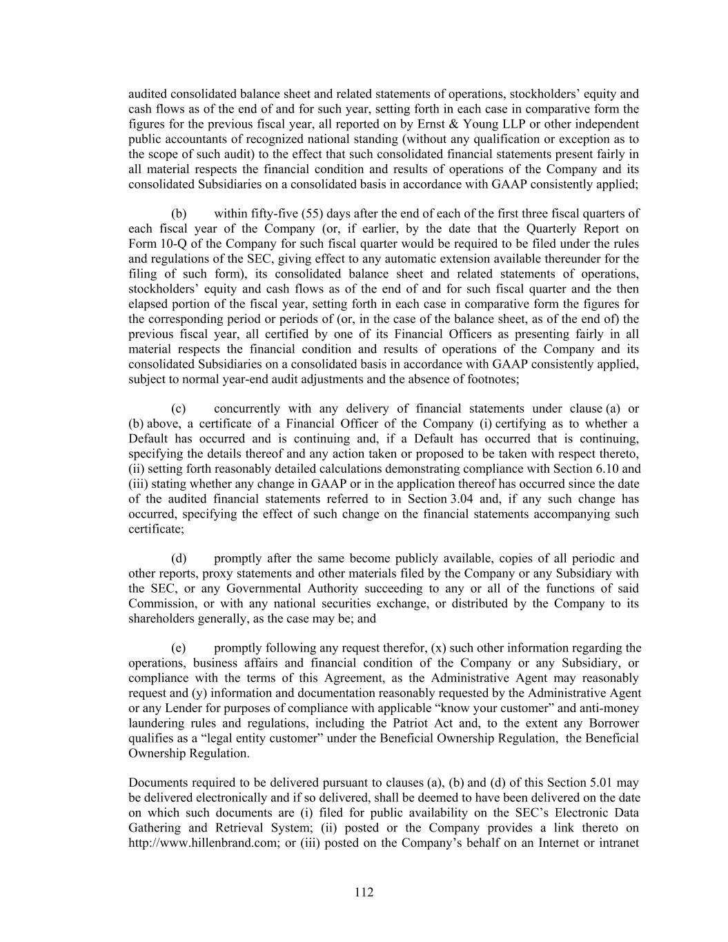 audited consolidated balance sheet and related statements of operations, stockholders’ equity and cash flows as of the end of and for such year, setting forth in each case in comparative form the figures for the previous fiscal year, all reported on by Ernst & Young LLP or other independent public accountants of recognized national standing (without any qualification or exception as to the scope of such audit) to the effect that such consolidated financial statements present fairly in all material respects the financial condition and results of operations of the Company and its consolidated Subsidiaries on a consolidated basis in accordance with GAAP consistently applied; (b) within fifty-five (55) days after the end of each of the first three fiscal quarters of each fiscal year of the Company (or, if earlier, by the date that the Quarterly Report on Form 10-Q of the Company for such fiscal quarter would be required to be filed under the rules and regulations of the SEC, giving effect to any automatic extension available thereunder for the filing of such form), its consolidated balance sheet and related statements of operations, stockholders’ equity and cash flows as of the end of and for such fiscal quarter and the then elapsed portion of the fiscal year, setting forth in each case in comparative form the figures for the corresponding period or periods of (or, in the case of the balance sheet, as of the end of) the previous fiscal year, all certified by one of its Financial Officers as presenting fairly in all material respects the financial condition and results of operations of the Company and its consolidated Subsidiaries on a consolidated basis in accordance with GAAP consistently applied, subject to normal year-end audit adjustments and the absence of footnotes; (c) concurrently with any delivery of financial statements under clause (a) or (b) above, a certificate of a Financial Officer of the Company (i) certifying as to whether a Default has occurred and is continuing and, if a Default has occurred that is continuing, specifying the details thereof and any action taken or proposed to be taken with respect thereto, (ii) setting forth reasonably detailed calculations demonstrating compliance with Section 6.10 and (iii) stating whether any change in GAAP or in the application thereof has occurred since the date of the audited financial statements referred to in Section 3.04 and, if any such change has occurred, specifying the effect of such change on the financial statements accompanying such certificate; (d) promptly after the same become publicly available, copies of all periodic and other reports, proxy statements and other materials filed by the Company or any Subsidiary with the SEC, or any Governmental Authority succeeding to any or all of the functions of said Commission, or with any national securities exchange, or distributed by the Company to its shareholders generally, as the case may be; and (e) promptly following any request therefor, (x) such other information regarding the operations, business affairs and financial condition of the Company or any Subsidiary, or compliance with the terms of this Agreement, as the Administrative Agent may reasonably request and (y) information and documentation reasonably requested by the Administrative Agent or any Lender for purposes of compliance with applicable “know your customer” and anti-money laundering rules and regulations, including the Patriot Act and, to the extent any Borrower qualifies as a “legal entity customer” under the Beneficial Ownership Regulation, the Beneficial Ownership Regulation. Documents required to be delivered pursuant to clauses (a), (b) and (d) of this Section 5.01 may be delivered electronically and if so delivered, shall be deemed to have been delivered on the date on which such documents are (i) filed for public availability on the SEC’s Electronic Data Gathering and Retrieval System; (ii) posted or the Company provides a link thereto on http://www.hillenbrand.com; or (iii) posted on the Company’s behalf on an Internet or intranet 112