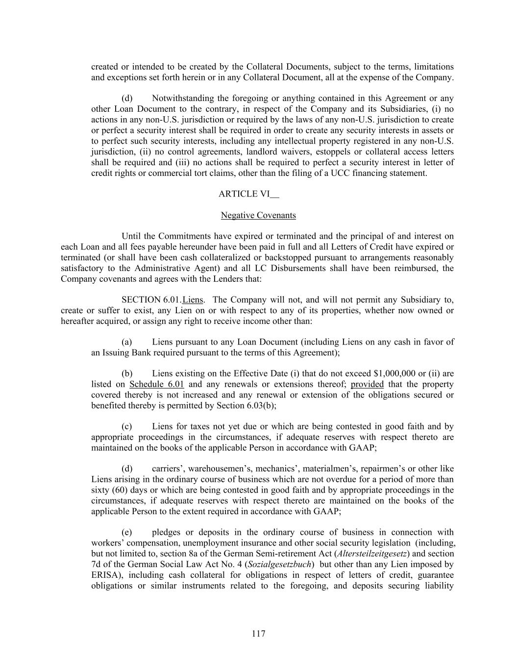 created or intended to be created by the Collateral Documents, subject to the terms, limitations and exceptions set forth herein or in any Collateral Document, all at the expense of the Company. (d) Notwithstanding the foregoing or anything contained in this Agreement or any other Loan Document to the contrary, in respect of the Company and its Subsidiaries, (i) no actions in any non-U.S. jurisdiction or required by the laws of any non-U.S. jurisdiction to create or perfect a security interest shall be required in order to create any security interests in assets or to perfect such security interests, including any intellectual property registered in any non-U.S. jurisdiction, (ii) no control agreements, landlord waivers, estoppels or collateral access letters shall be required and (iii) no actions shall be required to perfect a security interest in letter of credit rights or commercial tort claims, other than the filing of a UCC financing statement. ARTICLE VI Negative Covenants Until the Commitments have expired or terminated and the principal of and interest on each Loan and all fees payable hereunder have been paid in full and all Letters of Credit have expired or terminated (or shall have been cash collateralized or backstopped pursuant to arrangements reasonably satisfactory to the Administrative Agent) and all LC Disbursements shall have been reimbursed, the Company covenants and agrees with the Lenders that: SECTION 6.01.Liens. The Company will not, and will not permit any Subsidiary to, create or suffer to exist, any Lien on or with respect to any of its properties, whether now owned or hereafter acquired, or assign any right to receive income other than: (a) Liens pursuant to any Loan Document (including Liens on any cash in favor of an Issuing Bank required pursuant to the terms of this Agreement); (b) Liens existing on the Effective Date (i) that do not exceed $1,000,000 or (ii) are listed on Schedule 6.01 and any renewals or extensions thereof; provided that the property covered thereby is not increased and any renewal or extension of the obligations secured or benefited thereby is permitted by Section 6.03(b); (c) Liens for taxes not yet due or which are being contested in good faith and by appropriate proceedings in the circumstances, if adequate reserves with respect thereto are maintained on the books of the applicable Person in accordance with GAAP; (d) carriers’, warehousemen’s, mechanics’, materialmen’s, repairmen’s or other like Liens arising in the ordinary course of business which are not overdue for a period of more than sixty (60) days or which are being contested in good faith and by appropriate proceedings in the circumstances, if adequate reserves with respect thereto are maintained on the books of the applicable Person to the extent required in accordance with GAAP; (e) pledges or deposits in the ordinary course of business in connection with workers’ compensation, unemployment insurance and other social security legislation (including, but not limited to, section 8a of the German Semi-retirement Act (Altersteilzeitgesetz) and section 7d of the German Social Law Act No. 4 (Sozialgesetzbuch) but other than any Lien imposed by ERISA), including cash collateral for obligations in respect of letters of credit, guarantee obligations or similar instruments related to the foregoing, and deposits securing liability 117