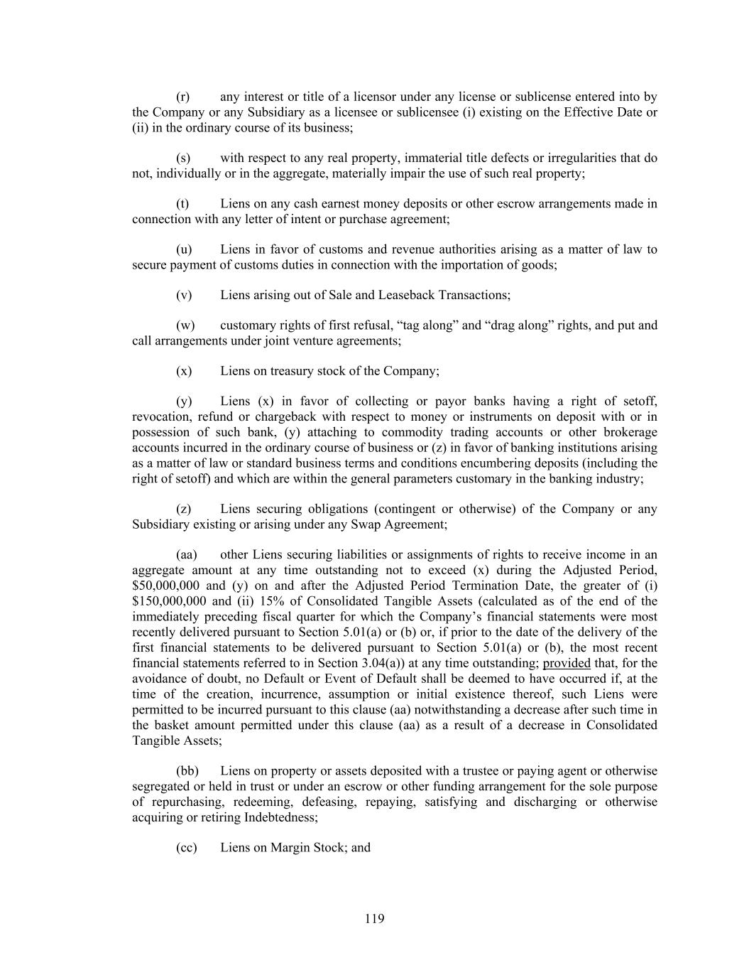 (r) any interest or title of a licensor under any license or sublicense entered into by the Company or any Subsidiary as a licensee or sublicensee (i) existing on the Effective Date or (ii) in the ordinary course of its business; (s) with respect to any real property, immaterial title defects or irregularities that do not, individually or in the aggregate, materially impair the use of such real property; (t) Liens on any cash earnest money deposits or other escrow arrangements made in connection with any letter of intent or purchase agreement; (u) Liens in favor of customs and revenue authorities arising as a matter of law to secure payment of customs duties in connection with the importation of goods; (v) Liens arising out of Sale and Leaseback Transactions; (w) customary rights of first refusal, “tag along” and “drag along” rights, and put and call arrangements under joint venture agreements; (x) Liens on treasury stock of the Company; (y) Liens (x) in favor of collecting or payor banks having a right of setoff, revocation, refund or chargeback with respect to money or instruments on deposit with or in possession of such bank, (y) attaching to commodity trading accounts or other brokerage accounts incurred in the ordinary course of business or (z) in favor of banking institutions arising as a matter of law or standard business terms and conditions encumbering deposits (including the right of setoff) and which are within the general parameters customary in the banking industry; (z) Liens securing obligations (contingent or otherwise) of the Company or any Subsidiary existing or arising under any Swap Agreement; (aa) other Liens securing liabilities or assignments of rights to receive income in an aggregate amount at any time outstanding not to exceed (x) during the Adjusted Period, $50,000,000 and (y) on and after the Adjusted Period Termination Date, the greater of (i) $150,000,000 and (ii) 15% of Consolidated Tangible Assets (calculated as of the end of the immediately preceding fiscal quarter for which the Company’s financial statements were most recently delivered pursuant to Section 5.01(a) or (b) or, if prior to the date of the delivery of the first financial statements to be delivered pursuant to Section 5.01(a) or (b), the most recent financial statements referred to in Section 3.04(a)) at any time outstanding; provided that, for the avoidance of doubt, no Default or Event of Default shall be deemed to have occurred if, at the time of the creation, incurrence, assumption or initial existence thereof, such Liens were permitted to be incurred pursuant to this clause (aa) notwithstanding a decrease after such time in the basket amount permitted under this clause (aa) as a result of a decrease in Consolidated Tangible Assets; (bb) Liens on property or assets deposited with a trustee or paying agent or otherwise segregated or held in trust or under an escrow or other funding arrangement for the sole purpose of repurchasing, redeeming, defeasing, repaying, satisfying and discharging or otherwise acquiring or retiring Indebtedness; (cc) Liens on Margin Stock; and 119