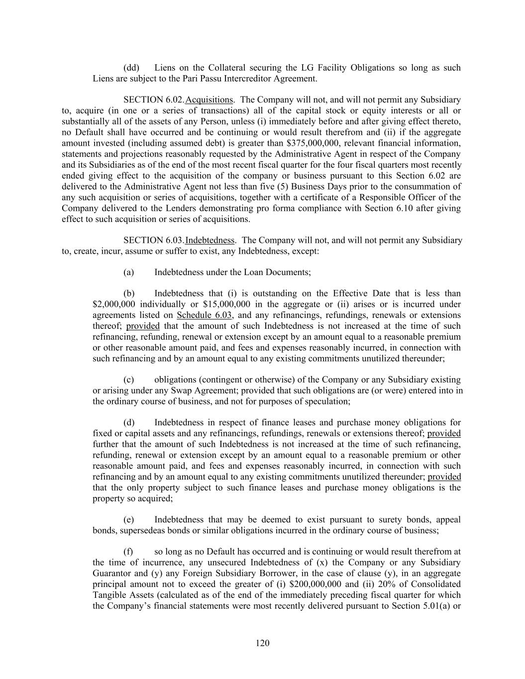 (dd) Liens on the Collateral securing the LG Facility Obligations so long as such Liens are subject to the Pari Passu Intercreditor Agreement. SECTION 6.02.Acquisitions. The Company will not, and will not permit any Subsidiary to, acquire (in one or a series of transactions) all of the capital stock or equity interests or all or substantially all of the assets of any Person, unless (i) immediately before and after giving effect thereto, no Default shall have occurred and be continuing or would result therefrom and (ii) if the aggregate amount invested (including assumed debt) is greater than $375,000,000, relevant financial information, statements and projections reasonably requested by the Administrative Agent in respect of the Company and its Subsidiaries as of the end of the most recent fiscal quarter for the four fiscal quarters most recently ended giving effect to the acquisition of the company or business pursuant to this Section 6.02 are delivered to the Administrative Agent not less than five (5) Business Days prior to the consummation of any such acquisition or series of acquisitions, together with a certificate of a Responsible Officer of the Company delivered to the Lenders demonstrating pro forma compliance with Section 6.10 after giving effect to such acquisition or series of acquisitions. SECTION 6.03.Indebtedness. The Company will not, and will not permit any Subsidiary to, create, incur, assume or suffer to exist, any Indebtedness, except: (a) Indebtedness under the Loan Documents; (b) Indebtedness that (i) is outstanding on the Effective Date that is less than $2,000,000 individually or $15,000,000 in the aggregate or (ii) arises or is incurred under agreements listed on Schedule 6.03, and any refinancings, refundings, renewals or extensions thereof; provided that the amount of such Indebtedness is not increased at the time of such refinancing, refunding, renewal or extension except by an amount equal to a reasonable premium or other reasonable amount paid, and fees and expenses reasonably incurred, in connection with such refinancing and by an amount equal to any existing commitments unutilized thereunder; (c) obligations (contingent or otherwise) of the Company or any Subsidiary existing or arising under any Swap Agreement; provided that such obligations are (or were) entered into in the ordinary course of business, and not for purposes of speculation; (d) Indebtedness in respect of finance leases and purchase money obligations for fixed or capital assets and any refinancings, refundings, renewals or extensions thereof; provided further that the amount of such Indebtedness is not increased at the time of such refinancing, refunding, renewal or extension except by an amount equal to a reasonable premium or other reasonable amount paid, and fees and expenses reasonably incurred, in connection with such refinancing and by an amount equal to any existing commitments unutilized thereunder; provided that the only property subject to such finance leases and purchase money obligations is the property so acquired; (e) Indebtedness that may be deemed to exist pursuant to surety bonds, appeal bonds, supersedeas bonds or similar obligations incurred in the ordinary course of business; (f) so long as no Default has occurred and is continuing or would result therefrom at the time of incurrence, any unsecured Indebtedness of (x) the Company or any Subsidiary Guarantor and (y) any Foreign Subsidiary Borrower, in the case of clause (y), in an aggregate principal amount not to exceed the greater of (i) $200,000,000 and (ii) 20% of Consolidated Tangible Assets (calculated as of the end of the immediately preceding fiscal quarter for which the Company’s financial statements were most recently delivered pursuant to Section 5.01(a) or 120