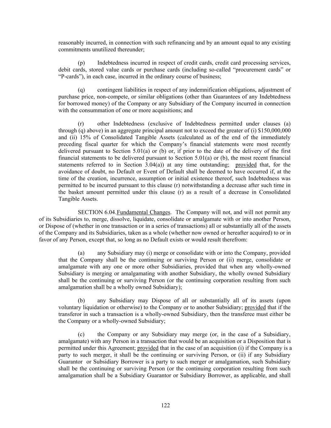 reasonably incurred, in connection with such refinancing and by an amount equal to any existing commitments unutilized thereunder; (p) Indebtedness incurred in respect of credit cards, credit card processing services, debit cards, stored value cards or purchase cards (including so-called “procurement cards” or “P-cards”), in each case, incurred in the ordinary course of business; (q) contingent liabilities in respect of any indemnification obligations, adjustment of purchase price, non-compete, or similar obligations (other than Guarantees of any Indebtedness for borrowed money) of the Company or any Subsidiary of the Company incurred in connection with the consummation of one or more acquisitions; and (r) other Indebtedness (exclusive of Indebtedness permitted under clauses (a) through (q) above) in an aggregate principal amount not to exceed the greater of (i) $150,000,000 and (ii) 15% of Consolidated Tangible Assets (calculated as of the end of the immediately preceding fiscal quarter for which the Company’s financial statements were most recently delivered pursuant to Section 5.01(a) or (b) or, if prior to the date of the delivery of the first financial statements to be delivered pursuant to Section 5.01(a) or (b), the most recent financial statements referred to in Section 3.04(a)) at any time outstanding; provided that, for the avoidance of doubt, no Default or Event of Default shall be deemed to have occurred if, at the time of the creation, incurrence, assumption or initial existence thereof, such Indebtedness was permitted to be incurred pursuant to this clause (r) notwithstanding a decrease after such time in the basket amount permitted under this clause (r) as a result of a decrease in Consolidated Tangible Assets. SECTION 6.04.Fundamental Changes. The Company will not, and will not permit any of its Subsidiaries to, merge, dissolve, liquidate, consolidate or amalgamate with or into another Person, or Dispose of (whether in one transaction or in a series of transactions) all or substantially all of the assets of the Company and its Subsidiaries, taken as a whole (whether now owned or hereafter acquired) to or in favor of any Person, except that, so long as no Default exists or would result therefrom: (a) any Subsidiary may (i) merge or consolidate with or into the Company, provided that the Company shall be the continuing or surviving Person or (ii) merge, consolidate or amalgamate with any one or more other Subsidiaries, provided that when any wholly-owned Subsidiary is merging or amalgamating with another Subsidiary, the wholly owned Subsidiary shall be the continuing or surviving Person (or the continuing corporation resulting from such amalgamation shall be a wholly owned Subsidiary); (b) any Subsidiary may Dispose of all or substantially all of its assets (upon voluntary liquidation or otherwise) to the Company or to another Subsidiary; provided that if the transferor in such a transaction is a wholly-owned Subsidiary, then the transferee must either be the Company or a wholly-owned Subsidiary; (c) the Company or any Subsidiary may merge (or, in the case of a Subsidiary, amalgamate) with any Person in a transaction that would be an acquisition or a Disposition that is permitted under this Agreement; provided that in the case of an acquisition (i) if the Company is a party to such merger, it shall be the continuing or surviving Person, or (ii) if any Subsidiary Guarantor or Subsidiary Borrower is a party to such merger or amalgamation, such Subsidiary shall be the continuing or surviving Person (or the continuing corporation resulting from such amalgamation shall be a Subsidiary Guarantor or Subsidiary Borrower, as applicable, and shall 122