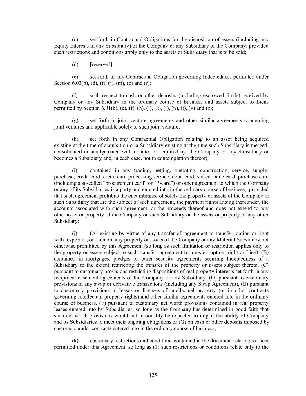 (c) set forth in Contractual Obligations for the disposition of assets (including any Equity Interests in any Subsidiary) of the Company or any Subsidiary of the Company; provided such restrictions and conditions apply only to the assets or Subsidiary that is to be sold; (d) [reserved]; (e) set forth in any Contractual Obligation governing Indebtedness permitted under Section 6.03(b), (d), (f), (j), (m), (o) and (r); (f) with respect to cash or other deposits (including escrowed funds) received by Company or any Subsidiary in the ordinary course of business and assets subject to Liens permitted by Section 6.01(b), (e), (f), (h), (j), (k), (l), (n), (t), (v) and (z); (g) set forth in joint venture agreements and other similar agreements concerning joint ventures and applicable solely to such joint venture; (h) set forth in any Contractual Obligation relating to an asset being acquired existing at the time of acquisition or a Subsidiary existing at the time such Subsidiary is merged, consolidated or amalgamated with or into, or acquired by, the Company or any Subsidiary or becomes a Subsidiary and, in each case, not in contemplation thereof; (i) contained in any trading, netting, operating, construction, service, supply, purchase, credit card, credit card processing service, debit card, stored value card, purchase card (including a so-called “procurement card” or “P-card”) or other agreement to which the Company or any of its Subsidiaries is a party and entered into in the ordinary course of business; provided that such agreement prohibits the encumbrance of solely the property or assets of the Company or such Subsidiary that are the subject of such agreement, the payment rights arising thereunder, the accounts associated with such agreement, or the proceeds thereof and does not extend to any other asset or property of the Company or such Subsidiary or the assets or property of any other Subsidiary; (j) (A) existing by virtue of any transfer of, agreement to transfer, option or right with respect to, or Lien on, any property or assets of the Company or any Material Subsidiary not otherwise prohibited by this Agreement (so long as such limitation or restriction applies only to the property or assets subject to such transfer, agreement to transfer, option, right or Lien), (B) contained in mortgages, pledges or other security agreements securing Indebtedness of a Subsidiary to the extent restricting the transfer of the property or assets subject thereto, (C) pursuant to customary provisions restricting dispositions of real property interests set forth in any reciprocal easement agreements of the Company or any Subsidiary, (D) pursuant to customary provisions in any swap or derivative transactions (including any Swap Agreement), (E) pursuant to customary provisions in leases or licenses of intellectual property (or in other contracts governing intellectual property rights) and other similar agreements entered into in the ordinary course of business, (F) pursuant to customary net worth provisions contained in real property leases entered into by Subsidiaries, so long as the Company has determined in good faith that such net worth provisions would not reasonably be expected to impair the ability of Company and its Subsidiaries to meet their ongoing obligations or (G) on cash or other deposits imposed by customers under contracts entered into in the ordinary course of business; (k) customary restrictions and conditions contained in the document relating to Liens permitted under this Agreement, so long as (1) such restrictions or conditions relate only to the 125