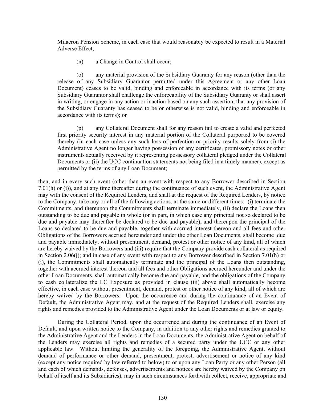 Milacron Pension Scheme, in each case that would reasonably be expected to result in a Material Adverse Effect; (n) a Change in Control shall occur; (o) any material provision of the Subsidiary Guaranty for any reason (other than the release of any Subsidiary Guarantor permitted under this Agreement or any other Loan Document) ceases to be valid, binding and enforceable in accordance with its terms (or any Subsidiary Guarantor shall challenge the enforceability of the Subsidiary Guaranty or shall assert in writing, or engage in any action or inaction based on any such assertion, that any provision of the Subsidiary Guaranty has ceased to be or otherwise is not valid, binding and enforceable in accordance with its terms); or (p) any Collateral Document shall for any reason fail to create a valid and perfected first priority security interest in any material portion of the Collateral purported to be covered thereby (in each case unless any such loss of perfection or priority results solely from (i) the Administrative Agent no longer having possession of any certificates, promissory notes or other instruments actually received by it representing possessory collateral pledged under the Collateral Documents or (ii) the UCC continuation statements not being filed in a timely manner), except as permitted by the terms of any Loan Document; then, and in every such event (other than an event with respect to any Borrower described in Section 7.01(h) or (i)), and at any time thereafter during the continuance of such event, the Administrative Agent may with the consent of the Required Lenders, and shall at the request of the Required Lenders, by notice to the Company, take any or all of the following actions, at the same or different times: (i) terminate the Commitments, and thereupon the Commitments shall terminate immediately, (ii) declare the Loans then outstanding to be due and payable in whole (or in part, in which case any principal not so declared to be due and payable may thereafter be declared to be due and payable), and thereupon the principal of the Loans so declared to be due and payable, together with accrued interest thereon and all fees and other Obligations of the Borrowers accrued hereunder and under the other Loan Documents, shall become due and payable immediately, without presentment, demand, protest or other notice of any kind, all of which are hereby waived by the Borrowers and (iii) require that the Company provide cash collateral as required in Section 2.06(j); and in case of any event with respect to any Borrower described in Section 7.01(h) or (i), the Commitments shall automatically terminate and the principal of the Loans then outstanding, together with accrued interest thereon and all fees and other Obligations accrued hereunder and under the other Loan Documents, shall automatically become due and payable, and the obligations of the Company to cash collateralize the LC Exposure as provided in clause (iii) above shall automatically become effective, in each case without presentment, demand, protest or other notice of any kind, all of which are hereby waived by the Borrowers. Upon the occurrence and during the continuance of an Event of Default, the Administrative Agent may, and at the request of the Required Lenders shall, exercise any rights and remedies provided to the Administrative Agent under the Loan Documents or at law or equity. During the Collateral Period, upon the occurrence and during the continuance of an Event of Default, and upon written notice to the Company, in addition to any other rights and remedies granted to the Administrative Agent and the Lenders in the Loan Documents, the Administrative Agent on behalf of the Lenders may exercise all rights and remedies of a secured party under the UCC or any other applicable law. Without limiting the generality of the foregoing, the Administrative Agent, without demand of performance or other demand, presentment, protest, advertisement or notice of any kind (except any notice required by law referred to below) to or upon any Loan Party or any other Person (all and each of which demands, defenses, advertisements and notices are hereby waived by the Company on behalf of itself and its Subsidiaries), may in such circumstances forthwith collect, receive, appropriate and 130