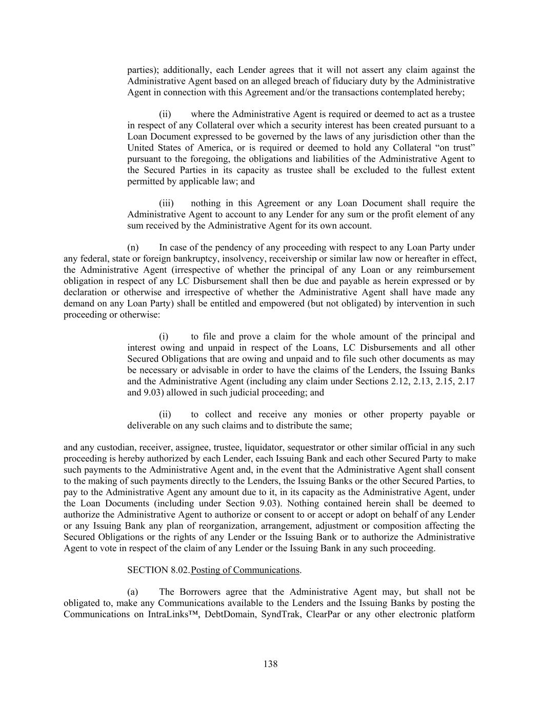parties); additionally, each Lender agrees that it will not assert any claim against the Administrative Agent based on an alleged breach of fiduciary duty by the Administrative Agent in connection with this Agreement and/or the transactions contemplated hereby; (ii) where the Administrative Agent is required or deemed to act as a trustee in respect of any Collateral over which a security interest has been created pursuant to a Loan Document expressed to be governed by the laws of any jurisdiction other than the United States of America, or is required or deemed to hold any Collateral “on trust” pursuant to the foregoing, the obligations and liabilities of the Administrative Agent to the Secured Parties in its capacity as trustee shall be excluded to the fullest extent permitted by applicable law; and (iii) nothing in this Agreement or any Loan Document shall require the Administrative Agent to account to any Lender for any sum or the profit element of any sum received by the Administrative Agent for its own account. (n) In case of the pendency of any proceeding with respect to any Loan Party under any federal, state or foreign bankruptcy, insolvency, receivership or similar law now or hereafter in effect, the Administrative Agent (irrespective of whether the principal of any Loan or any reimbursement obligation in respect of any LC Disbursement shall then be due and payable as herein expressed or by declaration or otherwise and irrespective of whether the Administrative Agent shall have made any demand on any Loan Party) shall be entitled and empowered (but not obligated) by intervention in such proceeding or otherwise: (i) to file and prove a claim for the whole amount of the principal and interest owing and unpaid in respect of the Loans, LC Disbursements and all other Secured Obligations that are owing and unpaid and to file such other documents as may be necessary or advisable in order to have the claims of the Lenders, the Issuing Banks and the Administrative Agent (including any claim under Sections 2.12, 2.13, 2.15, 2.17 and 9.03) allowed in such judicial proceeding; and (ii) to collect and receive any monies or other property payable or deliverable on any such claims and to distribute the same; and any custodian, receiver, assignee, trustee, liquidator, sequestrator or other similar official in any such proceeding is hereby authorized by each Lender, each Issuing Bank and each other Secured Party to make such payments to the Administrative Agent and, in the event that the Administrative Agent shall consent to the making of such payments directly to the Lenders, the Issuing Banks or the other Secured Parties, to pay to the Administrative Agent any amount due to it, in its capacity as the Administrative Agent, under the Loan Documents (including under Section 9.03). Nothing contained herein shall be deemed to authorize the Administrative Agent to authorize or consent to or accept or adopt on behalf of any Lender or any Issuing Bank any plan of reorganization, arrangement, adjustment or composition affecting the Secured Obligations or the rights of any Lender or the Issuing Bank or to authorize the Administrative Agent to vote in respect of the claim of any Lender or the Issuing Bank in any such proceeding. SECTION 8.02.Posting of Communications. (a) The Borrowers agree that the Administrative Agent may, but shall not be obligated to, make any Communications available to the Lenders and the Issuing Banks by posting the Communications on IntraLinks™, DebtDomain, SyndTrak, ClearPar or any other electronic platform 138