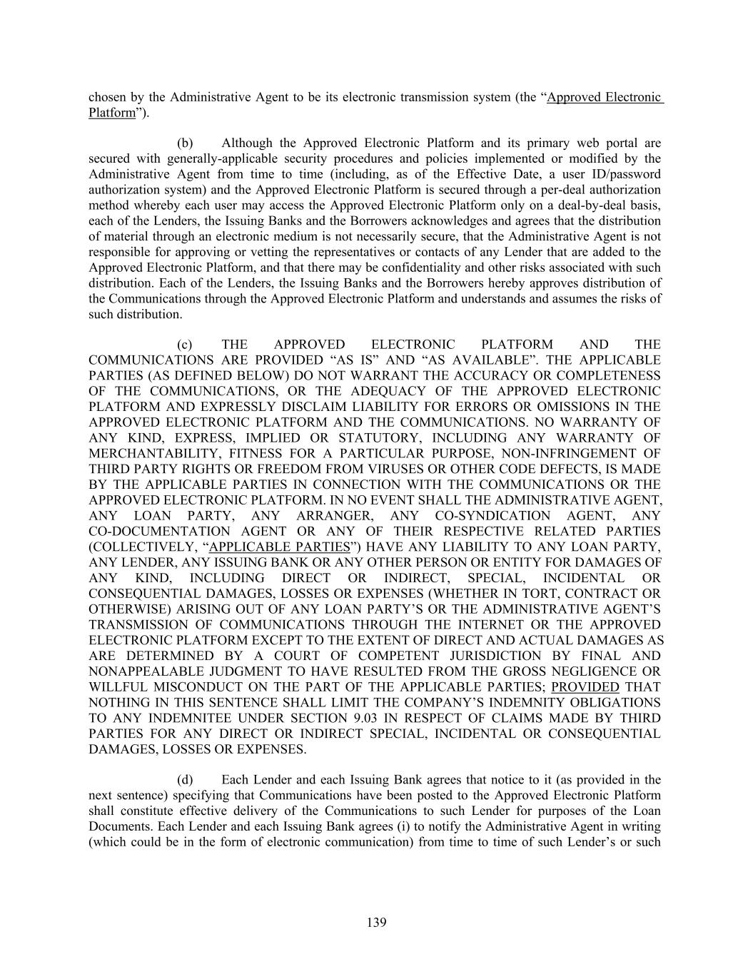 chosen by the Administrative Agent to be its electronic transmission system (the “Approved Electronic Platform”). (b) Although the Approved Electronic Platform and its primary web portal are secured with generally-applicable security procedures and policies implemented or modified by the Administrative Agent from time to time (including, as of the Effective Date, a user ID/password authorization system) and the Approved Electronic Platform is secured through a per-deal authorization method whereby each user may access the Approved Electronic Platform only on a deal-by-deal basis, each of the Lenders, the Issuing Banks and the Borrowers acknowledges and agrees that the distribution of material through an electronic medium is not necessarily secure, that the Administrative Agent is not responsible for approving or vetting the representatives or contacts of any Lender that are added to the Approved Electronic Platform, and that there may be confidentiality and other risks associated with such distribution. Each of the Lenders, the Issuing Banks and the Borrowers hereby approves distribution of the Communications through the Approved Electronic Platform and understands and assumes the risks of such distribution. (c) THE APPROVED ELECTRONIC PLATFORM AND THE COMMUNICATIONS ARE PROVIDED “AS IS” AND “AS AVAILABLE”. THE APPLICABLE PARTIES (AS DEFINED BELOW) DO NOT WARRANT THE ACCURACY OR COMPLETENESS OF THE COMMUNICATIONS, OR THE ADEQUACY OF THE APPROVED ELECTRONIC PLATFORM AND EXPRESSLY DISCLAIM LIABILITY FOR ERRORS OR OMISSIONS IN THE APPROVED ELECTRONIC PLATFORM AND THE COMMUNICATIONS. NO WARRANTY OF ANY KIND, EXPRESS, IMPLIED OR STATUTORY, INCLUDING ANY WARRANTY OF MERCHANTABILITY, FITNESS FOR A PARTICULAR PURPOSE, NON-INFRINGEMENT OF THIRD PARTY RIGHTS OR FREEDOM FROM VIRUSES OR OTHER CODE DEFECTS, IS MADE BY THE APPLICABLE PARTIES IN CONNECTION WITH THE COMMUNICATIONS OR THE APPROVED ELECTRONIC PLATFORM. IN NO EVENT SHALL THE ADMINISTRATIVE AGENT, ANY LOAN PARTY, ANY ARRANGER, ANY CO-SYNDICATION AGENT, ANY CO-DOCUMENTATION AGENT OR ANY OF THEIR RESPECTIVE RELATED PARTIES (COLLECTIVELY, “APPLICABLE PARTIES”) HAVE ANY LIABILITY TO ANY LOAN PARTY, ANY LENDER, ANY ISSUING BANK OR ANY OTHER PERSON OR ENTITY FOR DAMAGES OF ANY KIND, INCLUDING DIRECT OR INDIRECT, SPECIAL, INCIDENTAL OR CONSEQUENTIAL DAMAGES, LOSSES OR EXPENSES (WHETHER IN TORT, CONTRACT OR OTHERWISE) ARISING OUT OF ANY LOAN PARTY’S OR THE ADMINISTRATIVE AGENT’S TRANSMISSION OF COMMUNICATIONS THROUGH THE INTERNET OR THE APPROVED ELECTRONIC PLATFORM EXCEPT TO THE EXTENT OF DIRECT AND ACTUAL DAMAGES AS ARE DETERMINED BY A COURT OF COMPETENT JURISDICTION BY FINAL AND NONAPPEALABLE JUDGMENT TO HAVE RESULTED FROM THE GROSS NEGLIGENCE OR WILLFUL MISCONDUCT ON THE PART OF THE APPLICABLE PARTIES; PROVIDED THAT NOTHING IN THIS SENTENCE SHALL LIMIT THE COMPANY’S INDEMNITY OBLIGATIONS TO ANY INDEMNITEE UNDER SECTION 9.03 IN RESPECT OF CLAIMS MADE BY THIRD PARTIES FOR ANY DIRECT OR INDIRECT SPECIAL, INCIDENTAL OR CONSEQUENTIAL DAMAGES, LOSSES OR EXPENSES. (d) Each Lender and each Issuing Bank agrees that notice to it (as provided in the next sentence) specifying that Communications have been posted to the Approved Electronic Platform shall constitute effective delivery of the Communications to such Lender for purposes of the Loan Documents. Each Lender and each Issuing Bank agrees (i) to notify the Administrative Agent in writing (which could be in the form of electronic communication) from time to time of such Lender’s or such 139
