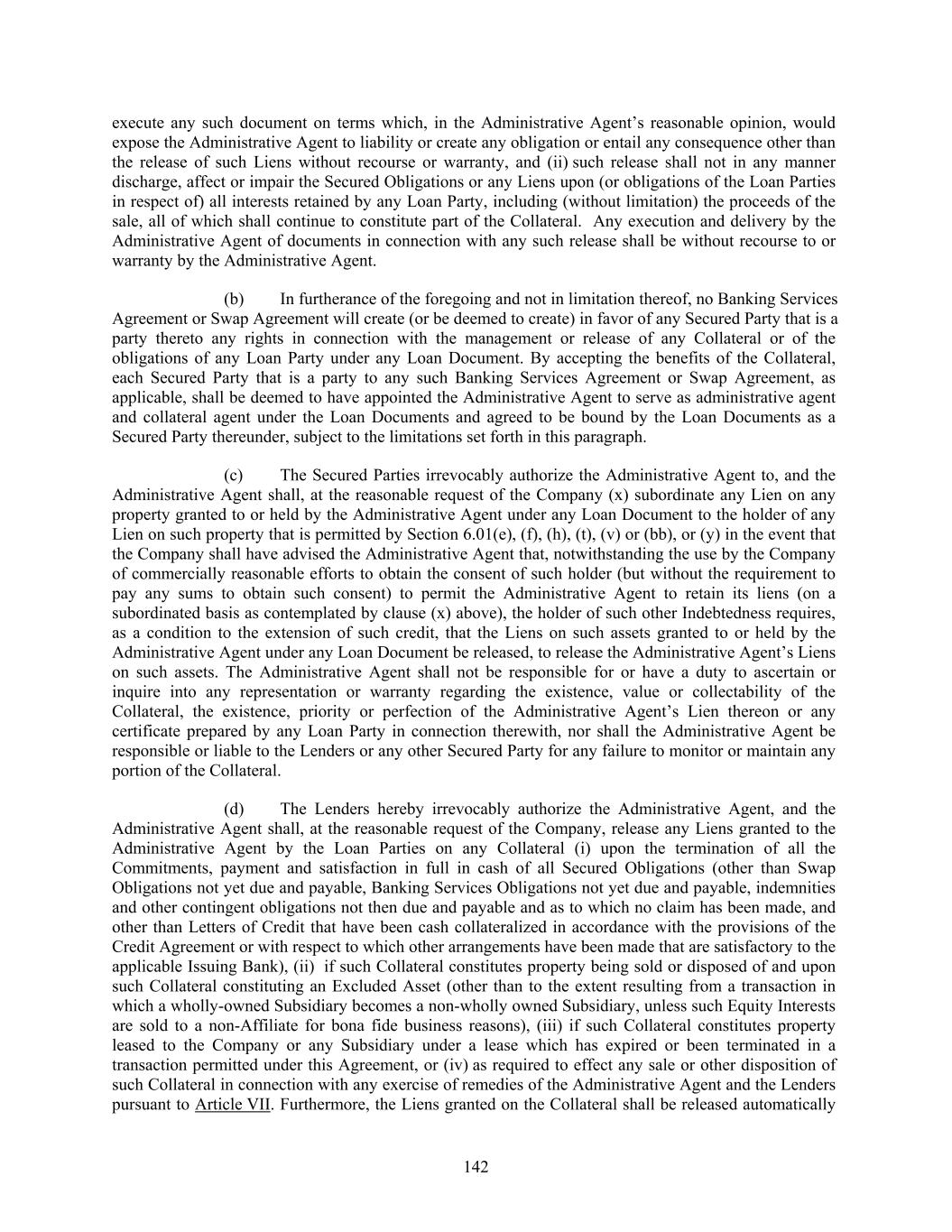 execute any such document on terms which, in the Administrative Agent’s reasonable opinion, would expose the Administrative Agent to liability or create any obligation or entail any consequence other than the release of such Liens without recourse or warranty, and (ii) such release shall not in any manner discharge, affect or impair the Secured Obligations or any Liens upon (or obligations of the Loan Parties in respect of) all interests retained by any Loan Party, including (without limitation) the proceeds of the sale, all of which shall continue to constitute part of the Collateral. Any execution and delivery by the Administrative Agent of documents in connection with any such release shall be without recourse to or warranty by the Administrative Agent. (b) In furtherance of the foregoing and not in limitation thereof, no Banking Services Agreement or Swap Agreement will create (or be deemed to create) in favor of any Secured Party that is a party thereto any rights in connection with the management or release of any Collateral or of the obligations of any Loan Party under any Loan Document. By accepting the benefits of the Collateral, each Secured Party that is a party to any such Banking Services Agreement or Swap Agreement, as applicable, shall be deemed to have appointed the Administrative Agent to serve as administrative agent and collateral agent under the Loan Documents and agreed to be bound by the Loan Documents as a Secured Party thereunder, subject to the limitations set forth in this paragraph. (c) The Secured Parties irrevocably authorize the Administrative Agent to, and the Administrative Agent shall, at the reasonable request of the Company (x) subordinate any Lien on any property granted to or held by the Administrative Agent under any Loan Document to the holder of any Lien on such property that is permitted by Section 6.01(e), (f), (h), (t), (v) or (bb), or (y) in the event that the Company shall have advised the Administrative Agent that, notwithstanding the use by the Company of commercially reasonable efforts to obtain the consent of such holder (but without the requirement to pay any sums to obtain such consent) to permit the Administrative Agent to retain its liens (on a subordinated basis as contemplated by clause (x) above), the holder of such other Indebtedness requires, as a condition to the extension of such credit, that the Liens on such assets granted to or held by the Administrative Agent under any Loan Document be released, to release the Administrative Agent’s Liens on such assets. The Administrative Agent shall not be responsible for or have a duty to ascertain or inquire into any representation or warranty regarding the existence, value or collectability of the Collateral, the existence, priority or perfection of the Administrative Agent’s Lien thereon or any certificate prepared by any Loan Party in connection therewith, nor shall the Administrative Agent be responsible or liable to the Lenders or any other Secured Party for any failure to monitor or maintain any portion of the Collateral. (d) The Lenders hereby irrevocably authorize the Administrative Agent, and the Administrative Agent shall, at the reasonable request of the Company, release any Liens granted to the Administrative Agent by the Loan Parties on any Collateral (i) upon the termination of all the Commitments, payment and satisfaction in full in cash of all Secured Obligations (other than Swap Obligations not yet due and payable, Banking Services Obligations not yet due and payable, indemnities and other contingent obligations not then due and payable and as to which no claim has been made, and other than Letters of Credit that have been cash collateralized in accordance with the provisions of the Credit Agreement or with respect to which other arrangements have been made that are satisfactory to the applicable Issuing Bank), (ii) if such Collateral constitutes property being sold or disposed of and upon such Collateral constituting an Excluded Asset (other than to the extent resulting from a transaction in which a wholly-owned Subsidiary becomes a non-wholly owned Subsidiary, unless such Equity Interests are sold to a non-Affiliate for bona fide business reasons), (iii) if such Collateral constitutes property leased to the Company or any Subsidiary under a lease which has expired or been terminated in a transaction permitted under this Agreement, or (iv) as required to effect any sale or other disposition of such Collateral in connection with any exercise of remedies of the Administrative Agent and the Lenders pursuant to Article VII. Furthermore, the Liens granted on the Collateral shall be released automatically 142