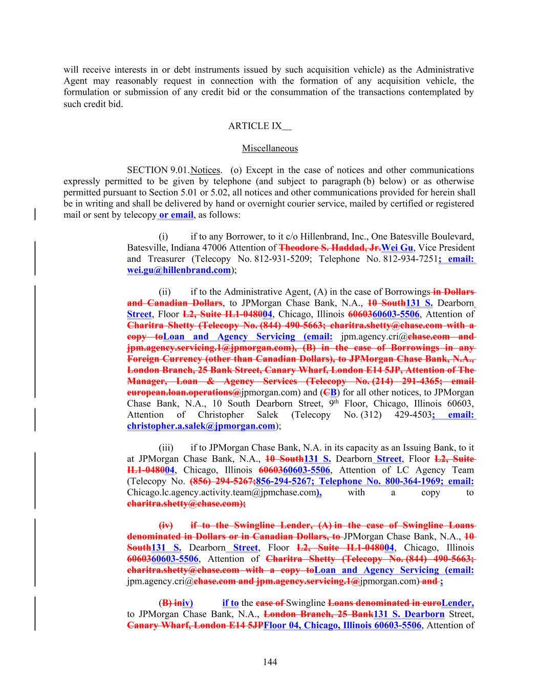 will receive interests in or debt instruments issued by such acquisition vehicle) as the Administrative Agent may reasonably request in connection with the formation of any acquisition vehicle, the formulation or submission of any credit bid or the consummation of the transactions contemplated by such credit bid. ARTICLE IX Miscellaneous SECTION 9.01.Notices. (o) Except in the case of notices and other communications expressly permitted to be given by telephone (and subject to paragraph (b) below) or as otherwise permitted pursuant to Section 5.01 or 5.02, all notices and other communications provided for herein shall be in writing and shall be delivered by hand or overnight courier service, mailed by certified or registered mail or sent by telecopy or email, as follows: (i) if to any Borrower, to it c/o Hillenbrand, Inc., One Batesville Boulevard, Batesville, Indiana 47006 Attention of Theodore S. Haddad, Jr.Wei Gu, Vice President and Treasurer (Telecopy No. 812-931-5209; Telephone No. 812-934-7251; email: wei.gu@hillenbrand.com); (ii) if to the Administrative Agent, (A) in the case of Borrowings in Dollars and Canadian Dollars, to JPMorgan Chase Bank, N.A., 10 South131 S. Dearborn Street, Floor L2, Suite IL1-048004, Chicago, Illinois 6060360603-5506, Attention of Charitra Shetty (Telecopy No. (844) 490-5663; charitra.shetty@chase.com with a copy toLoan and Agency Servicing (email: jpm.agency.cri@chase.com and jpm.agency.servicing.1@jpmorgan.com), (B) in the case of Borrowings in any Foreign Currency (other than Canadian Dollars), to JPMorgan Chase Bank, N.A., London Branch, 25 Bank Street, Canary Wharf, London E14 5JP, Attention of The Manager, Loan & Agency Services (Telecopy No. (214) 291-4365; email european.loan.operations@jpmorgan.com) and (CB) for all other notices, to JPMorgan Chase Bank, N.A., 10 South Dearborn Street, 9th Floor, Chicago, Illinois 60603, Attention of Christopher Salek (Telecopy No. (312) 429-4503; email: christopher.a.salek@jpmorgan.com); (iii) if to JPMorgan Chase Bank, N.A. in its capacity as an Issuing Bank, to it at JPMorgan Chase Bank, N.A., 10 South131 S. Dearborn Street, Floor L2, Suite IL1-048004, Chicago, Illinois 6060360603-5506, Attention of LC Agency Team (Telecopy No. (856) 294-5267;856-294-5267; Telephone No. 800-364-1969; email: Chicago.lc.agency.activity.team@jpmchase.com), with a copy to charitra.shetty@chase.com); (iv) if to the Swingline Lender, (A) in the case of Swingline Loans denominated in Dollars or in Canadian Dollars, to JPMorgan Chase Bank, N.A., 10 South131 S. Dearborn Street, Floor L2, Suite IL1-048004, Chicago, Illinois 6060360603-5506, Attention of Charitra Shetty (Telecopy No. (844) 490-5663; charitra.shetty@chase.com with a copy toLoan and Agency Servicing (email: jpm.agency.cri@chase.com and jpm.agency.servicing.1@jpmorgan.com) and ; (B) iniv) if to the case of Swingline Loans denominated in euroLender, to JPMorgan Chase Bank, N.A., London Branch, 25 Bank131 S. Dearborn Street, Canary Wharf, London E14 5JPFloor 04, Chicago, Illinois 60603-5506, Attention of 144