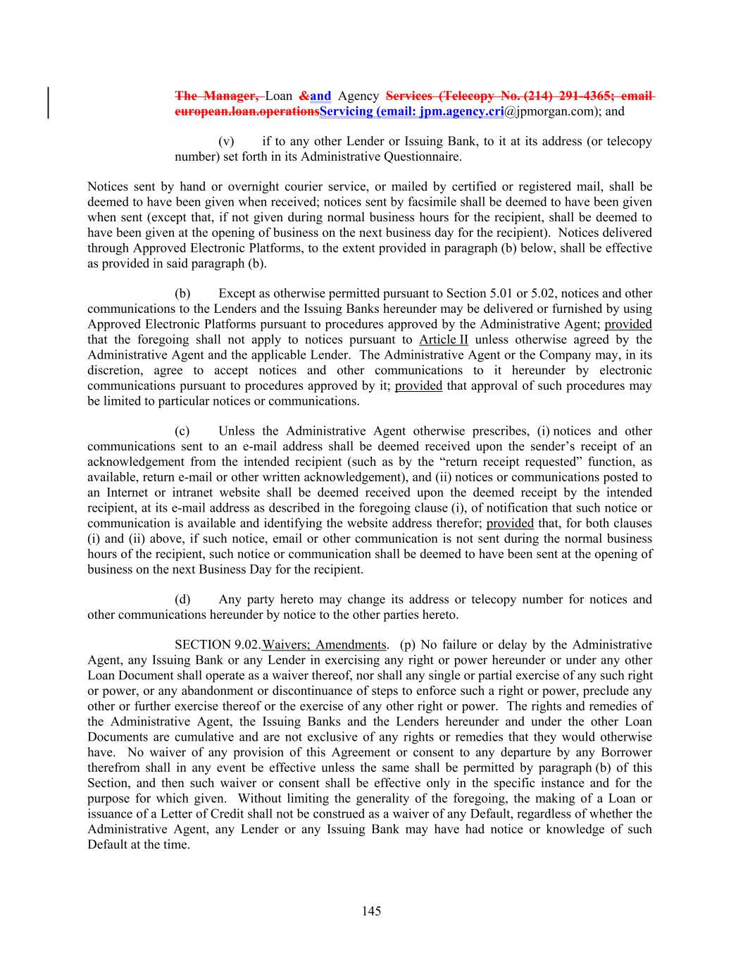 The Manager, Loan &and Agency Services (Telecopy No. (214) 291-4365; email european.loan.operationsServicing (email: jpm.agency.cri@jpmorgan.com); and (v) if to any other Lender or Issuing Bank, to it at its address (or telecopy number) set forth in its Administrative Questionnaire. Notices sent by hand or overnight courier service, or mailed by certified or registered mail, shall be deemed to have been given when received; notices sent by facsimile shall be deemed to have been given when sent (except that, if not given during normal business hours for the recipient, shall be deemed to have been given at the opening of business on the next business day for the recipient). Notices delivered through Approved Electronic Platforms, to the extent provided in paragraph (b) below, shall be effective as provided in said paragraph (b). (b) Except as otherwise permitted pursuant to Section 5.01 or 5.02, notices and other communications to the Lenders and the Issuing Banks hereunder may be delivered or furnished by using Approved Electronic Platforms pursuant to procedures approved by the Administrative Agent; provided that the foregoing shall not apply to notices pursuant to Article II unless otherwise agreed by the Administrative Agent and the applicable Lender. The Administrative Agent or the Company may, in its discretion, agree to accept notices and other communications to it hereunder by electronic communications pursuant to procedures approved by it; provided that approval of such procedures may be limited to particular notices or communications. (c) Unless the Administrative Agent otherwise prescribes, (i) notices and other communications sent to an e-mail address shall be deemed received upon the sender’s receipt of an acknowledgement from the intended recipient (such as by the “return receipt requested” function, as available, return e-mail or other written acknowledgement), and (ii) notices or communications posted to an Internet or intranet website shall be deemed received upon the deemed receipt by the intended recipient, at its e-mail address as described in the foregoing clause (i), of notification that such notice or communication is available and identifying the website address therefor; provided that, for both clauses (i) and (ii) above, if such notice, email or other communication is not sent during the normal business hours of the recipient, such notice or communication shall be deemed to have been sent at the opening of business on the next Business Day for the recipient. (d) Any party hereto may change its address or telecopy number for notices and other communications hereunder by notice to the other parties hereto. SECTION 9.02.Waivers; Amendments. (p) No failure or delay by the Administrative Agent, any Issuing Bank or any Lender in exercising any right or power hereunder or under any other Loan Document shall operate as a waiver thereof, nor shall any single or partial exercise of any such right or power, or any abandonment or discontinuance of steps to enforce such a right or power, preclude any other or further exercise thereof or the exercise of any other right or power. The rights and remedies of the Administrative Agent, the Issuing Banks and the Lenders hereunder and under the other Loan Documents are cumulative and are not exclusive of any rights or remedies that they would otherwise have. No waiver of any provision of this Agreement or consent to any departure by any Borrower therefrom shall in any event be effective unless the same shall be permitted by paragraph (b) of this Section, and then such waiver or consent shall be effective only in the specific instance and for the purpose for which given. Without limiting the generality of the foregoing, the making of a Loan or issuance of a Letter of Credit shall not be construed as a waiver of any Default, regardless of whether the Administrative Agent, any Lender or any Issuing Bank may have had notice or knowledge of such Default at the time. 145