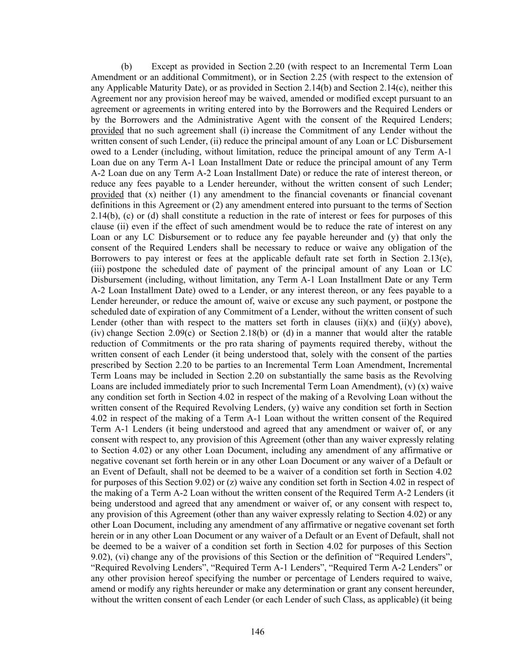(b) Except as provided in Section 2.20 (with respect to an Incremental Term Loan Amendment or an additional Commitment), or in Section 2.25 (with respect to the extension of any Applicable Maturity Date), or as provided in Section 2.14(b) and Section 2.14(c), neither this Agreement nor any provision hereof may be waived, amended or modified except pursuant to an agreement or agreements in writing entered into by the Borrowers and the Required Lenders or by the Borrowers and the Administrative Agent with the consent of the Required Lenders; provided that no such agreement shall (i) increase the Commitment of any Lender without the written consent of such Lender, (ii) reduce the principal amount of any Loan or LC Disbursement owed to a Lender (including, without limitation, reduce the principal amount of any Term A-1 Loan due on any Term A-1 Loan Installment Date or reduce the principal amount of any Term A-2 Loan due on any Term A-2 Loan Installment Date) or reduce the rate of interest thereon, or reduce any fees payable to a Lender hereunder, without the written consent of such Lender; provided that (x) neither (1) any amendment to the financial covenants or financial covenant definitions in this Agreement or (2) any amendment entered into pursuant to the terms of Section 2.14(b), (c) or (d) shall constitute a reduction in the rate of interest or fees for purposes of this clause (ii) even if the effect of such amendment would be to reduce the rate of interest on any Loan or any LC Disbursement or to reduce any fee payable hereunder and (y) that only the consent of the Required Lenders shall be necessary to reduce or waive any obligation of the Borrowers to pay interest or fees at the applicable default rate set forth in Section 2.13(e), (iii) postpone the scheduled date of payment of the principal amount of any Loan or LC Disbursement (including, without limitation, any Term A-1 Loan Installment Date or any Term A-2 Loan Installment Date) owed to a Lender, or any interest thereon, or any fees payable to a Lender hereunder, or reduce the amount of, waive or excuse any such payment, or postpone the scheduled date of expiration of any Commitment of a Lender, without the written consent of such Lender (other than with respect to the matters set forth in clauses (ii)(x) and (ii)(y) above), (iv) change Section 2.09(c) or Section 2.18(b) or (d) in a manner that would alter the ratable reduction of Commitments or the pro rata sharing of payments required thereby, without the written consent of each Lender (it being understood that, solely with the consent of the parties prescribed by Section 2.20 to be parties to an Incremental Term Loan Amendment, Incremental Term Loans may be included in Section 2.20 on substantially the same basis as the Revolving Loans are included immediately prior to such Incremental Term Loan Amendment), (v) (x) waive any condition set forth in Section 4.02 in respect of the making of a Revolving Loan without the written consent of the Required Revolving Lenders, (y) waive any condition set forth in Section 4.02 in respect of the making of a Term A-1 Loan without the written consent of the Required Term A-1 Lenders (it being understood and agreed that any amendment or waiver of, or any consent with respect to, any provision of this Agreement (other than any waiver expressly relating to Section 4.02) or any other Loan Document, including any amendment of any affirmative or negative covenant set forth herein or in any other Loan Document or any waiver of a Default or an Event of Default, shall not be deemed to be a waiver of a condition set forth in Section 4.02 for purposes of this Section 9.02) or (z) waive any condition set forth in Section 4.02 in respect of the making of a Term A-2 Loan without the written consent of the Required Term A-2 Lenders (it being understood and agreed that any amendment or waiver of, or any consent with respect to, any provision of this Agreement (other than any waiver expressly relating to Section 4.02) or any other Loan Document, including any amendment of any affirmative or negative covenant set forth herein or in any other Loan Document or any waiver of a Default or an Event of Default, shall not be deemed to be a waiver of a condition set forth in Section 4.02 for purposes of this Section 9.02), (vi) change any of the provisions of this Section or the definition of “Required Lenders”, “Required Revolving Lenders”, “Required Term A-1 Lenders”, “Required Term A-2 Lenders” or any other provision hereof specifying the number or percentage of Lenders required to waive, amend or modify any rights hereunder or make any determination or grant any consent hereunder, without the written consent of each Lender (or each Lender of such Class, as applicable) (it being 146