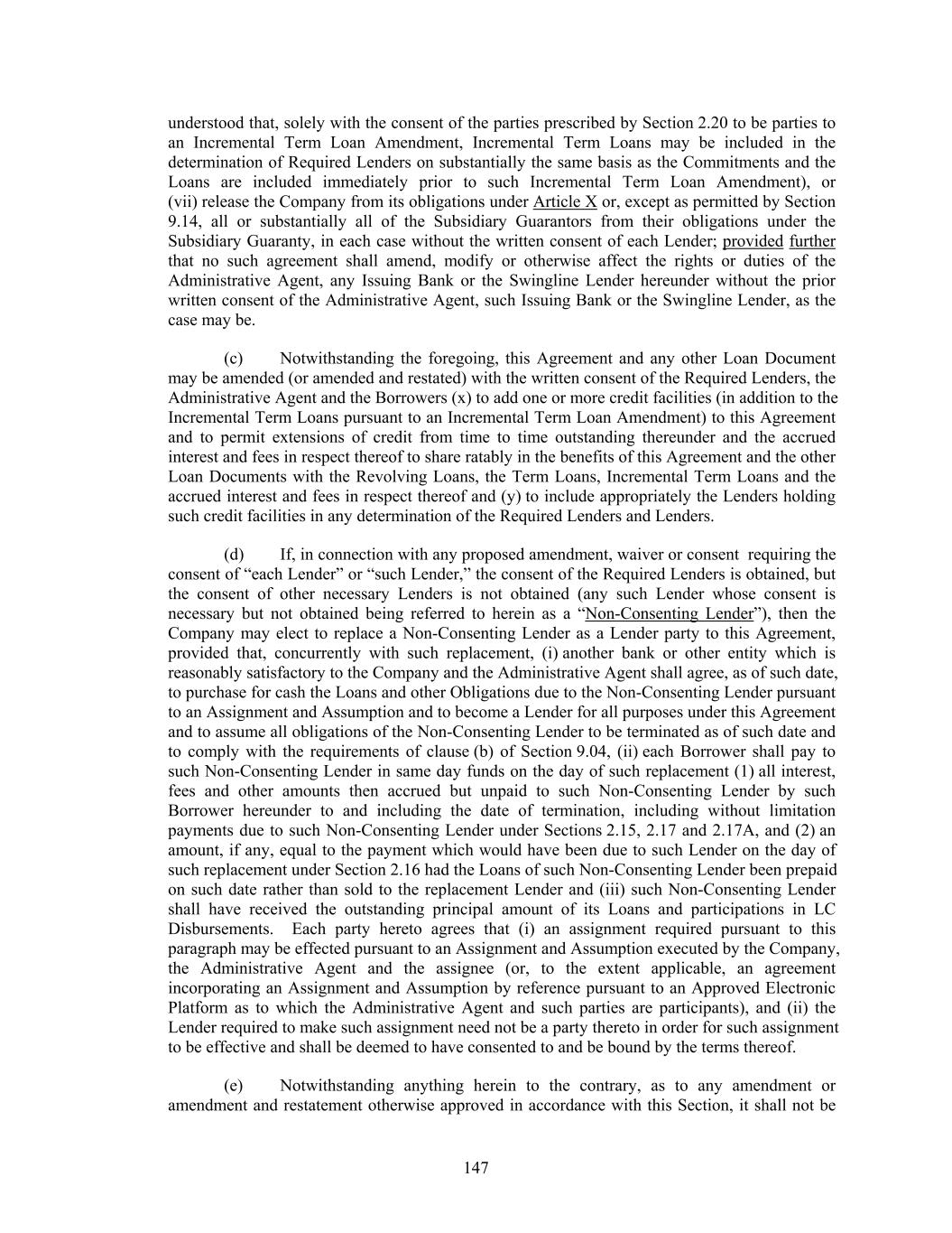 understood that, solely with the consent of the parties prescribed by Section 2.20 to be parties to an Incremental Term Loan Amendment, Incremental Term Loans may be included in the determination of Required Lenders on substantially the same basis as the Commitments and the Loans are included immediately prior to such Incremental Term Loan Amendment), or (vii) release the Company from its obligations under Article X or, except as permitted by Section 9.14, all or substantially all of the Subsidiary Guarantors from their obligations under the Subsidiary Guaranty, in each case without the written consent of each Lender; provided further that no such agreement shall amend, modify or otherwise affect the rights or duties of the Administrative Agent, any Issuing Bank or the Swingline Lender hereunder without the prior written consent of the Administrative Agent, such Issuing Bank or the Swingline Lender, as the case may be. (c) Notwithstanding the foregoing, this Agreement and any other Loan Document may be amended (or amended and restated) with the written consent of the Required Lenders, the Administrative Agent and the Borrowers (x) to add one or more credit facilities (in addition to the Incremental Term Loans pursuant to an Incremental Term Loan Amendment) to this Agreement and to permit extensions of credit from time to time outstanding thereunder and the accrued interest and fees in respect thereof to share ratably in the benefits of this Agreement and the other Loan Documents with the Revolving Loans, the Term Loans, Incremental Term Loans and the accrued interest and fees in respect thereof and (y) to include appropriately the Lenders holding such credit facilities in any determination of the Required Lenders and Lenders. (d) If, in connection with any proposed amendment, waiver or consent requiring the consent of “each Lender” or “such Lender,” the consent of the Required Lenders is obtained, but the consent of other necessary Lenders is not obtained (any such Lender whose consent is necessary but not obtained being referred to herein as a “Non-Consenting Lender”), then the Company may elect to replace a Non-Consenting Lender as a Lender party to this Agreement, provided that, concurrently with such replacement, (i) another bank or other entity which is reasonably satisfactory to the Company and the Administrative Agent shall agree, as of such date, to purchase for cash the Loans and other Obligations due to the Non-Consenting Lender pursuant to an Assignment and Assumption and to become a Lender for all purposes under this Agreement and to assume all obligations of the Non-Consenting Lender to be terminated as of such date and to comply with the requirements of clause (b) of Section 9.04, (ii) each Borrower shall pay to such Non-Consenting Lender in same day funds on the day of such replacement (1) all interest, fees and other amounts then accrued but unpaid to such Non-Consenting Lender by such Borrower hereunder to and including the date of termination, including without limitation payments due to such Non-Consenting Lender under Sections 2.15, 2.17 and 2.17A, and (2) an amount, if any, equal to the payment which would have been due to such Lender on the day of such replacement under Section 2.16 had the Loans of such Non-Consenting Lender been prepaid on such date rather than sold to the replacement Lender and (iii) such Non-Consenting Lender shall have received the outstanding principal amount of its Loans and participations in LC Disbursements. Each party hereto agrees that (i) an assignment required pursuant to this paragraph may be effected pursuant to an Assignment and Assumption executed by the Company, the Administrative Agent and the assignee (or, to the extent applicable, an agreement incorporating an Assignment and Assumption by reference pursuant to an Approved Electronic Platform as to which the Administrative Agent and such parties are participants), and (ii) the Lender required to make such assignment need not be a party thereto in order for such assignment to be effective and shall be deemed to have consented to and be bound by the terms thereof. (e) Notwithstanding anything herein to the contrary, as to any amendment or amendment and restatement otherwise approved in accordance with this Section, it shall not be 147