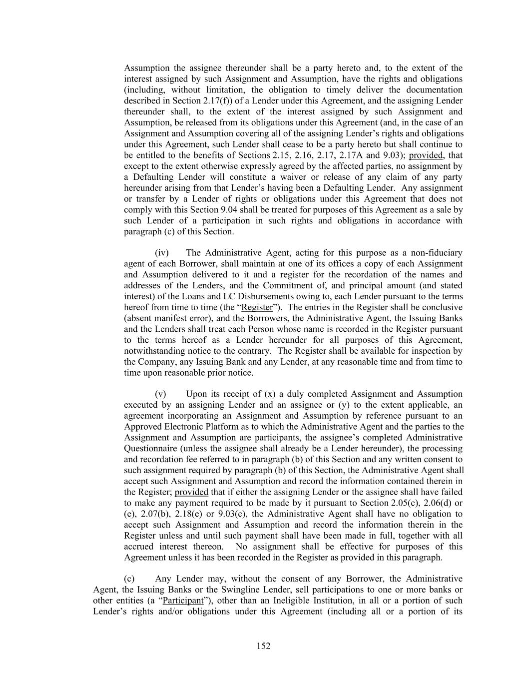 Assumption the assignee thereunder shall be a party hereto and, to the extent of the interest assigned by such Assignment and Assumption, have the rights and obligations (including, without limitation, the obligation to timely deliver the documentation described in Section 2.17(f)) of a Lender under this Agreement, and the assigning Lender thereunder shall, to the extent of the interest assigned by such Assignment and Assumption, be released from its obligations under this Agreement (and, in the case of an Assignment and Assumption covering all of the assigning Lender’s rights and obligations under this Agreement, such Lender shall cease to be a party hereto but shall continue to be entitled to the benefits of Sections 2.15, 2.16, 2.17, 2.17A and 9.03); provided, that except to the extent otherwise expressly agreed by the affected parties, no assignment by a Defaulting Lender will constitute a waiver or release of any claim of any party hereunder arising from that Lender’s having been a Defaulting Lender. Any assignment or transfer by a Lender of rights or obligations under this Agreement that does not comply with this Section 9.04 shall be treated for purposes of this Agreement as a sale by such Lender of a participation in such rights and obligations in accordance with paragraph (c) of this Section. (iv) The Administrative Agent, acting for this purpose as a non-fiduciary agent of each Borrower, shall maintain at one of its offices a copy of each Assignment and Assumption delivered to it and a register for the recordation of the names and addresses of the Lenders, and the Commitment of, and principal amount (and stated interest) of the Loans and LC Disbursements owing to, each Lender pursuant to the terms hereof from time to time (the “Register”). The entries in the Register shall be conclusive (absent manifest error), and the Borrowers, the Administrative Agent, the Issuing Banks and the Lenders shall treat each Person whose name is recorded in the Register pursuant to the terms hereof as a Lender hereunder for all purposes of this Agreement, notwithstanding notice to the contrary. The Register shall be available for inspection by the Company, any Issuing Bank and any Lender, at any reasonable time and from time to time upon reasonable prior notice. (v) Upon its receipt of (x) a duly completed Assignment and Assumption executed by an assigning Lender and an assignee or (y) to the extent applicable, an agreement incorporating an Assignment and Assumption by reference pursuant to an Approved Electronic Platform as to which the Administrative Agent and the parties to the Assignment and Assumption are participants, the assignee’s completed Administrative Questionnaire (unless the assignee shall already be a Lender hereunder), the processing and recordation fee referred to in paragraph (b) of this Section and any written consent to such assignment required by paragraph (b) of this Section, the Administrative Agent shall accept such Assignment and Assumption and record the information contained therein in the Register; provided that if either the assigning Lender or the assignee shall have failed to make any payment required to be made by it pursuant to Section 2.05(c), 2.06(d) or (e), 2.07(b), 2.18(e) or 9.03(c), the Administrative Agent shall have no obligation to accept such Assignment and Assumption and record the information therein in the Register unless and until such payment shall have been made in full, together with all accrued interest thereon. No assignment shall be effective for purposes of this Agreement unless it has been recorded in the Register as provided in this paragraph. (c) Any Lender may, without the consent of any Borrower, the Administrative Agent, the Issuing Banks or the Swingline Lender, sell participations to one or more banks or other entities (a “Participant”), other than an Ineligible Institution, in all or a portion of such Lender’s rights and/or obligations under this Agreement (including all or a portion of its 152
