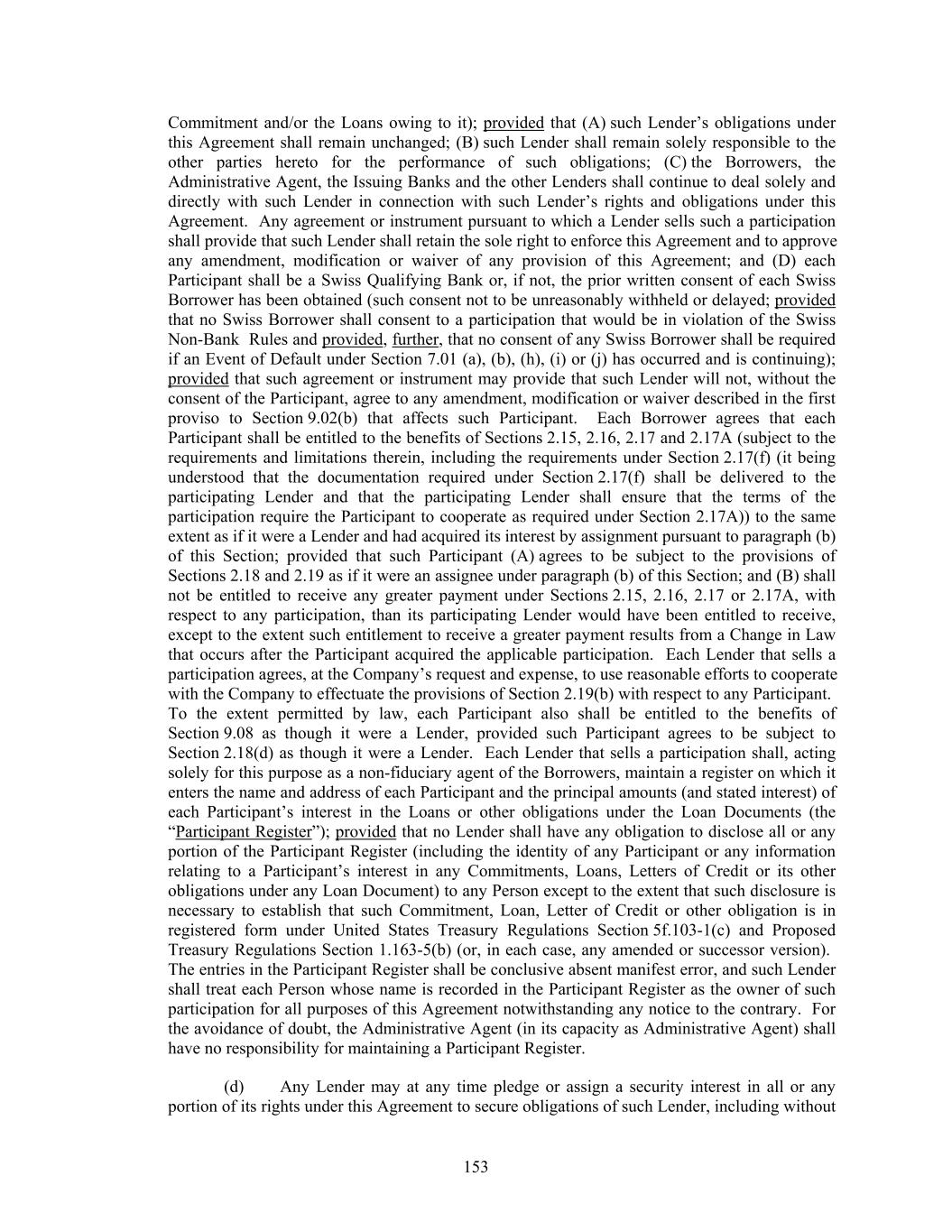 Commitment and/or the Loans owing to it); provided that (A) such Lender’s obligations under this Agreement shall remain unchanged; (B) such Lender shall remain solely responsible to the other parties hereto for the performance of such obligations; (C) the Borrowers, the Administrative Agent, the Issuing Banks and the other Lenders shall continue to deal solely and directly with such Lender in connection with such Lender’s rights and obligations under this Agreement. Any agreement or instrument pursuant to which a Lender sells such a participation shall provide that such Lender shall retain the sole right to enforce this Agreement and to approve any amendment, modification or waiver of any provision of this Agreement; and (D) each Participant shall be a Swiss Qualifying Bank or, if not, the prior written consent of each Swiss Borrower has been obtained (such consent not to be unreasonably withheld or delayed; provided that no Swiss Borrower shall consent to a participation that would be in violation of the Swiss Non-Bank Rules and provided, further, that no consent of any Swiss Borrower shall be required if an Event of Default under Section 7.01 (a), (b), (h), (i) or (j) has occurred and is continuing); provided that such agreement or instrument may provide that such Lender will not, without the consent of the Participant, agree to any amendment, modification or waiver described in the first proviso to Section 9.02(b) that affects such Participant. Each Borrower agrees that each Participant shall be entitled to the benefits of Sections 2.15, 2.16, 2.17 and 2.17A (subject to the requirements and limitations therein, including the requirements under Section 2.17(f) (it being understood that the documentation required under Section 2.17(f) shall be delivered to the participating Lender and that the participating Lender shall ensure that the terms of the participation require the Participant to cooperate as required under Section 2.17A)) to the same extent as if it were a Lender and had acquired its interest by assignment pursuant to paragraph (b) of this Section; provided that such Participant (A) agrees to be subject to the provisions of Sections 2.18 and 2.19 as if it were an assignee under paragraph (b) of this Section; and (B) shall not be entitled to receive any greater payment under Sections 2.15, 2.16, 2.17 or 2.17A, with respect to any participation, than its participating Lender would have been entitled to receive, except to the extent such entitlement to receive a greater payment results from a Change in Law that occurs after the Participant acquired the applicable participation. Each Lender that sells a participation agrees, at the Company’s request and expense, to use reasonable efforts to cooperate with the Company to effectuate the provisions of Section 2.19(b) with respect to any Participant. To the extent permitted by law, each Participant also shall be entitled to the benefits of Section 9.08 as though it were a Lender, provided such Participant agrees to be subject to Section 2.18(d) as though it were a Lender. Each Lender that sells a participation shall, acting solely for this purpose as a non-fiduciary agent of the Borrowers, maintain a register on which it enters the name and address of each Participant and the principal amounts (and stated interest) of each Participant’s interest in the Loans or other obligations under the Loan Documents (the “Participant Register”); provided that no Lender shall have any obligation to disclose all or any portion of the Participant Register (including the identity of any Participant or any information relating to a Participant’s interest in any Commitments, Loans, Letters of Credit or its other obligations under any Loan Document) to any Person except to the extent that such disclosure is necessary to establish that such Commitment, Loan, Letter of Credit or other obligation is in registered form under United States Treasury Regulations Section 5f.103-1(c) and Proposed Treasury Regulations Section 1.163-5(b) (or, in each case, any amended or successor version). The entries in the Participant Register shall be conclusive absent manifest error, and such Lender shall treat each Person whose name is recorded in the Participant Register as the owner of such participation for all purposes of this Agreement notwithstanding any notice to the contrary. For the avoidance of doubt, the Administrative Agent (in its capacity as Administrative Agent) shall have no responsibility for maintaining a Participant Register. (d) Any Lender may at any time pledge or assign a security interest in all or any portion of its rights under this Agreement to secure obligations of such Lender, including without 153