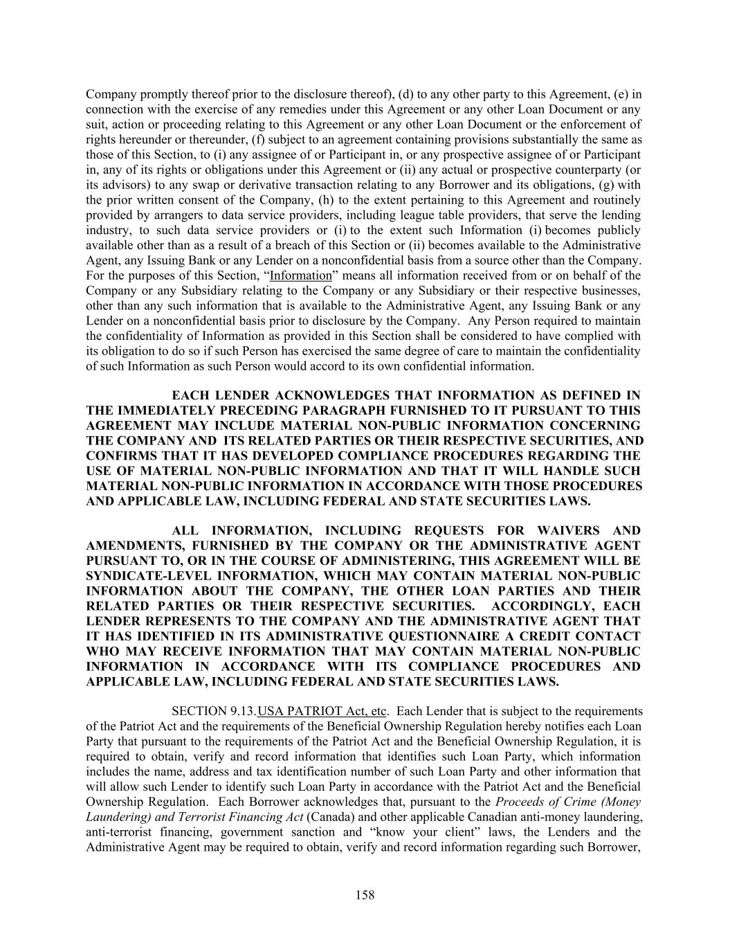 Company promptly thereof prior to the disclosure thereof), (d) to any other party to this Agreement, (e) in connection with the exercise of any remedies under this Agreement or any other Loan Document or any suit, action or proceeding relating to this Agreement or any other Loan Document or the enforcement of rights hereunder or thereunder, (f) subject to an agreement containing provisions substantially the same as those of this Section, to (i) any assignee of or Participant in, or any prospective assignee of or Participant in, any of its rights or obligations under this Agreement or (ii) any actual or prospective counterparty (or its advisors) to any swap or derivative transaction relating to any Borrower and its obligations, (g) with the prior written consent of the Company, (h) to the extent pertaining to this Agreement and routinely provided by arrangers to data service providers, including league table providers, that serve the lending industry, to such data service providers or (i) to the extent such Information (i) becomes publicly available other than as a result of a breach of this Section or (ii) becomes available to the Administrative Agent, any Issuing Bank or any Lender on a nonconfidential basis from a source other than the Company. For the purposes of this Section, “Information” means all information received from or on behalf of the Company or any Subsidiary relating to the Company or any Subsidiary or their respective businesses, other than any such information that is available to the Administrative Agent, any Issuing Bank or any Lender on a nonconfidential basis prior to disclosure by the Company. Any Person required to maintain the confidentiality of Information as provided in this Section shall be considered to have complied with its obligation to do so if such Person has exercised the same degree of care to maintain the confidentiality of such Information as such Person would accord to its own confidential information. EACH LENDER ACKNOWLEDGES THAT INFORMATION AS DEFINED IN THE IMMEDIATELY PRECEDING PARAGRAPH FURNISHED TO IT PURSUANT TO THIS AGREEMENT MAY INCLUDE MATERIAL NON-PUBLIC INFORMATION CONCERNING THE COMPANY AND ITS RELATED PARTIES OR THEIR RESPECTIVE SECURITIES, AND CONFIRMS THAT IT HAS DEVELOPED COMPLIANCE PROCEDURES REGARDING THE USE OF MATERIAL NON-PUBLIC INFORMATION AND THAT IT WILL HANDLE SUCH MATERIAL NON-PUBLIC INFORMATION IN ACCORDANCE WITH THOSE PROCEDURES AND APPLICABLE LAW, INCLUDING FEDERAL AND STATE SECURITIES LAWS. ALL INFORMATION, INCLUDING REQUESTS FOR WAIVERS AND AMENDMENTS, FURNISHED BY THE COMPANY OR THE ADMINISTRATIVE AGENT PURSUANT TO, OR IN THE COURSE OF ADMINISTERING, THIS AGREEMENT WILL BE SYNDICATE-LEVEL INFORMATION, WHICH MAY CONTAIN MATERIAL NON-PUBLIC INFORMATION ABOUT THE COMPANY, THE OTHER LOAN PARTIES AND THEIR RELATED PARTIES OR THEIR RESPECTIVE SECURITIES. ACCORDINGLY, EACH LENDER REPRESENTS TO THE COMPANY AND THE ADMINISTRATIVE AGENT THAT IT HAS IDENTIFIED IN ITS ADMINISTRATIVE QUESTIONNAIRE A CREDIT CONTACT WHO MAY RECEIVE INFORMATION THAT MAY CONTAIN MATERIAL NON-PUBLIC INFORMATION IN ACCORDANCE WITH ITS COMPLIANCE PROCEDURES AND APPLICABLE LAW, INCLUDING FEDERAL AND STATE SECURITIES LAWS. SECTION 9.13.USA PATRIOT Act, etc. Each Lender that is subject to the requirements of the Patriot Act and the requirements of the Beneficial Ownership Regulation hereby notifies each Loan Party that pursuant to the requirements of the Patriot Act and the Beneficial Ownership Regulation, it is required to obtain, verify and record information that identifies such Loan Party, which information includes the name, address and tax identification number of such Loan Party and other information that will allow such Lender to identify such Loan Party in accordance with the Patriot Act and the Beneficial Ownership Regulation. Each Borrower acknowledges that, pursuant to the Proceeds of Crime (Money Laundering) and Terrorist Financing Act (Canada) and other applicable Canadian anti-money laundering, anti-terrorist financing, government sanction and “know your client” laws, the Lenders and the Administrative Agent may be required to obtain, verify and record information regarding such Borrower, 158