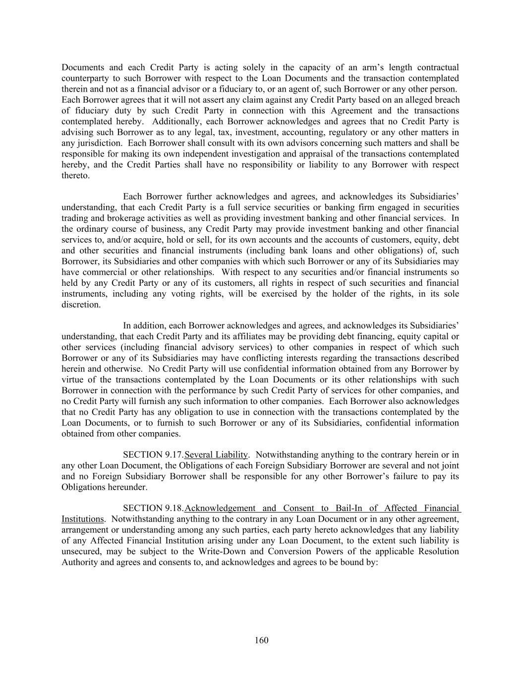 Documents and each Credit Party is acting solely in the capacity of an arm’s length contractual counterparty to such Borrower with respect to the Loan Documents and the transaction contemplated therein and not as a financial advisor or a fiduciary to, or an agent of, such Borrower or any other person. Each Borrower agrees that it will not assert any claim against any Credit Party based on an alleged breach of fiduciary duty by such Credit Party in connection with this Agreement and the transactions contemplated hereby. Additionally, each Borrower acknowledges and agrees that no Credit Party is advising such Borrower as to any legal, tax, investment, accounting, regulatory or any other matters in any jurisdiction. Each Borrower shall consult with its own advisors concerning such matters and shall be responsible for making its own independent investigation and appraisal of the transactions contemplated hereby, and the Credit Parties shall have no responsibility or liability to any Borrower with respect thereto. Each Borrower further acknowledges and agrees, and acknowledges its Subsidiaries’ understanding, that each Credit Party is a full service securities or banking firm engaged in securities trading and brokerage activities as well as providing investment banking and other financial services. In the ordinary course of business, any Credit Party may provide investment banking and other financial services to, and/or acquire, hold or sell, for its own accounts and the accounts of customers, equity, debt and other securities and financial instruments (including bank loans and other obligations) of, such Borrower, its Subsidiaries and other companies with which such Borrower or any of its Subsidiaries may have commercial or other relationships. With respect to any securities and/or financial instruments so held by any Credit Party or any of its customers, all rights in respect of such securities and financial instruments, including any voting rights, will be exercised by the holder of the rights, in its sole discretion. In addition, each Borrower acknowledges and agrees, and acknowledges its Subsidiaries’ understanding, that each Credit Party and its affiliates may be providing debt financing, equity capital or other services (including financial advisory services) to other companies in respect of which such Borrower or any of its Subsidiaries may have conflicting interests regarding the transactions described herein and otherwise. No Credit Party will use confidential information obtained from any Borrower by virtue of the transactions contemplated by the Loan Documents or its other relationships with such Borrower in connection with the performance by such Credit Party of services for other companies, and no Credit Party will furnish any such information to other companies. Each Borrower also acknowledges that no Credit Party has any obligation to use in connection with the transactions contemplated by the Loan Documents, or to furnish to such Borrower or any of its Subsidiaries, confidential information obtained from other companies. SECTION 9.17.Several Liability. Notwithstanding anything to the contrary herein or in any other Loan Document, the Obligations of each Foreign Subsidiary Borrower are several and not joint and no Foreign Subsidiary Borrower shall be responsible for any other Borrower’s failure to pay its Obligations hereunder. SECTION 9.18.Acknowledgement and Consent to Bail-In of Affected Financial Institutions. Notwithstanding anything to the contrary in any Loan Document or in any other agreement, arrangement or understanding among any such parties, each party hereto acknowledges that any liability of any Affected Financial Institution arising under any Loan Document, to the extent such liability is unsecured, may be subject to the Write-Down and Conversion Powers of the applicable Resolution Authority and agrees and consents to, and acknowledges and agrees to be bound by: 160