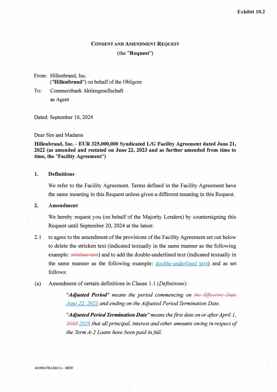 US-DOCS\153620788.4 EXECUTION COPY AMENDMENT NO. 4 Dated as of September 23, 2024 to FOURTH AMENDED AND RESTATED CREDIT AGREEMENT Dated as of June 8, 2022 THIS AMENDMENT NO. 4 (this “Amendment”) is made as of September 23, 2024 (the “Effective Date”), by and among (i) Hillenbrand, Inc., an Indiana corporation (the “Company”), (ii) the parties identified as Subsidiary Borrowers on the signature pages hereof (each a “Subsidiary Borrower” and, collectively with the Company, the “Borrowers”), (iii) the Lenders party hereto (the “Lenders”) and (iv) JPMorgan Chase Bank, N.A., as Administrative Agent (the “Administrative Agent”), to that certain Fourth Amended and Restated Credit Agreement, dated as of June 8, 2022, by and among the Borrowers, the Lenders and the Administrative Agent (as amended, restated, supplemented or otherwise modified prior to the date hereof, the “Credit Agreement”). Capitalized terms used herein and not otherwise defined herein shall have the respective meanings given to them in the Amended Credit Agreement (as defined below). WHEREAS, the Borrowers have requested that the requisite Lenders make certain modifications to the Credit Agreement; WHEREAS, the Borrowers, the Lenders party hereto and the Administrative Agent have agreed to amend the Credit Agreement on the terms and conditions set forth herein; NOW, THEREFORE, in consideration of the premises set forth above, the terms and conditions contained herein, and other good and valuable consideration, the receipt and sufficiency of which are hereby acknowledged, the Borrowers, the Lenders party hereto and the Administrative Agent hereby agree to enter into this Amendment. 1. Amendments to Credit Agreement. Effective as of the date of satisfaction of the conditions precedent set forth in Section 2 below: (a) The parties hereto agree that the Credit Agreement shall be amended to delete the stricken text (indicated textually in the same manner as the following example: stricken text) and to add the double-underlined text (indicated textually in the same manner as the following example: double- underlined text) as set forth in the pages of the Credit Agreement attached as Annex A hereto (the Credit Agreement as so amended, the “Amended Credit Agreement”). 2. Conditions of Effectiveness. The effectiveness of this Amendment is subject to the conditions precedent that: (a) The Administrative Agent shall have received counterparts of this Amendment duly executed by the Borrowers, the Required Lenders and the Administrative Agent. (b) The Administrative Agent shall have received counterparts of the Consent and Reaffirmation attached as Exhibit A hereto duly executed by the Subsidiary Guarantors. Exhibit 10.1