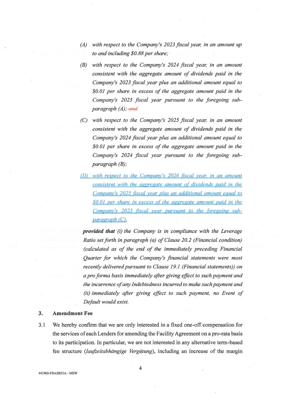 have executed and delivered to the Administrative Agent a confirmation to that effect reasonably satisfactory to the Administrative Agent); and (d) the Company may Dispose of its Treasury Stock. SECTION 6.05.Restricted Payments. The Company will not, and will not permit any of its Subsidiaries to, declare or make, directly or indirectly, any Restricted Payment, or incur any obligation (contingent or otherwise) to do so, except that: (a) each Subsidiary may make Restricted Payments to the Company and to other Subsidiaries (and, in the case of a Restricted Payment by a non-wholly-owned Subsidiary, such Restricted Payment may be made to each other owner of capital stock or other equity interests of such Subsidiary on a pro rata basis based on their relative ownership interests); (b) the Company and each Subsidiary may declare and make dividend payments or other distributions payable solely in the common stock or other common equity interests of such Person; (c) the Company and each Subsidiary may purchase, redeem or otherwise acquire shares of its common stock or other common equity interests or warrants or options to acquire any such shares with the proceeds received from the substantially concurrent issue of new shares of its common stock or other common equity interests; (d) the Company and each Subsidiary may (i) make distributions to or payments on behalf of current and former employees, officers, or directors of the Company and its Subsidiaries (or any spouses, ex-spouses, trusts or estates of any of the foregoing) on account of exercises, purchases, redemptions or other acquisitions of Equity Interests of the Company or its Subsidiaries held by such Persons (including to pay for the taxes payable by such Persons in connection with a grant or award of Equity Interests of the Company or its Subsidiaries or upon the vesting thereof) and (ii) repurchase Equity Interests issued to current or former employees, officers, directors or managers upon death, disability or termination of employment of such person or pursuant to the terms of any subscription, stockholder or other agreement or plan approved by Company’s or such Subsidiary's board of directors (or any committee thereof); (e) solely during the Adjusted Period, the Company may declare and pay during each of the Company’s 2023 fiscal year, 2024 fiscal year and, 2025 fiscal year and 2026 fiscal year, its regularly scheduled cash dividends to its stockholders (xw) with respect to the Company’s 2023 fiscal year, in an amount up to and including $0.88 per share, (yx) with respect to the Company’s 2024 fiscal year, in an amount consistent with the aggregate amount of dividends paid in the Company’s 2023 fiscal year plus an additional amount equal to $0.01 per share in excess of the aggregate amount paid in the Company’s 2023 fiscal year pursuant to the foregoing clause (xw) and, (zy) with respect to the Company’s 2025 fiscal year, in an amount consistent with the aggregate amount of dividends paid in the Company’s 2024 fiscal year plus an additional amount equal to $0.01 per share in excess of the aggregate amount paid in the Company’s 2024 fiscal year pursuant to the foregoing clause (x) and (z) with respect to the Company’s 2026 fiscal year, in an amount consistent with the aggregate amount of dividends paid in the Company’s 2025 fiscal year plus an additional amount equal to $0.01 per share in excess of the aggregate amount paid in the Company’s 2025 fiscal year pursuant to the foregoing clause (y); provided that (i) the Company is in compliance with the Leverage Ratio set forth in Section 6.10(a) (calculated as of the end of the immediately preceding fiscal quarter for which the Company’s financial statements were most recently delivered 123