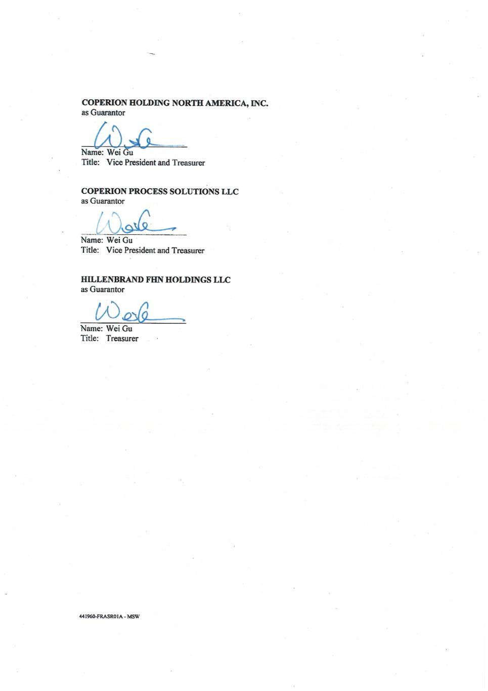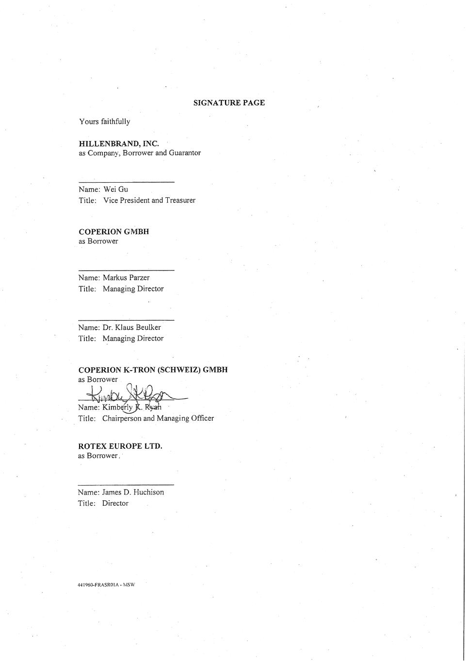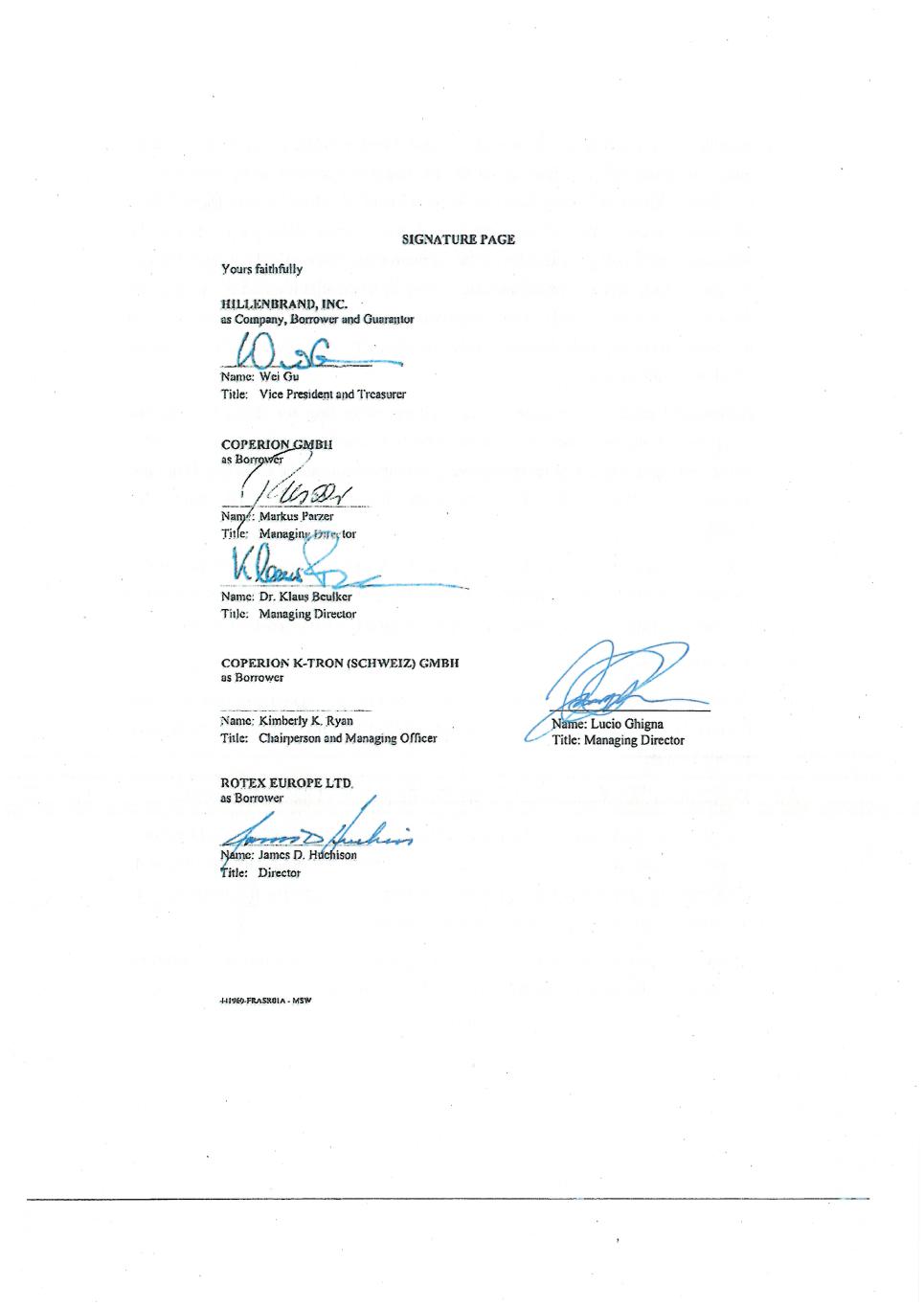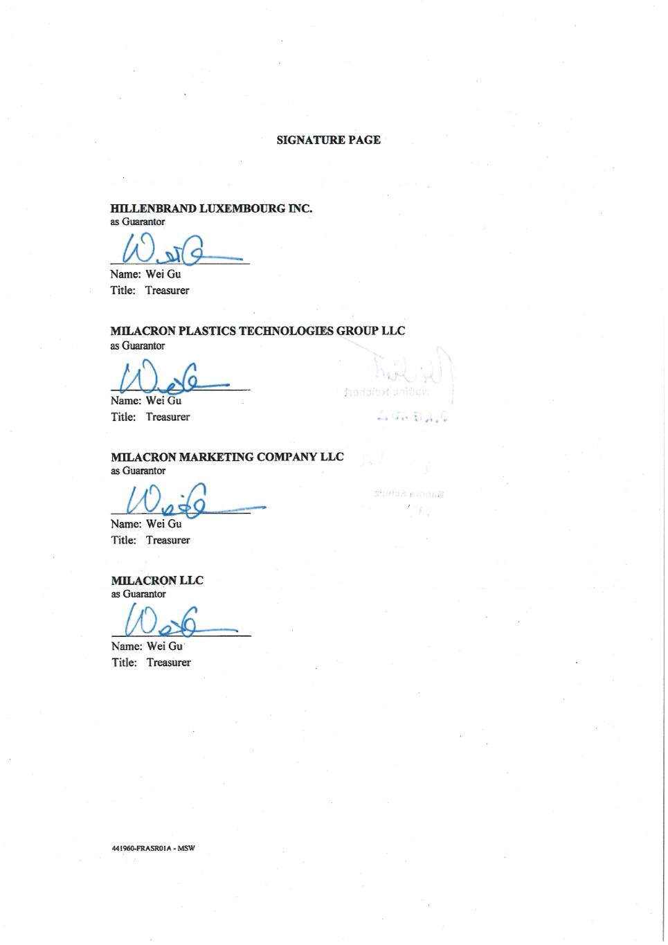 Signature Page to Consent and Reaffirmation to Amendment No. 4 to Fourth Amended and Restated Credit Agreement (Hillenbrand, Inc., et al.) IN WITNESS WHEREOF, this Consent and Reaffirmation has been duly executed and delivered as of the day and year above written. MILACRON PLASTICS TECHNOLOGIES GROUP LLC By:________________________________ Name: Wei Gu Title: Treasurer MILACRON MARKETING COMPANY LLC By:________________________________ Name: Wei Gu Title: Treasurer MILACRON LLC By:________________________________ Name: Wei Gu Title: Treasurer HILLENBRAND LUXEMBOURG INC. By:________________________________ Name: Wei Gu Title: Treasurer HILLENBRAND FHN HOLDINGS LLC By:________________________________ Name: Wei Gu Title: Treasurer COPERION PROCESS SOLUTIONS LLC By:________________________________ Name: Wei Gu Title: Vice President and Treasurer COPERION HOLDING NORTH AMERICA, INC. By:________________________________ Name: Wei Gu Title: Vice President and Treasurer