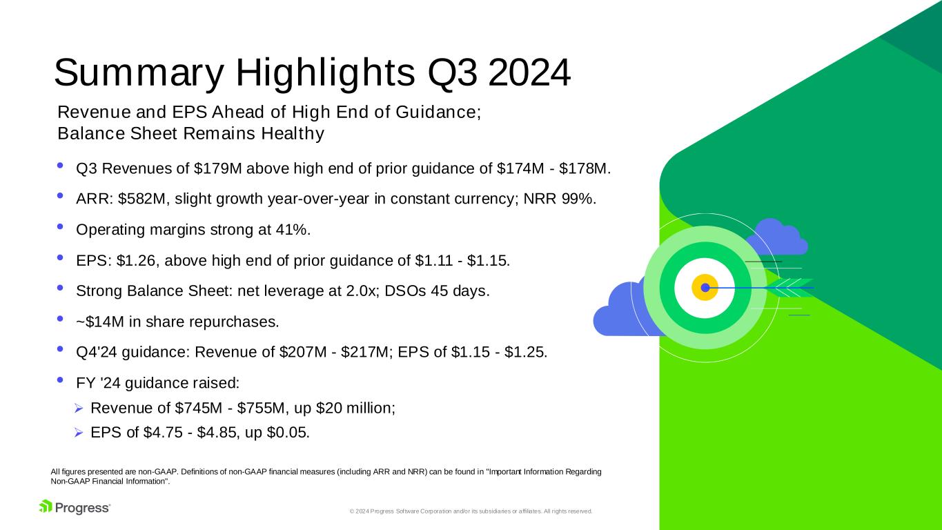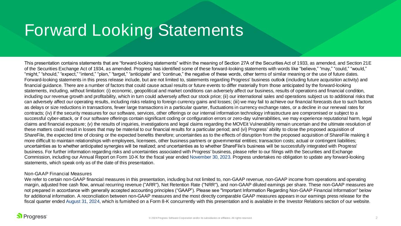 2© 2024 Progress Software Corporation and/or its subsidiaries or affiliates. All rights reserved. Forward Looking Statements This presentation contains statements that are “forward-looking statements” within the meaning of Section 27A of the Securities Act of 1933, as amended, and Section 21E of the Securities Exchange Act of 1934, as amended. Progress has identified some of these forward-looking statements with words like “believe,” “may,” “could,” “would,” “might,” “should,” “expect,” “intend,” “plan,” “target,” “anticipate” and “continue,” the negative of these words, other terms of similar meaning or the use of future dates. Forward-looking statements in this press release include, but are not limited to, statements regarding Progress' business outlook (including future acquisition activity) and financial guidance. There are a number of factors that could cause actual results or future events to differ materially from those anticipated by the forward-looking statements, including, without limitation: (i) economic, geopolitical and market conditions can adversely affect our business, results of operations and financial condition, including our revenue growth and profitability, which in turn could adversely affect our stock price; (ii) our international sales and operations subject us to additional risks that can adversely affect our operating results, including risks relating to foreign currency gains and losses; (iii) we may fail to achieve our financial forecasts due to such factors as delays or size reductions in transactions, fewer large transactions in a particular quarter, fluctuations in currency exchange rates, or a decline in our renewal rates for contracts; (iv) if the security measures for our software, services, other offerings or our internal information technology infrastructure are compromised or subject to a successful cyber-attack, or if our software offerings contain significant coding or configuration errors or zero-day vulnerabilities, we may experience reputational harm, legal claims and financial exposure; (v) the results of inquiries, investigations and legal claims regarding the MOVEit Vulnerability remain uncertain and the ultimate resolution of these matters could result in losses that may be material to our financial results for a particular period; and (vi) Progress’ ability to close the proposed acquisition of ShareFile, the expected time of closing or the expected benefits therefore; uncertainties as to the effects of disruption from the proposed acquisition of ShareFile making it more difficult to maintain relationships with employees, licensees, other business partners or governmental entities; transaction costs; actual or contingent liabilities; uncertainties as to whether anticipated synergies will be realized; and uncertainties as to whether ShareFile’s business will be successfully integrated with Progress' business. For further information regarding risks and uncertainties associated with Progress' business, please refer to our filings with the Securities and Exchange Commission, including our Annual Report on Form 10-K for the fiscal year ended November 30, 2023. Progress undertakes no obligation to update any forward-looking statements, which speak only as of the date of this presentation. Non-GAAP Financial Measures We refer to certain non-GAAP financial measures in this presentation, including but not limited to, non-GAAP revenue, non-GAAP income from operations and operating margin, adjusted free cash flow, annual recurring revenue ("ARR"), Net Retention Rate ("NRR"), and non-GAAP diluted earnings per share. These non-GAAP measures are not prepared in accordance with generally accepted accounting principles (“GAAP”). Please see "Important Information Regarding Non-GAAP Financial Information" below for additional information. A reconciliation between non-GAAP measures and the most directly comparable GAAP measures appears in our earnings press release for the fiscal quarter ended August 31, 2024, which is furnished on a Form 8-K concurrently with this presentation and is available in the Investor Relations section of our website.