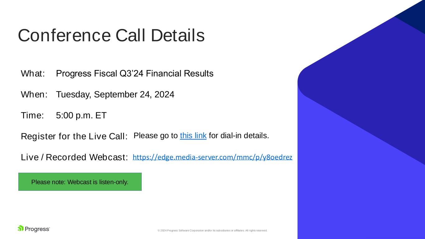 3© 2024 Progress Software Corporation and/or its subsidiaries or affiliates. All rights reserved. Conference Call Details Please note: Webcast is listen-only. What: When: Time: Register for the Live Call: Live / Recorded Webcast: Progress Fiscal Q3’24 Financial Results Tuesday, September 24, 2024 5:00 p.m. ET Please go to this link for dial-in details. https://edge.media-server.com/mmc/p/y8oedrez